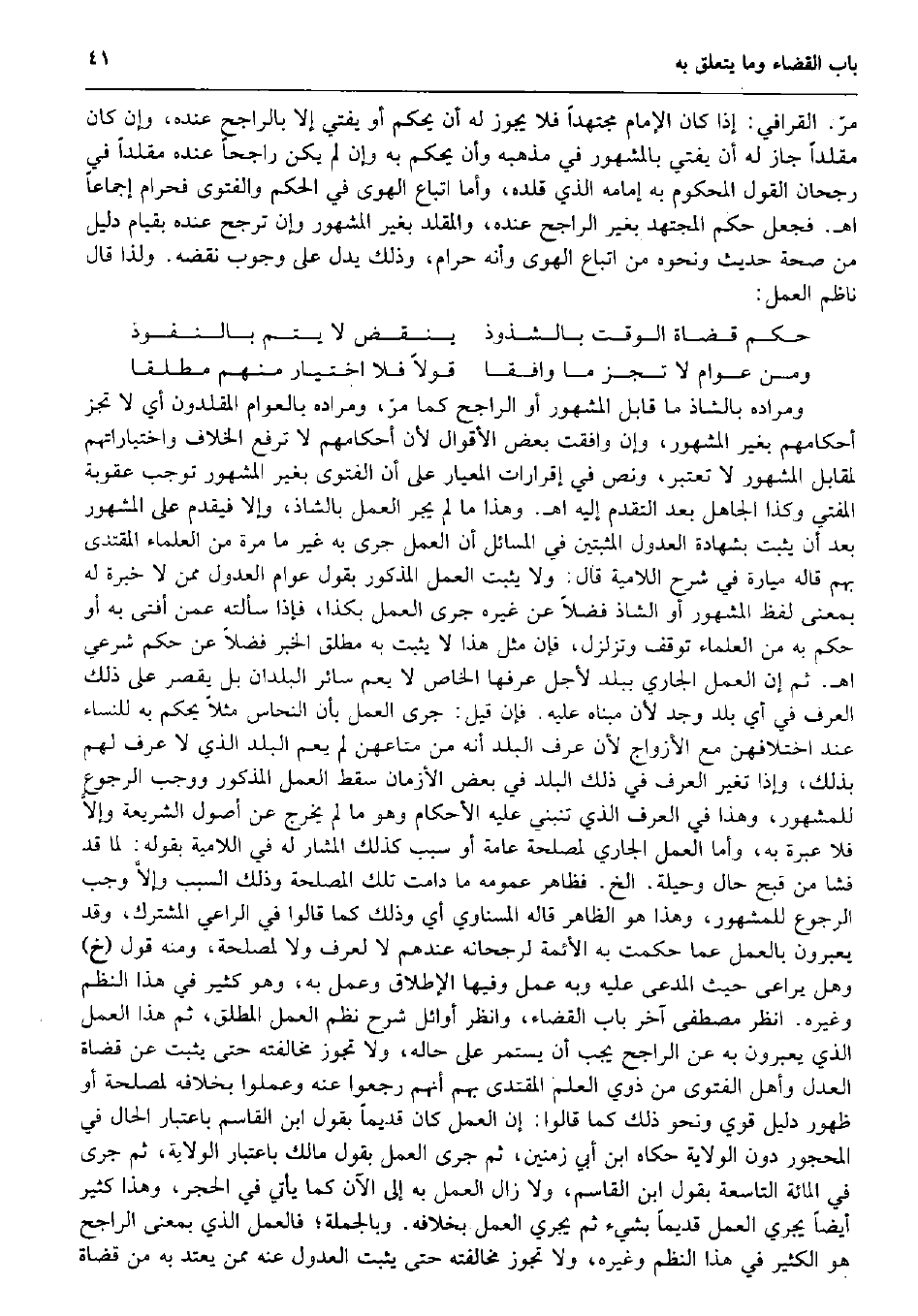 مرّ. الْقَرَافِيّ: إِذا كَانَ الإِمَام مُجْتَهدا فَلَا يجوز لَهُ أَن يحكم أَو يُفْتِي إِلَّا بالراجح عِنْده، وَإِن كَانَ مُقَلدًا جَازَ لَهُ أَن يُفْتِي بالمشهور فِي مذْهبه وَأَن يحكم بِهِ وَإِن لم يكن راجحاً عِنْده مُقَلدًا فِي رُجْحَان القَوْل الْمَحْكُوم بِهِ إِمَامه الَّذِي قَلّدهُ، وَأما اتِّبَاع الْهوى فِي الحكم وَالْفَتْوَى فَحَرَام إِجْمَاعًا اه. فَجعل حكم الْمُجْتَهد بِغَيْر الرَّاجِح عِنْده، والمقلد بِغَيْر الْمَشْهُور وَإِن ترجح عِنْده بِقِيَام دَلِيل من صِحَة حَدِيث وَنَحْوه من اتِّبَاع الْهوى وَأَنه حرَام، وَذَلِكَ يدل على وجوب نقضه. وَلذَا قَالَ ناظم الْعَمَل: حكم قُضَاة الْوَقْت بالشذوذ ينْقض لَا يتم بالنفوذ وَمن عوام لَا تجز مَا وافقا قولا فَلَا اخْتِيَار مِنْهُم مُطلقًا وَمرَاده بالشاذ مَا قَابل الْمَشْهُور أَو الرَّاجِح كَمَا مرّ وَمرَاده بالعوام المقلدون أَي لَا تجز أحكامهم بِغَيْر الْمَشْهُور، وَإِن وَافَقت بعض الْأَقْوَال لِأَن أحكامهم لَا ترفع الْخلاف واختياراتهم لمقابل الْمَشْهُور لَا تعْتَبر، وَنَصّ فِي إقرارات المعيار على أَن الْفَتْوَى بِغَيْر الْمَشْهُور توجب عُقُوبَة الْمُفْتِي وَكَذَا الْجَاهِل بعد التَّقَدُّم إِلَيْهِ اه. وَهَذَا مَا لم يجر الْعَمَل بالشاذ، وَإِلَّا فَيقدم على الْمَشْهُور بعد أَن يثبت بِشَهَادَة الْعُدُول المثبتين فِي الْمسَائِل أَن الْعَمَل جرى بِهِ غير مَا مرّة من الْعلمَاء المقتدى بهم قَالَه ميارة فِي شرح اللامية قَالَ: وَلَا يثبت الْعَمَل الْمَذْكُور بقول عوام الْعُدُول مِمَّن لَا خبْرَة لَهُ بِمَعْنى لفظ الْمَشْهُور أَو الشاذ فضلا عَن غَيره جرى الْعَمَل بِكَذَا، فَإِذا سَأَلته عَمَّن أفتى بِهِ أَو حكم بِهِ من الْعلمَاء توقف وتزلزل، فَإِن مثل هَذَا لَا يثبت بِهِ مُطلق الْخَبَر فضلا عَن حكم شَرْعِي اه. ثمَّ إِن الْعَمَل الْجَارِي بِبَلَد لأجل عرفهَا الْخَاص لَا يعم سَائِر الْبلدَانِ بل يقصر على ذَلِك الْعرف فِي أَي بلد وجد لِأَن مبناه عَلَيْهِ. فَإِن قيل: جرى الْعَمَل بِأَن النّحاس مثلا يحكم بِهِ للنِّسَاء عِنْد اختلافهن مَعَ الْأزْوَاج لِأَن عرف الْبَلَد أَنه من متاعهن لم يعم الْبَلَد الَّذِي لَا عرف لَهُم بذلك، وَإِذا تغير الْعرف فِي ذَلِك الْبَلَد فِي بعض الْأَزْمَان سقط الْعَمَل الْمَذْكُور وَوَجَب الرُّجُوع للمشهور، وَهَذَا فِي الْعرف الَّذِي تنبني عَلَيْهِ الْأَحْكَام وَهُوَ مَا لم يخرج عَن أصُول الشَّرِيعَة وإلاَّ فَلَا عِبْرَة بِهِ، وَأما الْعَمَل الْجَارِي لمصْلحَة عَامَّة أَو سَبَب كَذَلِك الْمشَار لَهُ فِي اللامية بقوله: لما قد فَشَا من قبح حَال وحيلة. الخ. فَظَاهر عُمُومه مَا دَامَت تِلْكَ الْمصلحَة وَذَلِكَ السَّبَب وإلاَّ وَجب الرُّجُوع للمشهور، وَهَذَا هُوَ الظَّاهِر قَالَه المسناوي أَي وَذَلِكَ كَمَا قَالُوا فِي الرَّاعِي الْمُشْتَرك، وَقد يعبرون بِالْعَمَلِ عَمَّا حكمت بِهِ الْأَئِمَّة لرجحانه عِنْدهم لَا لعرف وَلَا لمصْلحَة، وَمِنْه قَول (خَ) وَهل يُرَاعى حَيْثُ الْمُدعى عَلَيْهِ وَبِه عمل وفيهَا الْإِطْلَاق وَعمل بِهِ، وَهُوَ كثير فِي هَذَا النّظم وَغَيره. انْظُر مصطفى آخر بَاب الْقَضَاء، وَانْظُر أَوَائِل شرح نظم الْعَمَل الْمُطلق، ثمَّ هَذَا الْعَمَل الَّذِي يعبرون بِهِ عَن الرَّاجِح يجب أَن يسْتَمر على حَاله، وَلَا تجوز مُخَالفَته حَتَّى يثبت عَن قُضَاة الْعدْل وَأهل الْفَتْوَى من ذَوي الْعلم المقتدى بهم أَنهم رجعُوا عَنهُ وَعمِلُوا بِخِلَافِهِ لمصْلحَة أَو ظُهُور دَلِيل قوي وَنَحْو ذَلِك كَمَا قَالُوا: إِن الْعَمَل كَانَ قَدِيما بقول ابْن الْقَاسِم بِاعْتِبَار الْحَال فِي الْمَحْجُور دون الْولَايَة حَكَاهُ ابْن أبي زمنين، ثمَّ جرى الْعَمَل بقول مَالك بِاعْتِبَار الْولَايَة، ثمَّ جرى فِي الْمِائَة التَّاسِعَة بقول ابْن 