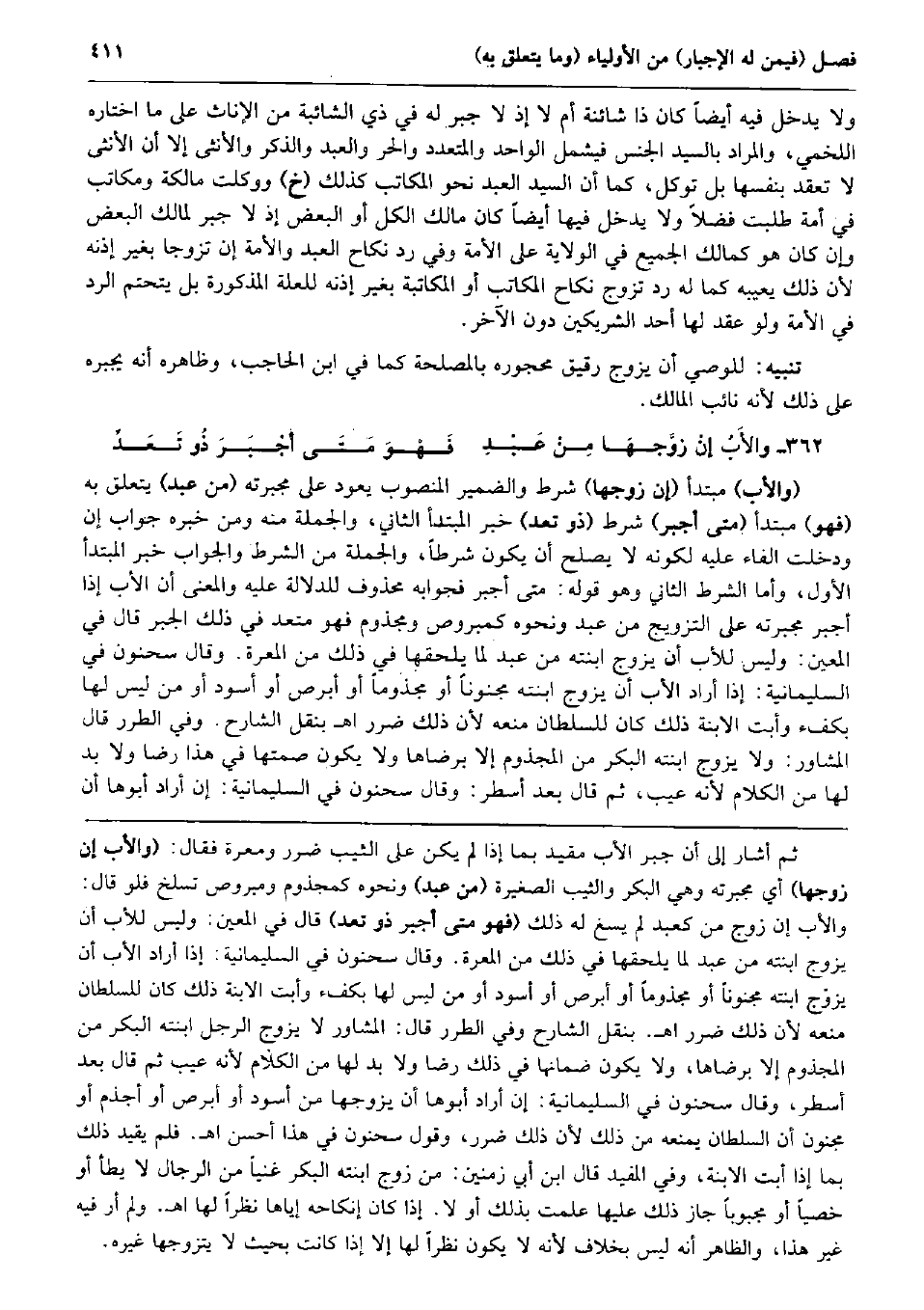 وَلَا يدْخل فِيهِ أَيْضا كَانَ ذَا شائنة أم لَا إِذْ لَا جبر لَهُ فِي ذِي الشائبة من الْإِنَاث على مَا اخْتَارَهُ اللَّخْمِيّ وَالْمرَاد بالسيد الْجِنْس فَيشْمَل الْوَاحِد والمتعدد وَالْحر وَالْعَبْد وَالذكر وَالْأُنْثَى إِلَّا أَن الْأُنْثَى لَا تعقد بِنَفسِهَا بل توكل، كَمَا أَن السَّيِّد العَبْد نَحْو الْمكَاتب كَذَلِك (خَ) ووكلت مالكة ومكاتب فِي أمة طلبت فضلا وَلَا يدْخل فِيهَا أَيْضا كَانَ مَالك الْكل أَو الْبَعْض إِذْ لَا جبر لمَالِك الْبَعْض وَإِن كَانَ هُوَ كمالك الْجَمِيع فِي الْولَايَة على الْأمة وَفِي رد نِكَاح العَبْد وَالْأمة إِن تزوجا بِغَيْر إِذْنه لِأَن ذَلِك يعِيبهُ كَمَا لَهُ رد تزوج نِكَاح الْمكَاتب أَو الْمُكَاتبَة بِغَيْر إِذْنه لِلْعِلَّةِ الْمَذْكُورَة بل يتحتم الرَّد فِي الْأمة وَلَو عقد لَهَا أحد الشَّرِيكَيْنِ دون الآخر. تَنْبِيه: للْوَصِيّ أَن يُزَوّج رَقِيق مَحْجُوره بِالْمَصْلَحَةِ كَمَا فِي ابْن الْحَاجِب، وَظَاهره أَنه يجْبرهُ على ذَلِك لِأَنَّهُ نَائِب الْمَالِك. والأَبُ إنْ زوَّجهَا مِنْ عَبْدِ فَهْوَ مَتَى أَجْبَرَ ذُو تَعَدِّ (وَالْأَب) مُبْتَدأ (إِن زَوجهَا) شَرط وَالضَّمِير الْمَنْصُوب يعود على مجبرته (من عبد) يتَعَلَّق بِهِ (فَهُوَ) مُبْتَدأ (مَتى أجبر) شَرط (ذُو تعد) خبر الْمُبْتَدَأ الثَّانِي، وَالْجُمْلَة مِنْهُ وَمن خَبره جَوَاب إِن وَدخلت الْفَاء عَلَيْهِ لكَونه لَا يصلح أَن يكون شرطا، وَالْجُمْلَة من الشَّرْط وَالْجَوَاب خبر الْمُبْتَدَأ الأول، وَأما الشَّرْط الثَّانِي وَهُوَ قَوْله: مَتى أجبر فَجَوَابه مَحْذُوف للدلالة عَلَيْهِ وَالْمعْنَى أَن الْأَب إِذا أجبر مجبرته على التَّزْوِيج من عبد وَنَحْوه كمبروص ومجذوم فَهُوَ مُتَعَدٍّ فِي ذَلِك الْجَبْر قَالَ فِي الْمعِين: وَلَيْسَ للْأَب أَن يُزَوّج ابْنَته من عبد لما يلْحقهَا فِي ذَلِك من المعرة. وَقَالَ سَحْنُون فِي السليمانية: إِذا أَرَادَ الْأَب أَن يُزَوّج ابْنَته مَجْنُونا أَو مجذوماً أَو أبرص أَو أسود أَو من لَيْسَ لَهَا بكفء وأبت الِابْنَة ذَلِك كَانَ للسُّلْطَان مَنعه لِأَن ذَلِك ضَرَر اه بِنَقْل الشَّارِح. وَفِي الطرر قَالَ المشاور: وَلَا يُزَوّج ابْنَته الْبكر من المجذوم إِلَّا بِرِضَاهَا وَلَا يكون صمتها فِي هَذَا رضَا وَلَا بُد لَهَا من الْكَلَام لِأَنَّهُ عيب، ثمَّ قَالَ بعد أسطر: وَقَالَ سَحْنُون فِي السليمانية: إِن أَرَادَ أَبوهَا أَن