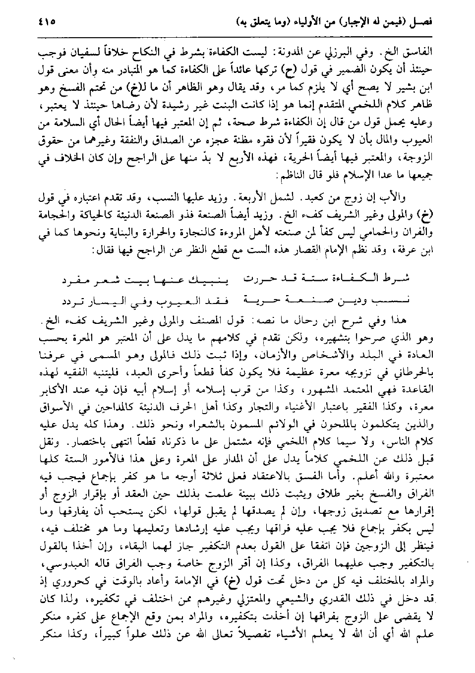 الْفَاسِق كَمَا يَقْتَضِيهِ كَلَام (م) لِأَن مَا كَانَ لَهَا وللولي تَركه لَا يتحتم عَلَيْهَا فَسخه، وَعبارَة الشَّامِل: وللمرأة وَالْوَلِيّ على الْأَصَح ترك كفاءة غير إِسْلَام فلهَا فسخ نِكَاح الْفَاسِق الخ. وَفِي الْبُرْزُليّ عَن الْمُدَوَّنَة: لَيست الْكَفَاءَة بِشَرْط فِي النِّكَاح خلافًا لِسُفْيَان فَوَجَبَ حِينَئِذٍ أَن يكون الضَّمِير فِي قَول (ح) تَركهَا عَائِدًا على الْكَفَاءَة كَمَا هُوَ الْمُتَبَادر مِنْهُ وَأَن معنى قَول ابْن بشير لَا يَصح أَي لَا يلْزم كَمَا مر، وَقد يُقَال وَهُوَ الظَّاهِر أَن مَا ل (خَ) من تحتم الْفَسْخ وَهُوَ ظَاهر كَلَام اللَّخْمِيّ الْمُتَقَدّم إِنَّمَا هُوَ إِذا كَانَت الْبِنْت غير رَشِيدَة لِأَن رِضَاهَا حِينَئِذٍ لَا يعْتَبر، وَعَلِيهِ يحمل قَول من قَالَ إِن الْكَفَاءَة شَرط صِحَة، ثمَّ إِن الْمُعْتَبر فِيهَا أَيْضا الْحَال أَي السَّلامَة من الْعُيُوب وَالْمَال بِأَن لَا يكون فَقِيرا لِأَن فقره مَظَنَّة عَجزه عَن الصَدَاق وَالنَّفقَة وَغَيرهمَا من حُقُوق الزَّوْجَة، وَالْمُعْتَبر فِيهَا أَيْضا الْحُرِّيَّة، فَهَذِهِ الْأَرْبَع لَا بدّ مِنْهَا على الرَّاجِح وَإِن كَانَ الْخلاف فِي جَمِيعهَا مَا عدا الْإِسْلَام فَلَو قَالَ النَّاظِم: وَالْأَب إِن زوج من كَعبد. لشمل الْأَرْبَعَة. وَزيد عَلَيْهَا النّسَب، وَقد تقدم اعْتِبَاره فِي قَول (خَ) وَالْمولى وَغير الشريف كُفْء الخ. وَزيد أَيْضا الصَّنْعَة فذو الصَّنْعَة الدنيئة كالحياكة والحجامة والفران والحمامي لَيْسَ كفأ لمن صَنعته لأهل الْمُرُوءَة كالنجارة والحرارة والبناية وَنَحْوهَا كَمَا فِي ابْن عَرَفَة، وَقد نظم الإِمَام الْقصار هَذِه السِّت مَعَ قطع النّظر عَن الرَّاجِح فِيهَا فَقَالَ: شَرط الْكَفَاءَة سِتَّة قد حررت ينبيك عَنْهَا بَيت شعر مُفْرد نسب وَدين صَنْعَة حريَّة فقد الْعُيُوب وَفِي الْيَسَار تردد هَذَا وَفِي شرح ابْن رحال مَا نَصه: قَول المُصَنّف وَالْمولى وَغير الشريف كُفْء الخ. وَهُوَ الَّذِي صَرَّحُوا بتشهيره، وَلَكِن تقدم فِي كَلَامهم مَا يدل على أَن الْمُعْتَبر هُوَ المعرة بِحَسب الْعَادة فِي الْبَلَد والأشخاص والأزمان، وَإِذا ثَبت ذَلِك فالمولى وَهُوَ الْمُسَمّى فِي عرفنَا بالحرطاني فِي تَزْوِيجه معرة عَظِيمَة فَلَا يكون كفأ قطعا وَأَحْرَى العَبْد، فليتنبه الْفَقِيه لهَذِهِ الْقَاعِدَة فَهِيَ الْمُعْتَمد الْمَشْهُور، وَكَذَا من قرب إِسْلَامه أَو إِسْلَام أَبِيه فَإِن فِيهِ عِنْد الأكابر معرة، وَكَذَا الْفَقِير بِاعْتِبَار الْأَغْنِيَاء والتجار وَكَذَا أهل الْحَرْف الدنيئة كالمداحين فِي الْأَسْوَاق وَالَّذين يَتَكَلَّمُونَ بالملحون فِي الولائم المسمون بالشعراء وَنَحْو ذَلِك. وَهَذَا كُله يدل عَلَيْهِ كَلَام النَّاس، وَلَا سِيمَا كَلَام اللَّخْمِيّ فَإِنَّهُ مُشْتَمل على مَا ذَكرْنَاهُ قطعا انْتهى بِاخْتِصَار. وَنقل قبل ذَلِك عَن اللَّخْمِيّ كلَاما يدل على أَن الْمدَار على المعرة وعَلى هَذَا فالأمور السِّتَّة كلهَا مُعْتَبرَة وَالله أعلم. وَأما الْفسق بالاعتقاد فعلى ثَلَاثَة أوجه مَا هُوَ كفر بِإِجْمَاع فَيجب فِيهِ الْفِرَاق وَالْفَسْخ بِغَيْر طَلَاق وَيثبت ذَلِك بِبَيِّنَة علمت بذلك حِين العقد أَو بِإِقْرَار الزَّوْج أَو إِقْرَارهَا مَعَ تَصْدِيق زَوجهَا وَإِن لم يصدقها لم يقبل قَوْلهَا، لَكِن يسْتَحبّ أَن يفارقها وَمَا لَيْسَ بِكفْر بِإِجْمَاع فَلَا يجب عَلَيْهِ فراقها وَيجب عَلَيْهِ إرشادها وَتَعْلِيمهَا وَمَا هُوَ مُخْتَلف فِيهِ، فَينْظر إِلَى الزَّوْجَيْنِ فَإِن اتفقَا على القَوْل بِعَدَمِ التَّكْفِير جَازَ لَهما الْبَقَاء، وَإِن أخذا بالْقَوْل بالتكفير وَجب عَلَيْهِمَا الْفِرَاق، وَكَذَا إِن أقرّ الزَّوْج خَاصَّة وَجب الْفِرَاق قَالَه العبدوسي، وَالْمرَاد بالمختلف فِيهِ كل من د