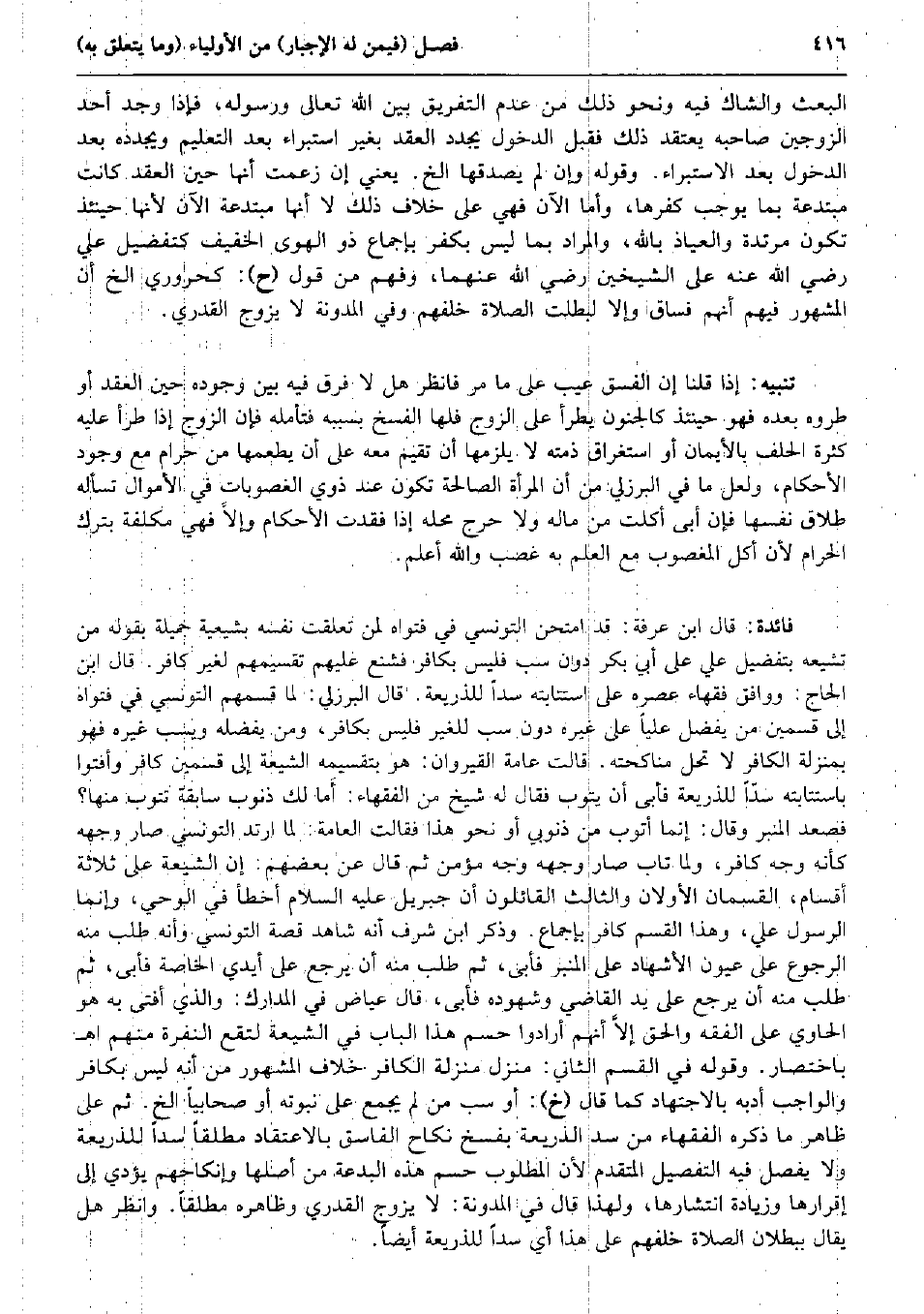 الْبَعْث والشاك فِيهِ وَنَحْو ذَلِك من عدم التَّفْرِيق بَين الله تَعَالَى وَرَسُوله، فَإِذا وجد أحد الزَّوْجَيْنِ صَاحبه يعْتَقد ذَلِك فَقبل الدُّخُول يجدد العقد بِغَيْر اسْتِبْرَاء بعد التَّعْلِيم ويجدده بعد الدُّخُول بعد الِاسْتِبْرَاء. وَقَوله وَإِن لم يصدقها الخ. يَعْنِي إِن زعمت أَنَّهَا حِين العقد كَانَت مبتدعة بِمَا يُوجب كفرها، وَأما الْآن فَهِيَ على خلاف ذَلِك لَا أَنَّهَا مبتدعة الْآن لِأَنَّهَا حِينَئِذٍ تكون مرتدة وَالْعِيَاذ بِاللَّه، وَالْمرَاد بِمَا لَيْسَ بِكفْر بِإِجْمَاع ذُو الْهوى الْخَفِيف كتفضيل عَليّ رَضِي الله عَنهُ على الشَّيْخَيْنِ رَضِي الله عَنْهُمَا، وَفهم من قَول (ح) : كحروري الخ أَن الْمَشْهُور فيهم أَنهم فساق وَإِلَّا لبطلت الصَّلَاة خَلفهم وَفِي الْمُدَوَّنَة لَا يُزَوّج القدري. تَنْبِيه: إِذا قُلْنَا إِن الْفسق عيب على مَا مر فَانْظُر هَل لَا فرق فِيهِ بَين وجوده حِين العقد أَو طروه بعده فَهُوَ حِينَئِذٍ كالجنون يطْرَأ على الزَّوْج فلهَا الْفَسْخ بِسَبَبِهِ فَتَأَمّله فَإِن الزَّوْج إِذا طَرَأَ عَلَيْهِ كَثْرَة الْحلف بالأيمان أَو استغراق ذمَّته لَا يلْزمهَا أَن تقيم مَعَه على أَن يطْعمهَا من حرَام مَعَ وجود الْأَحْكَام، وَلَعَلَّ مَا فِي الْبُرْزُليّ من أَن الْمَرْأَة الصَّالِحَة تكون عِنْد ذَوي الغصوبات فِي الْأَمْوَال تسأله طَلَاق نَفسهَا فَإِن أَبى أكلت من مَاله وَلَا حرج مَحَله إِذا فقدت الْأَحْكَام وإلاَّ فَهِيَ مكلفة بترك الْحَرَام لِأَن أكل الْمَغْصُوب مَعَ الْعلم بِهِ غصب وَالله أعلم. فَائِدَة: قَالَ ابْن عَرَفَة: قد امتحن التّونسِيّ فِي فتواه لمن تعلّقت نَفسه بشيعية جميلَة بقوله من تشيعه بتفضيل عَليّ على أبي بكر دون سبّ فَلَيْسَ بِكَافِر فشنع عَلَيْهِم تقسيمهم لغير كَافِر. قَالَ ابْن الْحَاج: وَوَافَقَ فُقَهَاء عصره على استتابته سداً للذريعة. قَالَ الْبُرْزُليّ: لما قسمهم التّونسِيّ فِي فتواه إِلَى قسمَيْنِ من يفضل عليا على غَيره دون سبّ للْغَيْر فَلَيْسَ بِكَافِر، وَمن يفضله ويسب غَيره فَهُوَ بِمَنْزِلَة الْكَافِر لَا تحل مناكحته. قَالَت عَامَّة القيروان: هُوَ بتقسيمه الشِّيعَة إِلَى قسمَيْنِ كَافِر وأفتوا باستتابته سدّاً للذريعة فَأبى أَن يَتُوب فَقَالَ لَهُ شيخ من الْفُقَهَاء: أَما لَك ذنُوب سَابِقَة تتوب مِنْهَا؟ فَصَعدَ الْمِنْبَر وَقَالَ: إِنَّمَا أَتُوب من ذُنُوبِي أَو نَحْو هَذَا فَقَالَت الْعَامَّة: لما ارْتَدَّ التّونسِيّ صَار وَجهه كَأَنَّهُ وَجه كَافِر، وَلما تَابَ صَار وَجهه وَجه مُؤمن ثمَّ قَالَ عَن بَعضهم: إِن الشِّيعَة على ثَلَاثَة أَقسَام، القسمان الْأَوَّلَانِ وَالثَّالِث الْقَائِلُونَ أَن جِبْرِيل عَلَيْهِ السَّلَام أَخطَأ فِي الْوَحْي، وَإِنَّمَا الرَّسُول عَليّ، وَهَذَا الْقسم كَافِر بِإِجْمَاع. وَذكر ابْن شرف أَنه شَاهد قصَّة التّونسِيّ وَأَنه طلب مِنْهُ الرُّجُوع على عُيُون الأشهاد على الْمِنْبَر فَأبى، ثمَّ طلب مِنْهُ أَن يرجع على أَيدي الْخَاصَّة فَأبى، ثمَّ طلب مِنْهُ أَن يرجع على يَد القَاضِي وشهوده فَأبى، قَالَ عِيَاض فِي المدارك: وَالَّذِي أفتى بِهِ هُوَ الْحَاوِي على الْفِقْه وَالْحق إلاَّ أَنهم أَرَادوا حسم هَذَا الْبَاب فِي الشِّيعَة لتقع النفرة مِنْهُم اه بِاخْتِصَار. وَقَوله فِي الْقسم الثَّانِي: منزل منزلَة الْكَافِر خلاف الْمَشْهُور من أَنه لَيْسَ بِكَافِر وَالْوَاجِب أدبه بِالِاجْتِهَادِ كَمَا قَالَ (خَ) : أَو سبّ من لم يجمع على نبوته أَو صحابياً الخ. ثمَّ على ظَاهر مَا ذكره الْفُقَهَاء من سد الذريعة بِفَسْخ نِكَاح الْفَاسِق بالاعتقاد مُطلقًا سداً للذريعة وَلَا يفصل فِيهِ التَّفْصِيل الْمُتَقَدّم لِأَن الْمَطْلُوب حسم هَذِه الْبِدْعَة من أَصْلهَا وإنكاحهم يُؤَدِّي إِلَى إِقْرَارهَا وَزِيَادَة انتشارها وَلِهَذَا قَا
