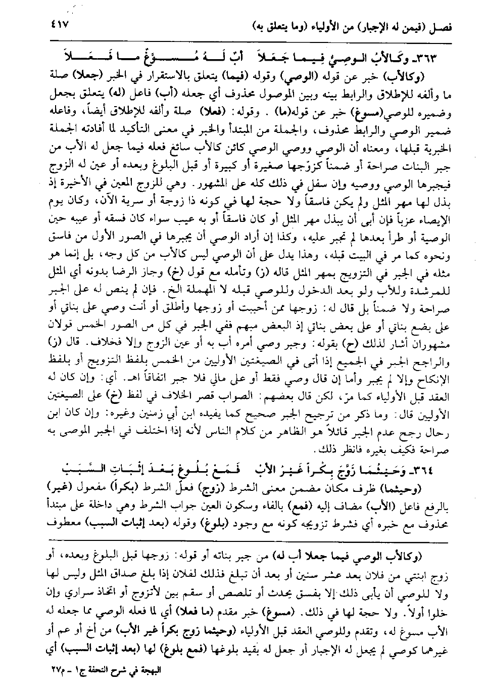 وكَالأبُ الوصِيُّ فِيما جَعَلاَ أبٌ لَهُ مُسوَّغٌ مَا فَعَلاَ (وكالأب) خبر عَن قَوْله (الْوَصِيّ) وَقَوله (فِيمَا) يتَعَلَّق بالاستقرار فِي الْخَبَر (جعلا) صلَة مَا وألفه للإطلاق والرابط بَينه وَبَين الْمَوْصُول مَحْذُوف أَي جعله (أَب) فَاعل (لَهُ) يتَعَلَّق بِجعْل وضميره للْوَصِيّ (مسوغ) خبر عَن قَوْله (مَا) . وَقَوله: (فعلا) صلَة وألفه للإطلاق أَيْضا، وفاعله ضمير الْوَصِيّ والرابط مَحْذُوف، وَالْجُمْلَة من الْمُبْتَدَأ وَالْخَبَر فِي معنى التَّأْكِيد لما أفادته الْجُمْلَة الخبرية قبلهَا، وَمَعْنَاهُ أَن الْوَصِيّ ووصي الْوَصِيّ كَائِن كَالْأَبِ سَائِغ فعله فِيمَا جعل لَهُ الْأَب من جبر الْبَنَات صَرَاحَة أَو ضمنا كزوّجها صَغِيرَة أَو كَبِيرَة أَو قبل الْبلُوغ وَبعده أَو عين لَهُ الزَّوْج فيجبرها الْوَصِيّ ووصيه وَإِن سفل فِي ذَلِك كُله على الْمَشْهُور. وَهِي للزَّوْج الْمعِين فِي الْأَخِيرَة إِذْ بذل لَهَا مهر الْمثل وَلم يكن فَاسِقًا وَلَا حجَّة لَهَا فِي كَونه ذَا زَوْجَة أَو سَرِيَّة الْآن، وَكَانَ يَوْم الْإِيصَاء عزباً فَإِن أَبى أَن يبْذل مهر الْمثل أَو كَانَ فَاسِقًا أَو بِهِ عيب سَوَاء كَانَ فسقه أَو عَيبه حِين الْوَصِيَّة أَو طَرَأَ بعْدهَا لم تجبر عَلَيْهِ، وَكَذَا إِن أَرَادَ الْوَصِيّ أَن يجبرها فِي الصُّور الأول من فَاسق وَنَحْوه كَمَا مر فِي الْبَيْت قبله، وَهَذَا يدل على أَن الْوَصِيّ لَيْسَ كَالْأَبِ من كل وَجه، بل إِنَّمَا هُوَ مثله فِي الْجَبْر فِي التَّزْوِيج بِمهْر الْمثل قَالَه (ز) وتأمله مَعَ قَول (خَ) وَجَاز الرِّضَا بِدُونِهِ أَي الْمثل للمرشدة وَللْأَب وَلَو بعد الدُّخُول وللوصي قبله لَا الْمُهْملَة الخ. فَإِن لم ينص لَهُ على الْجَبْر صَرَاحَة وَلَا ضمنا بل قَالَ لَهُ: زَوجهَا مِمَّن أَحْبَبْت أَو زَوجهَا وَأطلق أَو أَنْت وَصِيّ على بَنَاتِي أَو على بضع بَنَاتِي أَو على بعض بَنَاتِي إِذْ الْبَعْض مُبْهَم فَفِي الْجَبْر فِي كل من الصُّور الْخمس قَولَانِ مشهوران أَشَارَ لذَلِك (ح) بقوله: وجبر وَصِيّ أمره أَب بِهِ أَو عين الزَّوْج وَإِلَّا فخلاف. قَالَ (ز) وَالرَّاجِح الْجَبْر فِي الْجَمِيع إِذا أَتَى فِي الصيغتين الْأَوليين من الْخمس بِلَفْظ التَّزْوِيج أَو بِلَفْظ الْإِنْكَاح وَإِلَّا لم يجْبر وَأما إِن قَالَ وَصِيّ فَقَط أَو على مَالِي فَلَا جبر اتِّفَاقًا اه. أَي: وَإِن كَانَ لَهُ العقد قبل الْأَوْلِيَاء كَمَا مرّ، لَكِن قَالَ بَعضهم: الصَّوَاب قصر الْخلاف فِي لفظ (خَ) على الصيغتين الْأَوليين قَالَ: وَمَا ذكر من تَرْجِيح الْجَبْر صَحِيح كَمَا يفِيدهُ ابْن أبي زمنين وَغَيره: وَإِن كَانَ ابْن رحال رجح عدم الْجَبْر قَائِلا هُوَ الظَّاهِر من كَلَام النَّاس لِأَنَّهُ إِذا اخْتلف فِي الْجَبْر الْمُوصى بِهِ صَرَاحَة فَكيف بِغَيْرِهِ فَانْظُر ذَلِك. وَحَيْثُمَا زَوَّجَ بِكْراً غَيْرُ الأبْ فَمَعْ بُلُوغٍ بَعْدَ إثْبَاتِ السَّبَبْ (وحيثما) ظرف مَكَان مضمن معنى الشَّرْط (زوج) فعل الشَّرْط (بكرا) مفعول (غير) بِالرَّفْع فَاعل (الْأَب) مُضَاف إِلَيْهِ (فَمَعَ) بِالْفَاءِ وَسُكُون الْعين جَوَاب الشَّرْط وَهِي دَاخِلَة على مُبْتَدأ مَحْذُوف مَعَ خَبره أَي فَشرط تَزْوِيجه كَونه مَعَ وجود (بُلُوغ) وَقَوله (بعد إِثْبَات السَّبَب) مَعْطُوف