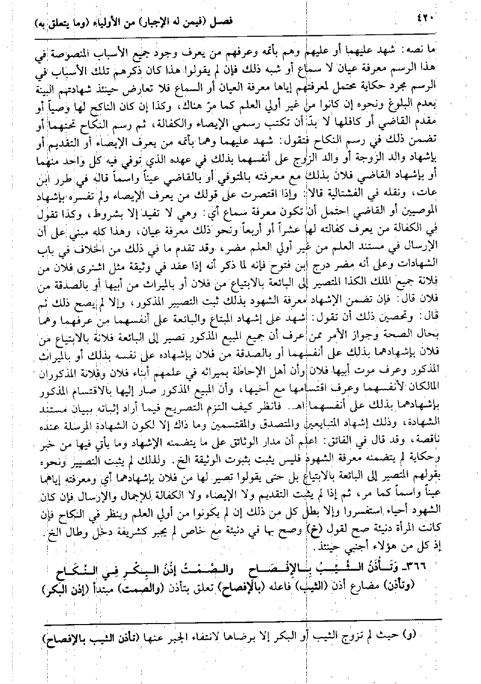 مَا نَصه: شهد عَلَيْهِمَا أَو عَلَيْهِم وهم بأتمه وعرفهم من يعرف وجود جَمِيع الْأَسْبَاب المنصوصة فِي هَذَا الرَّسْم معرفَة عيان لَا سَماع أَو شبه ذَلِك فَإِن لم يَقُولُوا هَذَا كَانَ ذكرهم تِلْكَ الْأَسْبَاب فِي الرَّسْم مُجَرّد حِكَايَة مُحْتَمل لمعرفتهم إِيَّاهَا معرفَة العيان أَو السماع فَلَا تعَارض حِينَئِذٍ شَهَادَتهم الْبَيِّنَة بِعَدَمِ الْبلُوغ وَنَحْوه إِن كَانُوا من غير أولي الْعلم كَمَا مرّ هُنَاكَ، وَكَذَا إِن كَانَ الناكح لَهَا وَصِيّا أَو مقدم القَاضِي أَو كافلها لَا بدّ أَن تكْتب رسمي الْإِيصَاء وَالْكَفَالَة، ثمَّ رسم النِّكَاح تحتهما أَو تضمن ذَلِك فِي رسم النِّكَاح فَتَقول: شهد عَلَيْهِمَا وهما بأتمه من يعرف الْإِيصَاء أَو التَّقْدِيم أَو بإشهاد وَالِد الزَّوْجَة أَو وَالِد الزَّوْج على أَنفسهمَا بذلك فِي عَهده الَّذِي توفّي فِيهِ كل وَاحِد مِنْهُمَا أَو بإشهاد القَاضِي فلَان بذلك مَعَ مَعْرفَته بالمتوفي أَو بِالْقَاضِي عينا واسماً قَالَه فِي طرر ابْن عَاتٍ، وَنَقله فِي الفشتالية قَالَا: وَإِذا اقتصرت على قَوْلك من يعرف الْإِيصَاء وَلم تفسره بإشهاد الموصيين أَو القَاضِي احْتمل أَن تكون معرفَة سَماع أَي: وَهِي لَا تفِيد إِلَّا بِشُرُوط، وَكَذَا تَقول فِي الْكفَالَة من يعرف كفَالَته لَهَا عشرا أَو أَرْبعا وَنَحْو ذَلِك معرفَة عيان، وَهَذَا كُله مَبْنِيّ على أَن الْإِرْسَال فِي مُسْتَند الْعلم من غير أولي الْعلم مُضر، وَقد تقدم مَا فِي ذَلِك من الْخلاف فِي بَاب الشَّهَادَات وعَلى أَنه مُضر درج ابْن فتوح فَإِنَّهُ لما ذكر أَنه إِذا عقد فِي وَثِيقَة مثل اشْترى فلَان من فُلَانَة جَمِيع الْملك الكذا المتصير إِلَى البائعة بالابتياع من فلَان أَو بِالْمِيرَاثِ من أَبِيهَا أَو بِالصَّدَقَةِ من فلَان قَالَ: فَإِن تضمن الْإِشْهَاد معرفَة الشُّهُود بذلك ثَبت التصيير الْمَذْكُور، وَإِلَّا لم يَصح ذَلِك ثمَّ قَالَ: وتحصين ذَلِك أَن تَقول: شهد على إِشْهَاد الْمُبْتَاع والبائعة على أَنفسهمَا من عرفهما وهما بِحَال الصِّحَّة وَجَوَاز الْأَمر مِمَّن عرف أَن جَمِيع الْمَبِيع الْمَذْكُور تصير إِلَى البائعة فُلَانَة بالابتياع من فلَان بإشهادهما بذلك على أَنفسهمَا أَو بِالصَّدَقَةِ من فلَان بإشهاده على نَفسه بذلك أَو بِالْمِيرَاثِ الْمَذْكُور وَعرف موت أَبِيهَا فلَان وَأَن أهل الْإِحَاطَة بميراثه فِي علمهمْ أَبنَاء فلَان وفلانة الْمَذْكُورَان المالكان لأنفسهما وَعرف اقتسامها مَعَ أَخِيهَا، وَأَن الْمَبِيع الْمَذْكُور صَار إِلَيْهَا بالاقتسام الْمَذْكُور بإشهادهما بذلك على أَنفسهمَا اه. فَانْظُر كَيفَ الْتزم التَّصْرِيح فِيمَا أَرَادَ إثْبَاته بِبَيَان مُسْتَند الشَّهَادَة، وَذَلِكَ إِشْهَاد الْمُتَبَايعين والمتصدق والمقتسمين وَمَا ذَاك إِلَّا لكَون الشَّهَادَة الْمُرْسلَة عِنْده نَاقِصَة، وَقد قَالَ فِي الْفَائِق: اعْلَم أَن مدَار الوثائق على مَا يتضمنه الْإِشْهَاد وَمَا يَأْتِي فِيهَا من خبر وحكاية لم يتضمنه معرفَة الشُّهُود فَلَيْسَ يثبت بِثُبُوت الْوَثِيقَة الخ. وَلذَلِك لم يثبت التصيير وَنَحْوه بقَوْلهمْ المتصير إِلَى البائعة بالابتياع بل حَتَّى يَقُولُوا تصير لَهَا من فلَان بإشهادهما أَي ومعرفته إيَّاهُمَا عينا واسماً كَمَا مر، ثمَّ إِذا لم يثبت التَّقْدِيم وَلَا الْإِيصَاء وَلَا الْكفَالَة للإجمال والإرسال فَإِن كَانَ الشُّهُود أَحيَاء استفسروا وَإِلَّا بَطل كل من ذَلِك إِن لم يَكُونُوا من أولي الْعلم وَينظر فِي النِّكَاح فَإِن كَانَت الْمَرْأَة دنيئة صَحَّ لقَوْل (خَ) وَصَحَّ بهَا فِي دنيئة مَعَ خَاص لم يجْبر كشريفة دخل وَطَالَ الخ. إِذْ كل من هَؤُلَاءِ أَجْنَبِي حِينَئِذٍ. وَتَأْذَنُ الثَّيِّبُ بِالإِفْصَاحِ والصَّمْتُ إذْنُ البِكْرِ فِي النِّكَاحِ