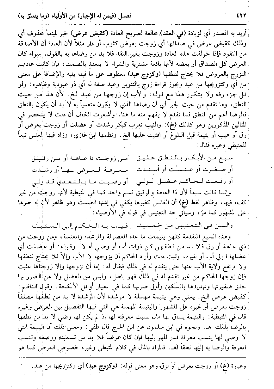 أُرِيد بِهِ الْمصدر أَي لزِيَادَة (فِي العقد) مُخَالفَة لصريح الْعَادة (كقبض عرض) خبر لمبتدأ مَحْذُوف أَي وَذَلِكَ كقبض عرض فِي صَدَاقهَا أَي زوجت بِعرْض كَثوب أَو دَار مثلا لِأَن الْعَادة أَن الأصدقة من النُّقُود فَإِذا خولفت هَذِه الْعَادة وزوجت بِغَيْر النَّقْد فَلَا بُد من رِضَاهَا بِهِ بالْقَوْل، سَوَاء كَانَ الْعرض كل الصَدَاق أَو بعضه لِأَنَّهَا بائعة مشترية وَالشِّرَاء لَا ينْعَقد بِالصَّمْتِ، فَإِن كَانَت عَادَتهم التَّزَوُّج بالعروض فَلَا يحْتَاج لنطقها (وكزوج عبد) مَعْطُوف على مَا قبله يَلِيهِ وَالْإِضَافَة على معنى من أَي وكتزويجها من عبد وَيجوز قِرَاءَة زوج بِالتَّنْوِينِ وَعبد صفة لَهُ أَي ذُو عبودية وَظَاهره: وَلَو قل جُزْء رقّه وَلَا يتَكَرَّر هَذَا مَعَ قَوْله: وَالْأَب إِن زَوجهَا من عبد الخ. لِأَن هَذَا من حَيْثُ النُّطْق، وَمَا تقدم من حَيْثُ الْجَبْر أَي أَن رِضَاهَا الَّذِي لَا يكون مُتَعَدِّيا بِهِ لَا بُد أَن يكون بالنطق فالرضا أَعم من النُّطْق فَمَا تقدم لَا يفهم مِنْهُ مَا هُنَا، وأشعرت الْكَاف أَن ذَلِك لَا ينْحَصر فِي المثالين الْمَذْكُورين وَهُوَ كَذَلِك (خَ) : وَالثَّيِّب تعرب كبكر رشدت أَو عضلت أَو زوجت بِعرْض أَو رق أَو عيب أَو يتيمة قبل الْبلُوغ أَو افتيت عَلَيْهَا الخ. ونظمها ابْن غَازِي، وَزَاد فِيهَا العنس تبعا للمتيطي وَغَيره فَقَالَ: سبع من الْأَبْكَار بالنطق خليق من زوجت ذَا عاهة أَو من رَقِيق أَو صغرت أَو عنست أَو أسندت معرفَة الْعرض لَهَا أَو رشدت أَو رفعت لحَاكم عضل الْوَلِيّ أَو رضيت مَا بِالتَّعَدِّي قد ولي وَإِنَّمَا كَانَت سبعا لِأَن ذَا العاهة وَالرَّقِيق قسم وَاحِد كَمَا فِي الْمُتَيْطِيَّة لِأَنَّهَا زوجت من غير كُفْء فِيهَا، وَظَاهر لفظ (خَ) أَن العانس كَغَيْرِهَا يَكْفِي فِي إِذْنهَا الصمت وَهُوَ ظَاهر لِأَن لَهُ جبرها على الْمَشْهُور كَمَا مرّ، وَسَيَأْتِي حد التعنيس فِي قَوْله فِي الأوصياء: وَالسّن فِي التعنيس من خمسينا فِيمَا بِهِ الحكم إِلَى الستينا وَهَذِه السَّبع الْمُتَقَدّمَة كُلهنَّ يتيمات مَا عدا المعضولة والمرشدة والمعنسة، وَمن زوجت من ذِي عاهة أَو رق فَلَا بُد من نطقهن كن ذَوَات أَب أَو وَصِيّ أم لَا. وَقَوله: أَو عضلت أَي عضلها الْوَلِيّ أَب أَو غَيره، وَثَبت ذَلِك وَأَرَادَ الْحَاكِم أَن يُزَوّجهَا لَا الْأَب وإلاّ فَلَا يحْتَاج لنطقها وَلَا ترْتَفع ولَايَة الْأَب عَنْهَا حَتَّى يتَقَدَّم لَهُ فِي ذَلِك فَيُقَال لَهُ: إِمَّا أَن تزَوجهَا وَإِلَّا زوجناها عَلَيْك فَإِن زَوجهَا الْحَاكِم من غير تقدم لَهُ فِي ذَلِك فَهُوَ بَاطِل، وَلَيْسَ من العضل وَلَا من الضَّرَر بهَا حلق ضفيرتها وتهديدها بالسكين وَأولى ضربهَا كَمَا فِي المعيار أَوَائِل الْأَنْكِحَة. وَقَول النَّاظِم: كقبض عرض الخ. يَعْنِي وَهِي يتيمة مُهْملَة لَا مرشدة لِأَن المرشدة لَا بُد من نطقها مُطلقًا زوجت بِعرْض أَو غَيره على الْمَشْهُور واليتيمة الْمُهْملَة هِيَ الَّتِي فِيهَا التَّفْصِيل بَين الْعرض وَغَيره قَالَ فِي الْمُتَيْطِيَّة: واليتيمة يساق لَهَا مَال نسبت مَعْرفَته لَهَا إِذا لم يكن لَهَا وَصِيّ لَا بُد من نطقها بِالرِّضَا بذلك اه. وَنَحْوه فِي ابْن سَلمُون عَن ابْن الْحَاج قَالَ طفي: وَمعنى ذَلِك أَن الْيَتِيمَة الَّتِي لَا وَصِيّ لَهَا ينْسب معرفَة قدر الْمهْر إِلَيْهَا فَإِن كَانَ عرضا فَلَا بُد من تَسْمِيَته وَوَصفه وتنسب الْمعرفَة وَالرِّضَا بِهِ إِلَيْهَا نطقاً اه. فَالْمُرَاد بِالْمَالِ فِي كَلَام المتيطي وَغَيره خُصُوص الْعرض كَمَا هُوَ