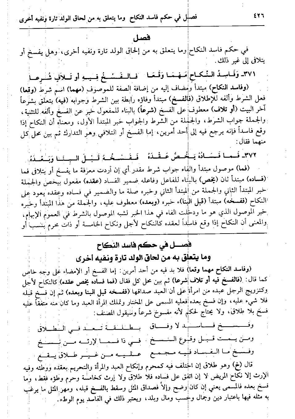 فِي حكم فَاسد النِّكَاح وَمَا يتَعَلَّق بِهِ من إِلْحَاق الْوَلَد تَارَة ونفيه أُخْرَى، وَهل يفْسخ أَو يتلافى إِلَى غير ذَلِك. وَفَاسِدُ النِّكاحِ مَهْمَا وَقَعَا فالفَسْخُ فِيهِ أَو تَلاَفٍ شُرِعا (وفاسد النِّكَاح) مُبْتَدأ ومضاف إِلَيْهِ من إِضَافَة الصّفة للموصوف (مهما) اسْم شَرط (وَقعا) فعل الشَّرْط وألفه للإطلاق (فالفسخ) مُبْتَدأ وفاؤه رابطة بَين الشَّرْط وَجَوَابه (فِيهِ) يتَعَلَّق بشرعاً آخر الْبَيْت (أَو تلاف) مَعْطُوف على الْفَسْخ (شرعا) بِالْبِنَاءِ للْمَفْعُول خبر عَن الْفَسْخ وألفه للتثنية، وَالْجُمْلَة جَوَاب الشَّرْط، وَالْجُمْلَة من الشَّرْط وَالْجَوَاب خبر الْمُبْتَدَأ الأول، وَمَعْنَاهُ أَن النِّكَاح إِذا وَقع فَاسِدا فَإِنَّهُ يرجع فِيهِ إِلَى أحد أَمريْن، إِمَّا الْفَسْخ أَو التلافي وَهُوَ التَّدَارُك ثمَّ بَين مَحل كل مِنْهُمَا فَقَالَ: فَما فَسَادُهُ يَخُصُّ عَقْدَهُ فَفَسْخُهُ قَبْلَ البِنَا وَبَعْدَهُ (فَمَا) مَوْصُول مُبْتَدأ وَالْفَاء جَوَاب شَرط مُقَدّر أَي إِن أردْت معرفَة مَا يفْسخ أَو يتلافى فَمَا (فَسَاده) مُبْتَدأ ثَان (يخص) بِالْبِنَاءِ للْفَاعِل وفاعله ضمير الْفساد (عقده) مفعول بيخص وَالْجُمْلَة خبر الْمُبْتَدَأ الثَّانِي وَالْجُمْلَة من الْمُبْتَدَأ الثَّانِي وَخَبره صلَة مَا وَالضَّمِير فِي فَسَاده وعقده يعود على النِّكَاح (ففسخه) مُبْتَدأ (قبل الْبَنَّا) ء خَبره (وَبعده) مَعْطُوف عَلَيْهِ، وَالْجُمْلَة من هَذَا الْمُبْتَدَأ وَخَبره خبر الْمَوْصُول الَّذِي هُوَ مَا وَدخلت الْفَاء فِي هَذَا الْخَبَر لشبه الْمَوْصُول بِالشّرطِ فِي الْعُمُوم الْإِبْهَام، وَالْمعْنَى أَن النِّكَاح إِذا وَقع فَاسِدا لعقده كَالنِّكَاحِ لأجل وَنِكَاح الْخَامِسَة أَو ذَات محرم بِنسَب أَو