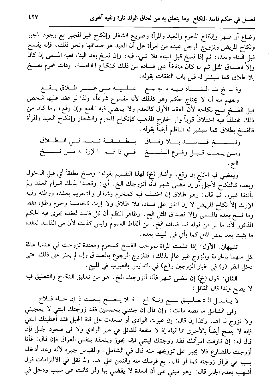رضَاع أَو صهر وإنكاح الْمحرم وَالْعَبْد وَالْمَرْأَة وصريح الشّغَار وإنكاح غير الْمُجبر مَعَ وجود الْمُجبر وَنِكَاح الْمَرِيض وتزويج الرجل عَبده من امْرَأَة على أَن العَبْد هُوَ صَدَاقهَا وَنَحْو ذَلِك، فَإِنَّهُ يفْسخ قبل الْبناء وَبعده، ثمَّ إِذا فسخ قبل الْبناء فَلَا شَيْء فِيهِ، وَإِن فسخ بعد الْبناء فَفِيهِ الْمُسَمّى إِن كَانَ وإلاَّ فصداق الْمثل ثمَّ مَا كَانَ مُتَّفقا على فَسَاده من ذَلِك كَنِكَاح الْخَامِسَة، وَذَات محرم يفْسخ بِلَا طَلَاق كَمَا سيشير لَهُ قبل بَاب النَّفَقَات بقوله: وَفسخ مَا الْفساد فِيهِ مجمع عَلَيْهِ من غير طَلَاق يَقع وَيفهم مِنْهُ أَنه لَا يحْتَاج لحكم وَهُوَ كَذَلِك لِأَنَّهُ مفسوخ شرعا، وَلذَا لَو عقد عَلَيْهَا شخص قبل الْفَسْخ صَحَّ نِكَاحه لِأَن العقد الأول كَالْعدمِ وَلَا يمْضِي فِيهِ الْخلْع وَإِن وَقع، وَمَا كَانَ من ذَلِك مُخْتَلفا فِيهِ اخْتِلَافا قَوِيا وَلَو خَارج الْمَذْهَب كإنكاح الْمحرم والشغار وإنكاح العَبْد وَالْمَرْأَة فالفسخ بِطَلَاق كَمَا سيشير لَهُ النَّاظِم أَيْضا بقوله: وَفسخ فَاسد بِلَا وفَاق بِطَلْقَة تعد فِي الطَّلَاق وَمن يمت قبل وُقُوع الْفَسْخ فِي ذَا فَمَا لإرثه من نسخ الخ. ويمضي فِيهِ الْخلْع إِن وَقع، وَأَشَارَ (خَ) لهَذَا التَّقْسِيم بقوله: وَفسخ مُطلقًا أَي قبل الدُّخُول وَبعده كَالنِّكَاحِ لأجل أَو إِن مضى شهر فَأَنا أتزوجك الخ. أَي: وقصدا بذلك انبرام العقد وَلم يأتنفا غَيره، ثمَّ قَالَ: وَهُوَ طَلَاق إِن اخْتلف فِيهِ كمحرم وشغار وَالتَّحْرِيم بعقده ووطئه وَفِيه الْإِرْث إلاَّ نِكَاح الْمَرِيض لَا إِن اتّفق على فَسَاده فَلَا طَلَاق وَلَا إِرْث كخامسة وَحرم وَطْؤُهُ فَقَط وَمَا فسخ بعده فالمسمى وَإِلَّا فصداق الْمثل الخ. وَظَاهر النّظم أَن كل فَاسد لعقده يجْرِي فِيهِ الحكم الْمَذْكُور لِأَن مَا مر من قَوْله فَمَا فَسَاده الخ. من أَلْفَاظ الْعُمُوم وَلَيْسَ كَذَلِك لِأَن من الْفَاسِد لعقده مَا يثبت بعد بِمهْر الْمثل كَمَا يَأْتِي فِي الْبَيْت بعده. تَنْبِيهَانِ. الأول: إِذا علمت الْمَرْأَة بِمُوجب الْفَسْخ كمحرم ومعتدة تزوجت فِي عدتهَا عَالِمَة كل مِنْهُمَا بِالْحُرْمَةِ وَالزَّوْج غير عَالم بذلك، فَللزَّوْج الرُّجُوع بِالصَّدَاقِ وَإِن لم يعثر على ذَلِك حَتَّى دخل انْظُر (ز) فِي خِيَار الزَّوْجَيْنِ و (ح) فِي التَّدْلِيس بالعيوب فِي الْمَبِيع. الثَّانِي: قَول (خَ) إِن مضى شهر فَأَنا أتزوجك الخ. هُوَ من تَعْلِيق النِّكَاح وَالتَّعْلِيق فِيهِ لَا يَصح وَلذَا قَالَ الْقَائِل: لَا يقبل التَّعْلِيق بيع وَنِكَاح فَلَا يَصح بِعْت ذَا إِن جَاءَ فلاح وَفِي الشَّامِل مَا نَصه مَالك: وَإِن قَالَ إِن جئتني بِخَمْسِينَ فقد زَوجتك ابْنَتي لَا يُعجبنِي وَلَا تزوج لَهُ اه. وَكَذَا إِن قَالَ: إِن عبرت الْوَادي أَو صعدت على قنة الْجَبَل فقد أَعطيتك ابْنَتي فَإِنَّهُ لَا يَصح أَيْضا بالأحرى مِمَّا قبله إِذْ لَا مَنْفَعَة للقائل فِي عبر الْوَادي وَلَا فِي صعُود الْجَبَل فَإِن قَالَ لَهُ: إِن فَارَقت امْرَأَتك فقد زَوجتك ابْنَتي فَإِنَّهُ يجوز وَينْعَقد بِنَفس الْفِرَاق فَإِن قَالَ: فَأَنا أزَوجك بالمضارع فَلَا يجْبر على تَزْوِيجهَا مِنْهُ قَالَ فِي الشَّامِل: وَالْقِيَاس جبره لِأَنَّهُ وعد أدخلهُ بِسَبَبِهِ فِي فِرَاق زَوجته كَمَا لَو قَالَ: بِعْ فرسك مِنْهُ وَالثمن عَليّ اه. وَلما نقل فِي الالتزامات قَول أَشهب بِعَدَمِ الْجَبْر قَالَ: وَهُوَ مَبْنِيّ على أَن الْعدة لَا يقْضِي بهَا وَلَو كَانَت على سَبَب وَدخل فِي