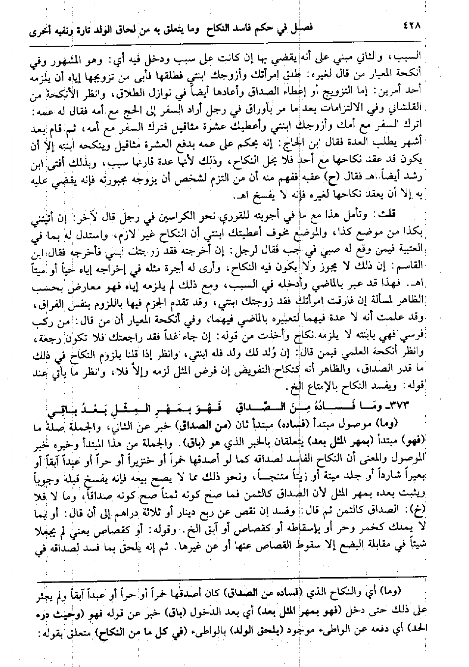السَّبَب، وَالثَّانِي مَبْنِيّ على أَنه يقْضِي بهَا إِن كَانَت على سَبَب وَدخل فِيهِ أَي: وَهُوَ الْمَشْهُور وَفِي أنكحة المعيار من قَالَ لغيره: طلق امْرَأَتك وأزوجك ابْنَتي فَطلقهَا فَأبى من تَزْوِيجهَا إِيَّاه أَن يلْزمه أحد أَمريْن: إِمَّا التَّزْوِيج أَو إِعْطَاء الصَدَاق وأعادها أَيْضا فِي نَوَازِل الطَّلَاق، وَانْظُر الْأَنْكِحَة من القلشاني وَفِي الالتزامات بعد مَا مر بأوراق فِي رجل أَرَادَ السّفر إِلَى الْحَج مَعَ أمه فَقَالَ لَهُ عَمه: اترك السّفر مَعَ أمك وأزوجك ابْنَتي وَأُعْطِيك عشرَة مَثَاقِيل فَترك السّفر مَعَ أمه، ثمَّ قَامَ بعد أشهر يطْلب الْعدة فَقَالَ ابْن الْحَاج: إِنَّه يحكم على عَمه بِدفع الْعشْرَة مَثَاقِيل وينكحه ابْنَته إِلَّا أَن يكون قد عقد نِكَاحهَا مَعَ أحد فَلَا يحل النِّكَاح، وَذَلِكَ لِأَنَّهَا عدَّة قارنها سَبَب، وَبِذَلِك أفتى ابْن رشد أَيْضا اه فَقَالَ (ح) عقبه ففهم مِنْهُ أَن من الْتزم لشخص أَن يُزَوجهُ مجبورته فَإِنَّهُ يقْضِي عَلَيْهِ بِهِ إِلَّا أَن يعْقد نِكَاحهَا لغيره فَإِنَّهُ لَا يفْسخ اه. قلت: وَتَأمل هَذَا مَعَ مَا فِي أجوبته للقوري نَحْو الكراسين فِي رجل قَالَ لآخر: إِن أتيتني بِكَذَا من مَوضِع كَذَا، والموضع مخوف أَعطيتك ابْنَتي أَن النِّكَاح غير لَازم، وَاسْتدلَّ لَهُ بِمَا فِي الْعُتْبِيَّة فِيمَن وَقع لَهُ صبي فِي جب فَقَالَ لرجل: إِن أخرجته فقد زَوجتك ابْنَتي فَأخْرجهُ فَقَالَ ابْن الْقَاسِم: إِن ذَلِك لَا يجوز وَلَا يكون فِيهِ النِّكَاح، وَأرى لَهُ أُجْرَة مثله فِي إِخْرَاجه إِيَّاه حَيا أَو مَيتا اه. فَهَذَا قد عبر بالماضي وَأدْخلهُ فِي السَّبَب، وَمَعَ ذَلِك لم يلْزمه إِيَّاه فَهُوَ معَارض بِحَسب الظَّاهِر لمسألة إِن فَارَقت امْرَأَتك فقد زَوجتك ابْنَتي، وَقد تقدم الْجَزْم فِيهَا باللزوم بِنَفس الْفِرَاق، وَقد علمت أَنه لَا عدَّة فيهمَا لتعبيره بالماضي فيهمَا، وَفِي أنكحة المعيار أَن من قَالَ: من ركب فرسي فَهِيَ بابنته لَا يلْزمه نِكَاح وَأخذت من قَوْله: إِن جَاءَ غَدا فقد رَاجَعتك فَلَا تكون رَجْعَة، وَانْظُر أنكحة العلمي فِيمَن قَالَ: إِن وُلد لَك ولد فَلهُ ابْنَتي، وَانْظُر إِذا قُلْنَا بِلُزُوم النِّكَاح فِي ذَلِك مَا قدر الصَدَاق، وَالظَّاهِر أَنه كَنِكَاح التَّفْوِيض إِن فرض الْمثل لزمَه وإلاَّ فَلَا، وَانْظُر مَا يَأْتِي عِنْد قَوْله: وَيفْسد النِّكَاح بالإمتاع الخ. ومَا فَسادُهُ مِنَ الصَّداقِ فَهُوَ بمَهْرِ المِثْلِ بَعْدُ باقِي (وَمَا) مَوْصُول مُبْتَدأ (فَسَاده) مُبْتَدأ ثَان (من الصَدَاق) خبر عَن الثَّانِي، وَالْجُمْلَة صلَة مَا (فَهُوَ) مُبْتَدأ (بِمهْر الْمثل بعد) يتعلقان بالْخبر الَّذِي هُوَ (بَاقٍ) . وَالْجُمْلَة من هَذَا الْمُبْتَدَأ وَخَبره خبر الْمَوْصُول وَالْمعْنَى أَن النِّكَاح الْفَاسِد لصداقه كَمَا لَو أصدقهَا خمرًا أَو خنزيراً أَو حرا أَو عبدا آبقاً أَو بَعِيرًا شارداً أَو جلد ميتَة أَو زيتاً متنجساً، وَنَحْو ذَلِك مِمَّا لَا يَصح بَيْعه فَإِنَّهُ يفْسخ قبله وجوبا وَيثبت بعده بِمهْر الْمثل لِأَن الصَدَاق كَالثّمنِ فَمَا صَحَّ كَونه ثمنا صَحَّ كَونه صَدَاقا، وَمَا لَا فَلَا (خَ) : الصَدَاق كَالثّمنِ ثمَّ قَالَ: وَفَسَد إِن نقص عَن ربع دِينَار أَو ثَلَاثَة دَرَاهِم إِلَى أَن قَالَ: أَو بِمَا لَا يملك كخمر وحر أَو بإسقاطه أَو كقصاص أَو آبق الخ. وَقَوله: أَو كقصاص يَعْنِي لم يجعلا شَيْئا فِي مُقَابلَة الْبضْع إِلَّا سُقُوط الْقصاص عَنْهَا أَو عَن غَيرهَا. ثمَّ إِنَّه يلْحق بِمَا فسد لصداقه فِي