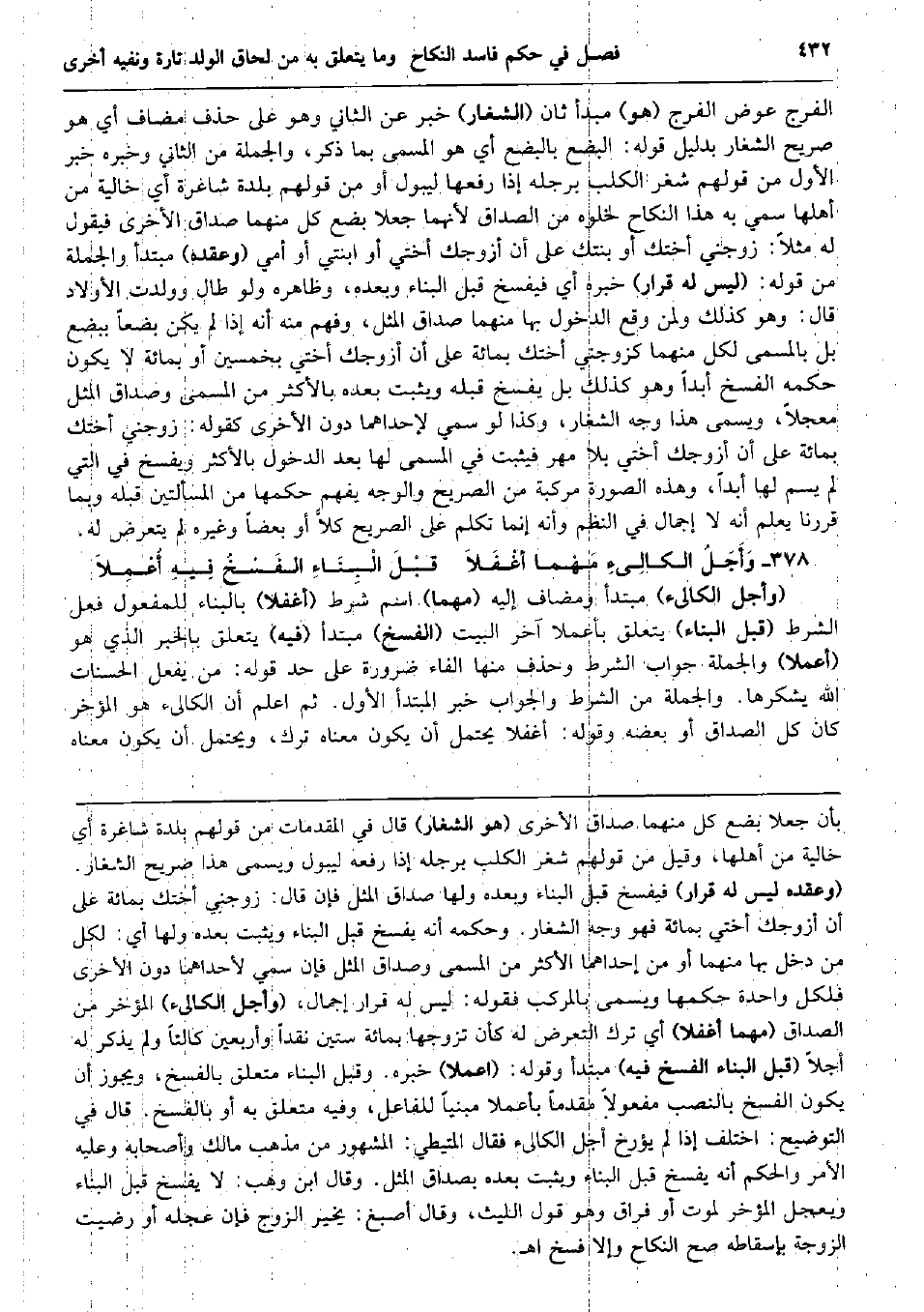 الْفرج عوض الْفرج (هُوَ) مبدأ ثَان (الشّغَار) خبر عَن الثَّانِي وَهُوَ على حذف مُضَاف أَي هُوَ صَرِيح الشّغَار بِدَلِيل قَوْله: الْبضْع بالبضع أَي هُوَ الْمُسَمّى بِمَا ذكر، وَالْجُمْلَة من الثَّانِي وَخَبره خبر الأول من قَوْلهم شغر الْكَلْب بِرجلِهِ إِذا رَفعهَا ليبول أَو من قَوْلهم بَلْدَة شاغرة أَي خَالِيَة من أَهلهَا سمي بِهِ هَذَا النِّكَاح لخلوه من الصَدَاق لِأَنَّهُمَا جعلا بضع كل مِنْهُمَا صدَاق الْأُخْرَى فَيَقُول لَهُ مثلا: زَوجنِي أختك أَو بنتك على أَن أزَوجك أُخْتِي أَو ابْنَتي أَو أُمِّي (وعقده) مُبْتَدأ وَالْجُمْلَة من قَوْله: (لَيْسَ لَهُ قَرَار) خَبره أَي فَيفْسخ قبل الْبناء وَبعده، وَظَاهره وَلَو طَال وَولدت الْأَوْلَاد قَالَ: وَهُوَ كَذَلِك وَلمن وَقع الدُّخُول بهَا مِنْهُمَا صدَاق الْمثل، وَفهم مِنْهُ أَنه إِذا لم يكن بضعاً ببضع بل بِالْمُسَمّى لكل مِنْهُمَا كزوجني أختك بِمِائَة على أَن أزَوجك أُخْتِي بِخَمْسِينَ أَو بِمِائَة لَا يكون حكمه الْفَسْخ أبدا وَهُوَ كَذَلِك بل يفْسخ قبله وَيثبت بعده بِالْأَكْثَرِ من الْمُسَمّى وصداق الْمثل معجلا وَيُسمى هَذَا وَجه الشّغَار، وَكَذَا لَو سمي لإحداهما دون الْأُخْرَى كَقَوْلِه: زَوجنِي أختك بِمِائَة على أَن أزَوجك أُخْتِي بِلَا مهر فَيثبت فِي الْمُسَمّى لَهَا بعد الدُّخُول بِالْأَكْثَرِ وَيفْسخ فِي الَّتِي لم يسم لَهَا أبدا، وَهَذِه الصُّورَة مركبة من الصَّرِيح وَالْوَجْه يفهم حكمهَا من الْمَسْأَلَتَيْنِ قبله وَبِمَا قَررنَا يعلم أَنه لَا إِجْمَال فِي النّظم وَأَنه إِنَّمَا تكلم على الصَّرِيح كلاًّ أَو بَعْضًا وَغَيره لم يتَعَرَّض لَهُ. وَأَجَلُ الكالِىءِ مَهْما أغْفَلاَ قبْلَ الْبِنَاءِ الفَسْخُ فِيهِ أُعْمِلاَ (وَأجل الكالىء) مُبْتَدأ ومضاف إِلَيْهِ (مهما) اسْم شَرط (أغفلا) بِالْبِنَاءِ للْمَفْعُول فعل الشَّرْط (قبل الْبناء) يتَعَلَّق بأعملا آخر الْبَيْت (الْفَسْخ) مُبْتَدأ (فِيهِ) يتَعَلَّق بالْخبر الَّذِي هُوَ (أعملا) وَالْجُمْلَة جَوَاب الشَّرْط وَحذف مِنْهَا الْفَاء ضَرُورَة على حد قَوْله: من يفعل الْحَسَنَات الله يشكرها. وَالْجُمْلَة من الشَّرْط وَالْجَوَاب خبر الْمُبْتَدَأ الأول. ثمَّ اعْلَم أَن الكالىء هُوَ الْمُؤخر كَانَ كل الصَدَاق أَو بعضه وَقَوله: أغفلا يحْتَمل أَن يكون مَعْنَاهُ ترك، وَيحْتَمل أَن يكون مَعْنَاهُ