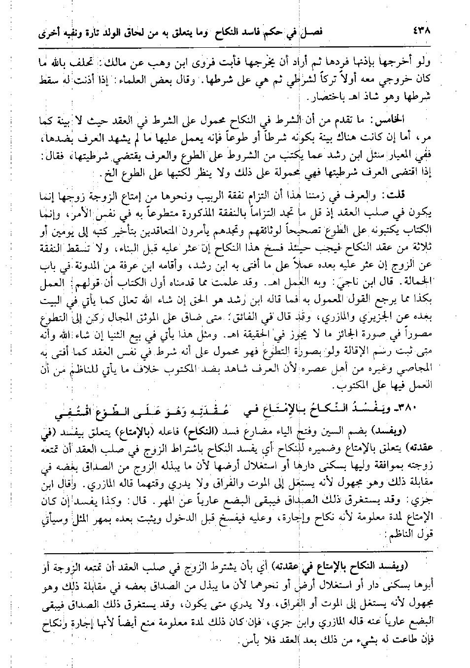 وَلَو أخرجهَا بِإِذْنِهَا فَردهَا ثمَّ أَرَادَ أَن يُخرجهَا فَأَبت فروى ابْن وهب عَن مَالك: تحلف بِاللَّه مَا كَانَ خروجي مَعَه أَولا تركا لشرطي ثمَّ هِيَ على شَرطهَا. وَقَالَ بعض الْعلمَاء: إِذا أَذِنت لَهُ سقط شَرطهَا وَهُوَ شَاذ اه بِاخْتِصَار. الْخَامِس: مَا تقدم من أَن الشَّرْط فِي النِّكَاح مَحْمُول على الشَّرْط فِي العقد حَيْثُ لَا بَيِّنَة كَمَا مر، أما إِن كَانَت هُنَاكَ بَيِّنَة بِكَوْنِهِ شرطا أَو طَوْعًا فَإِنَّهُ يعْمل عَلَيْهَا مَا لم يشْهد الْعرف بضدها، فَفِي المعيار سُئِلَ ابْن رشد عَمَّا يكْتب من الشُّرُوط على الطوع وَالْعرْف يَقْتَضِي شرطيتها، فَقَالَ: إِذا اقْتضى الْعرف شرطيتها فَهِيَ مَحْمُولَة على ذَلِك وَلَا ينظر لكتبها على الطوع الخ. قلت: وَالْعرْف فِي زمننا هَذَا أَن الْتِزَام نَفَقَة الربيب وَنَحْوهَا من إمتاع الزَّوْجَة زَوجهَا إِنَّمَا يكون فِي صلب العقد إِذْ قل مَا تَجِد التزاماً بِالنَّفَقَةِ الْمَذْكُورَة مُتَطَوعا بِهِ فِي نفس الْأَمر، وَإِنَّمَا الْكتاب يكتبونه على الطوع تَصْحِيحا لوثائقهم وتجدهم يأمرون الْمُتَعَاقدين بِتَأْخِير كتبه إِلَى يَوْمَيْنِ أَو ثَلَاثَة من عقد النِّكَاح فَيجب حِينَئِذٍ فسخ هَذَا النِّكَاح إِن عثر عَلَيْهِ قبل الْبناء، وَلَا تسْقط النَّفَقَة عَن الزَّوْج إِن عثر عَلَيْهِ بعده عملا على مَا أفتى بِهِ ابْن رشد، وأقامه ابْن عَرَفَة من الْمُدَوَّنَة فِي بَاب الْحمالَة. قَالَ ابْن نَاجِي: وَبِه الْعَمَل اه. وَقد علمت مِمَّا قدمْنَاهُ أول الْكتاب أَن قَوْلهم: الْعَمَل بِكَذَا مِمَّا يرجع القَوْل الْمَعْمُول بِهِ فَمَا قَالَه ابْن رشد هُوَ الْحق إِن شَاءَ الله تَعَالَى كَمَا يَأْتِي فِي الْبَيْت بعده عَن الجزيري والمازري، وَقد قَالَ فِي الْفَائِق: مَتى ضَاقَ على الموثق المجال ركن إِلَى التَّطَوُّع مصوراً فِي صُورَة الْجَائِز مَا لَا يجوز فِي الْحَقِيقَة اه. وَمثل هَذَا يَأْتِي فِي بيع الثنيا إِن شَاءَ الله وَأَنه مَتى ثَبت رسم الْإِقَالَة وَلَو بِصُورَة التَّطَوُّع فَهُوَ مَحْمُول على أَنه شَرط فِي نفس العقد كَمَا أفتى بِهِ المجاصي وَغَيره من أهل عصره لِأَن الْعرف شَاهد بضد الْمَكْتُوب خلاف مَا يَأْتِي للناظم من أَن الْعَمَل فِيهَا على الْمَكْتُوب. ويَفْسُدُ النِّكاحُ بالإِمْتَاعِ فِي عُقْدَتِهِ وَهُوَ عَلَى الطّوْع اقْتُفِي (وَيفْسد) بِضَم السِّين وَفتح الْيَاء مضارع فسد (النِّكَاح) فَاعله (بالإمتاع) يتَعَلَّق بيفسد (فِي عقدته) يتَعَلَّق بالإمتاع وضميره للنِّكَاح أَي يفْسد النِّكَاح بِاشْتِرَاط الزَّوْج فِي صلب العقد أَن تمتعه زَوجته بموافقة وَليهَا بسكنى دارها أَو استغلال أرْضهَا لِأَن مَا يبذله الزَّوْج من الصَدَاق بعضه فِي مُقَابلَة ذَلِك وَهُوَ مَجْهُول لِأَنَّهُ يستغل إِلَى الْمَوْت والفراق وَلَا يدْرِي وقتهما قَالَه الْمَازرِيّ. وَقَالَ ابْن جزي: وَقد يسْتَغْرق ذَلِك الصَدَاق فَيبقى الْبضْع عَارِيا عَن الْمهْر. قَالَ: وَكَذَا يفْسد إِن كَانَ الإمتاع لمُدَّة مَعْلُومَة لِأَنَّهُ نِكَاح وَإِجَارَة، وَعَلِيهِ فَيفْسخ قبل الدُّخُول وَيثبت بعده بِمهْر الْمثل وَسَيَأْتِي قَول النَّاظِم: