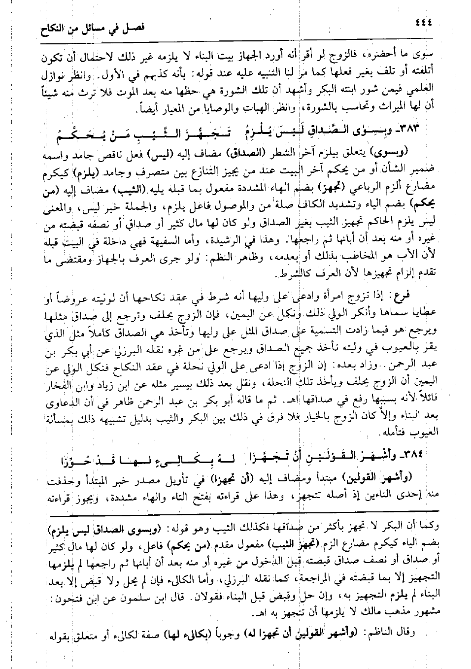 1648 - ; ى الصَّداقِ لَيْسَ يُلْزِمُ تَجَهُّزَ الثَّيِّبِ مَنْ يُحَكَّمُ (وبسوى) يتَعَلَّق بيلزم آخر الشّطْر (الصَدَاق) مُضَاف إِلَيْهِ (لَيْسَ) فعل نَاقص جامد واسْمه ضمير الشَّأْن أَو من يحكم آخر الْبَيْت عِنْد من يُجِيز التَّنَازُع بَين متصرف وجامد (يلْزم) كيكرم مضارع ألزم الرباعي (تجهز) بِضَم الْهَاء الْمُشَدّدَة مفعول بِمَا قبله يَلِيهِ (الثّيّب) مُضَاف إِلَيْهِ (من يحكم) بِضَم الْيَاء وَتَشْديد الْكَاف صلَة من والموصول فَاعل يلْزم وَالْجُمْلَة خبر لَيْسَ، وَالْمعْنَى لَيْسَ يلْزم الْحَاكِم تجهيز الثّيّب بِغَيْر الصَدَاق وَلَو كَانَ لَهَا مَال كثير أَو صدَاق أَو نصفه قَبضته من غَيره أَو مِنْهُ بعد أَن أَبَانهَا ثمَّ رَاجعهَا. وَهَذَا فِي الرشيدة، وَأما السفيهة فَهِيَ دَاخِلَة فِي الْبَيْت قبله لِأَن الْأَب هُوَ الْمُخَاطب بذلك أَو بِعَدَمِهِ، وَظَاهر النّظم: وَلَو جرى الْعرف بالجهاز وَمُقْتَضى مَا تقدم إِلْزَام تجهيزها لِأَن الْعرف كالشرط. فرع: إِذا تزوج امْرَأَة وَادّعى على وَليهَا أَنه شَرط فِي عقد نِكَاحهَا أَن لوليته عرُوضا أَو عطايا سَمَّاهَا وَأنكر الْوَلِيّ ذَلِك وَنكل عَن الْيَمين، فَإِن الزَّوْج يحلف وَترجع إِلَى صدَاق مثلهَا وَيرجع هُوَ فِيمَا زَادَت التَّسْمِيَة على صدَاق الْمثل على وَليهَا وَتَأْخُذ هِيَ الصَدَاق كَامِلا مثل الَّذِي يقر بالعيوب فِي وليته تَأْخُذ جَمِيع الصَدَاق وَيرجع على من غره نَقله الْبُرْزُليّ عَن أبي بكر بن عبد الرَّحْمَن. وَزَاد بعده: إِن الزَّوْج إِذا ادّعى على الْوَلِيّ نحلة فِي عقد النِّكَاح فنكل الْوَلِيّ عَن الْيَمين أَن الزَّوْج يحلف وَيَأْخُذ تِلْكَ النحلة، وَنقل بعد ذَلِك بِيَسِير مثله عَن ابْن زِيَاد وَابْن الفخار قَائِلا لِأَنَّهُ بِسَبَبِهَا رفع فِي صَدَاقهَا اه. ثمَّ مَا قَالَه أَبُو بكر بن عبد الرَّحْمَن ظَاهر فِي أَن الدَّعَاوَى بعد الْبناء وإلاَّ كَانَ الزَّوْج بِالْخِيَارِ فَلَا فرق فِي ذَلِك بَين الْبكر وَالثَّيِّب بِدَلِيل تشبيهه ذَلِك بِمَسْأَلَة الْعُيُوب فَتَأَمّله. وأشْهَرُ القَوْلَيْنِ أَنْ تَجَهَّزَا لهُ بِكَالِىءٍ لَهَا قَدْ حُوِّزا (وَأشهر الْقَوْلَيْنِ) مُبْتَدأ ومضاف إِلَيْهِ (أَن تجهزا) فِي تَأْوِيل مصدر خبر الْمُبْتَدَأ وحذفت مِنْهُ إِحْدَى التَّاءَيْنِ إِذْ أَصله تتجهز، وَهَذَا على قِرَاءَته بِفَتْح التَّاء وَالْهَاء مُشَدّدَة، وَيجوز قِرَاءَته