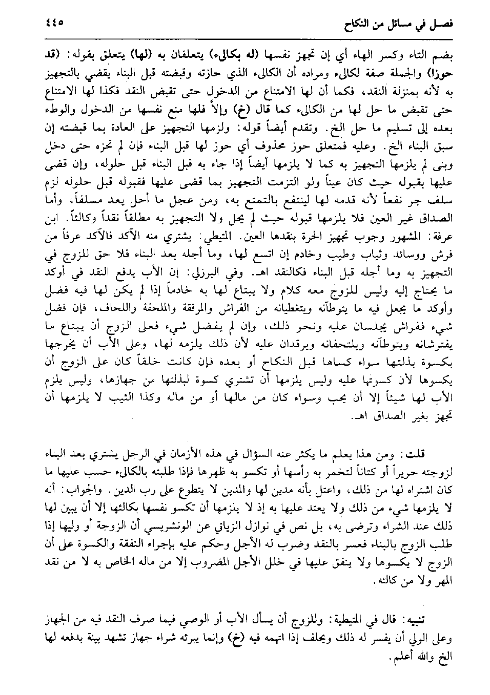 بِضَم التَّاء وَكسر الْهَاء أَي إِن تجهز نَفسهَا (لَهُ بكالىء) يتعلقان بِهِ (لَهَا) يتَعَلَّق بقوله: (قد حوزا) وَالْجُمْلَة صفة لكالىء وَمرَاده أَن الكالىء الَّذِي حازته وقبضته قبل الْبناء يقْضِي بالتجهيز بِهِ لِأَنَّهُ بِمَنْزِلَة النَّقْد، فَكَمَا أَن لَهَا الِامْتِنَاع من الدُّخُول حَتَّى تقبض النَّقْد فَكَذَا لَهَا الِامْتِنَاع حَتَّى تقبض مَا حل لَهَا من الكالىء كَمَا قَالَ (خَ) وإلاَّ فلهَا منع نَفسهَا من الدُّخُول وَالْوَطْء بعده إِلَى تَسْلِيم مَا حل الخ. وَتقدم أَيْضا قَوْله: ولزمها التَّجْهِيز على الْعَادة بِمَا قَبضته إِن سبق الْبناء الخ. وَعَلِيهِ فمتعلق حوز مَحْذُوف أَي حوز لَهَا قبل الْبناء فَإِن لم تحزه حَتَّى دخل وَبنى لم يلْزمهَا التَّجْهِيز بِهِ كَمَا لَا يلْزمهَا أَيْضا إِذا جَاءَ بِهِ قبل الْبناء قبل حُلُوله، وَإِن قضى عَلَيْهَا بقبوله حَيْثُ كَانَ عينا وَلَو التزمت التَّجْهِيز بِمَا قضى عَلَيْهَا فقبوله قبل حُلُوله لزم سلف جر نفعا لِأَنَّهُ قدمه لَهَا لينْتَفع بالتمتع بِهِ، وَمن عجل مَا أحل يعد مسلفاً، وَأما الصَدَاق غير الْعين فَلَا يلْزمهَا قبُوله حَيْثُ لم يحل وَلَا التَّجْهِيز بِهِ مُطلقًا نَقْدا وكالئاً. ابْن عَرَفَة: الْمَشْهُور وجوب تجهيز الْحرَّة بنقدها الْعين. المتيطي: يَشْتَرِي مِنْهُ الآكد فالآكد عرفا من فرش ووسائد وَثيَاب وَطيب وخادم إِن اتَّسع لَهَا، وَمَا أَجله بعد الْبناء فَلَا حق للزَّوْج فِي التَّجْهِيز بِهِ وَمَا أَجله قبل الْبناء فكالنقد اه. وَفِي الْبُرْزُليّ: إِن الْأَب يدْفع النَّقْد فِي أوكد مَا يحْتَاج إِلَيْهِ وَلَيْسَ للزَّوْج مَعَه كَلَام وَلَا يبْتَاع لَهَا بِهِ خَادِمًا إِذا لم يكن لَهَا فِيهِ فضل وأوكد مَا يَجْعَل فِيهِ مَا يتوطآنه ويتغطيانه من الْفراش والمرفقة والملحفة واللحاف، فَإِن فضل شَيْء ففراش يجلسان عَلَيْهِ وَنَحْو ذَلِك، وَإِن لم يفضل شَيْء فعلى الزَّوْج أَن يبْتَاع مَا يفترشانه ويتوطآنه ويلتحفانه ويرقدان عَلَيْهِ لِأَن ذَلِك يلْزمه لَهَا، وعَلى الْأَب أَن يُخرجهَا بكسوة بذلتها سَوَاء كساها قبل النِّكَاح أَو بعده فَإِن كَانَت خلقا كَانَ على الزَّوْج أَن يَكْسُوهَا لِأَن كسوتها عَلَيْهِ وَلَيْسَ يلْزمهَا أَن تشتري كسْوَة لبذلتها من جهازها، وَلَيْسَ يلْزم الْأَب لَهَا شَيْئا إِلَّا أَن يحب وَسَوَاء كَانَ من مَالهَا أَو من مَاله وَكَذَا الثّيّب لَا يلْزمهَا أَن تجهز بِغَيْر الصَدَاق اه. قلت: وَمن هَذَا يعلم مَا يكثر عَنهُ السُّؤَال فِي هَذِه الْأَزْمَان فِي الرجل يَشْتَرِي بعد الْبناء لزوجته حَرِيرًا أَو كتاناً لتخمر بِهِ رَأسهَا أَو تكسو بِهِ ظهرهَا فَإِذا طلبته بالكالىء حسب عَلَيْهَا مَا كَانَ اشْتَرَاهُ لَهَا من ذَلِك واعتل بِأَنَّهُ مَدين لَهَا والمدين لَا يتَطَوَّع على رب الدّين. وَالْجَوَاب: أَنه لَا يلْزمهَا شَيْء من ذَلِك وَلَا يعْتد عَلَيْهَا بِهِ إِذْ لَا يلْزمهَا أَن تكسو نَفسهَا بكالئها إِلَّا أَن يبين لَهَا ذَلِك عِنْد الشِّرَاء وترضى بِهِ، بل نَص فِي نَوَازِل الزياتي عَن الونشريسي أَن الزَّوْجَة أَو وَليهَا إِذا طلب الزَّوْج بِالْبِنَاءِ فعسر بِالنَّقْدِ وَضرب لَهُ الْأَجَل وَحكم عَلَيْهِ بإجراء النَّفَقَة وَالْكِسْوَة على أَن الزَّوْج لَا يَكْسُوهَا وَلَا ينْفق عَلَيْهَا فِي خلل الْأَجَل الْمَضْرُوب إِلَّا من مَاله الْخَاص بِهِ لَا من نقد الْمهْر وَلَا من كالئه. تَنْبِيه: قَالَ فِي الْمُتَيْطِيَّة: وَللزَّوْج أَن يسْأَل الْأَب أَو الْوَصِيّ فِيمَا صرف النَّقْد فِيهِ من الجهاز وعَلى الْوَلِيّ أَن يُفَسر لَهُ ذَلِك وَيحلف إِذا اتهمه فِيهِ (خَ) وَإِنَّمَا يُبرئهُ شِرَاء جهاز تشهد بَيِّنَة بِدَفْعِهِ لَهَا الخ وَالله أعلم.