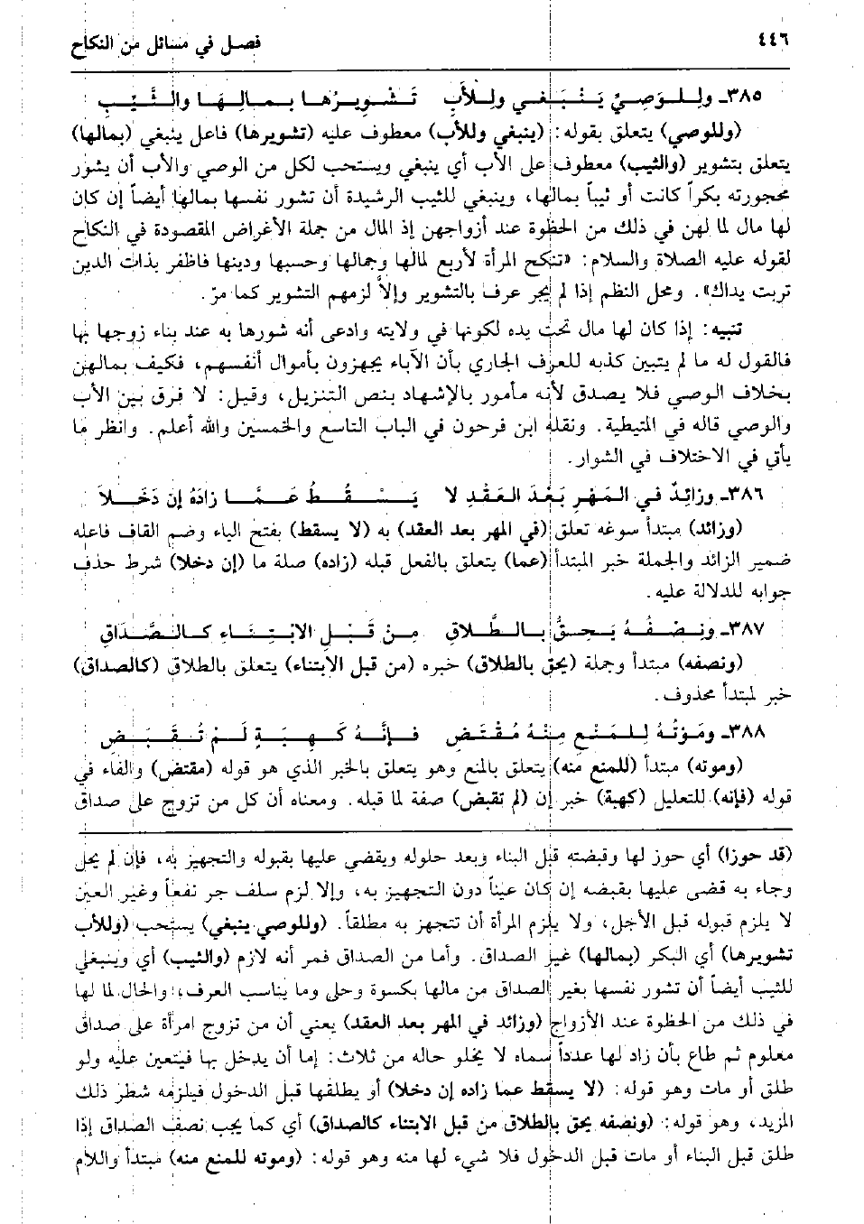 ولِلوَصِيِّ يَنْبَغي ولِلأَبِ تَشْوِيرُها بمالِهَا والثَّيِّبِ (وللوصي) يتَعَلَّق بقوله: (يَنْبَغِي وَللْأَب) مَعْطُوف عَلَيْهِ (تشويرها) فَاعل يَنْبَغِي (بمالها) يتَعَلَّق بتشوير (وَالثَّيِّب) مَعْطُوف على الْأَب أَي يَنْبَغِي وَيسْتَحب لكل من الْوَصِيّ وَالْأَب أَن يشور محجورته بكرا كَانَت أَو ثَيِّبًا بمالها، وَيَنْبَغِي للثيب الرشيدة أَن تشور نَفسهَا بمالها أَيْضا إِن كَانَ لَهَا مَال لما لَهُنَّ فِي ذَلِك من الحظوة عِنْد أَزوَاجهنَّ إِذْ المَال من جملَة الْأَغْرَاض الْمَقْصُودَة فِي النِّكَاح لقَوْله عَلَيْهِ الصَّلَاة وَالسَّلَام: (تنْكح الْمَرْأَة لأَرْبَع لمالها وجمالها وحسبها ودينها فاظفر بِذَات الدّين تربت يداك) . وَمحل النّظم إِذا لم يجر عرف بالتشوير وإلاَّ لَزِمَهُم التشوير كَمَا مرّ. تَنْبِيه: إِذا كَانَ لَهَا مَال تَحت يَده لكَونهَا فِي ولَايَته وَادّعى أَنه شورها بِهِ عِنْد بِنَاء زَوجهَا بهَا فَالْقَوْل لَهُ مَا لم يتَبَيَّن كذبه للْعُرْف الْجَارِي بِأَن الْآبَاء يجهزون بأموال أنفسهم، فَكيف بمالهن بِخِلَاف الْوَصِيّ فَلَا يصدق لِأَنَّهُ مَأْمُور بِالْإِشْهَادِ بِنَصّ التَّنْزِيل، وَقيل: لَا فرق بَين الْأَب وَالْوَصِيّ قَالَه فِي الْمُتَيْطِيَّة. وَنَقله ابْن فَرِحُونَ فِي الْبَاب التَّاسِع وَالْخمسين وَالله أعلم. وَانْظُر مَا يَأْتِي فِي الِاخْتِلَاف فِي الشوار. وزائِدٌ فِي المَهْرِ بَعْدَ العَقْدِ لَا يَسْقُطُ عَمَّا زادَهُ إِن دَخَلاَ (وزائد) مُبْتَدأ سوغه تعلق (فِي الْمهْر بعد العقد) بِهِ (لَا يسْقط) بِفَتْح الْيَاء وَضم الْقَاف فَاعله ضمير الزَّائِد وَالْجُمْلَة خبر الْمُبْتَدَأ (عَمَّا) يتَعَلَّق بِالْفِعْلِ قبله (زَاده) صلَة مَا (إِن دخلا) شَرط حذف جَوَابه للدلالة عَلَيْهِ. ونِصْفُهُ يَحِقُّ بالطَّلاقِ مِنْ قَبْلِ الابْتِنَاءِ كالصَّدَاقِ (وَنصفه) مُبْتَدأ وَجُمْلَة (يحِق بِالطَّلَاق) خَبره (من قبل الابتناء) يتَعَلَّق بِالطَّلَاق (كالصداق) خبر لمبتدأ مَحْذُوف. ومَوْتُهُ لِلمَنْعِ مِنْهُ مُقْتَضِ فإنَّهُ كَهِبَةٍ لَمْ تُقَبَضِ (وَمَوته) مُبْتَدأ (للْمَنْع مِنْهُ) يتَعَلَّق بِالْمَنْعِ وَهُوَ يتَعَلَّق بالْخبر الَّذِي هُوَ قَوْله (مُقْتَض) وَالْفَاء فِي قَوْله (فَإِنَّهُ) للتَّعْلِيل (كَهِبَة) خبر إِن (لم تقبض) صفة لما قبله. وَمَعْنَاهُ أَن كل من تزوج على صدَاق
