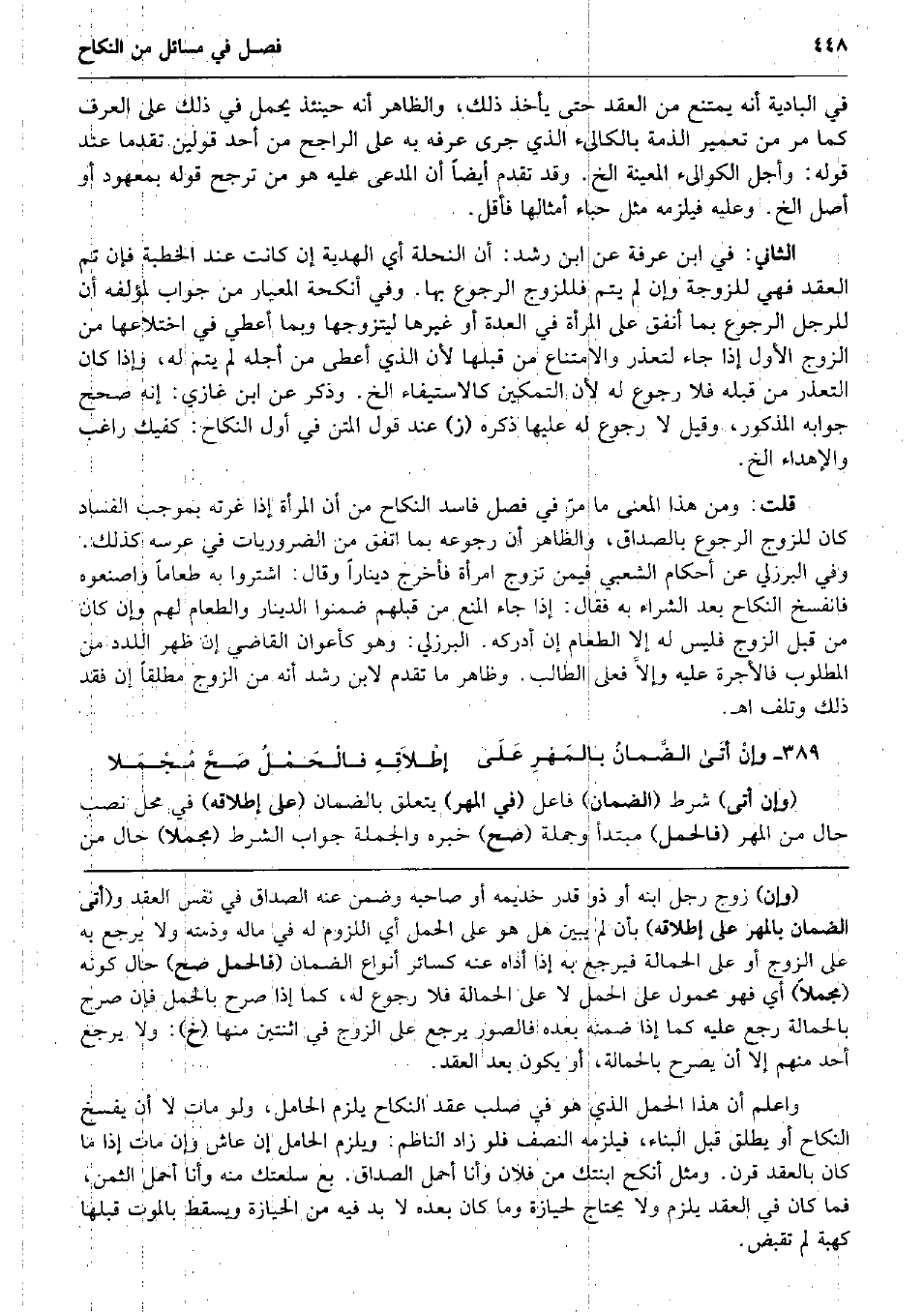 1648 - ; الضَّمانُ بالمَهْرِ عَلَى إطْلاَقِهِ فالْحَمْلُ صَحَّ مُجْمَلا (وَإِن أَتَى) شَرط (الضَّمَان) فَاعل (فِي الْمهْر) يتَعَلَّق بِالضَّمَانِ (على إِطْلَاقه) فِي مَحل نصب حَال من الْمهْر (فالحمل) مُبْتَدأ وَجُمْلَة (صَحَّ) خَبره وَالْجُمْلَة جَوَاب الشَّرْط (مُجملا) حَال من