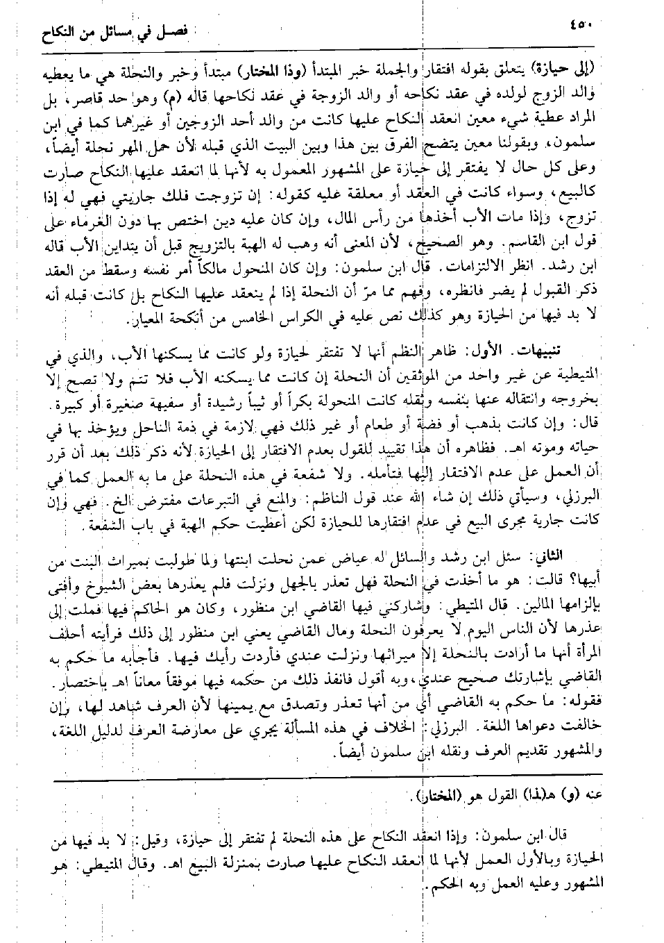 (إِلَى حِيَازَة) يتَعَلَّق بقوله افتقار وَالْجُمْلَة خبر الْمُبْتَدَأ (وَذَا الْمُخْتَار) مُبْتَدأ وَخبر والنحلة هِيَ مَا يُعْطِيهِ وَالِد الزَّوْج لوَلَده فِي عقد نِكَاحه أَو وَالِد الزَّوْجَة فِي عقد نِكَاحهَا قَالَه (م) وَهُوَ حد قَاصِر، بل المُرَاد عَطِيَّة شَيْء معِين انْعَقَد النِّكَاح عَلَيْهَا كَانَت من وَالِد أحد الزَّوْجَيْنِ أَو غَيرهمَا كَمَا فِي ابْن سَلمُون، وبقولنا معِين يَتَّضِح الْفرق بَين هَذَا وَبَين الْبَيْت الَّذِي قبله لِأَن حمل الْمهْر نحلة أَيْضا، وعَلى كل حَال لَا يفْتَقر إِلَى حِيَازَة على الْمَشْهُور الْمَعْمُول بِهِ لِأَنَّهَا لما انْعَقَد عَلَيْهَا النِّكَاح صَارَت كَالْبيع، وَسَوَاء كَانَت فِي العقد أَو معلقَة عَلَيْهِ كَقَوْلِه: إِن تزوجت فلك جاريتي فَهِيَ لَهُ إِذا تزوج، وَإِذا مَاتَ الْأَب أَخذهَا من رَأس المَال وَإِن كَانَ عَلَيْهِ دين اخْتصَّ بهَا دون الْغُرَمَاء على قَول ابْن الْقَاسِم. وَهُوَ الصَّحِيح، لِأَن الْمَعْنى أَنه وهب لَهُ الْهِبَة بِالتَّزْوِيجِ قبل أَن يتداين الْأَب قَالَه ابْن رشد. انْظُر الالتزامات. قَالَ ابْن سَلمُون: وَإِن كَانَ المنحول مَالِكًا أَمر نَفسه وَسقط من العقد ذكر الْقبُول لم يضر فَانْظُرْهُ، وَفهم مِمَّا مرّ أَن النحلة إِذا لم ينْعَقد عَلَيْهَا النِّكَاح بل كَانَت قبله أَنه لَا بُد فِيهَا من الْحِيَازَة وَهُوَ كَذَلِك نَص عَلَيْهِ فِي الكراس الْخَامِس من أنكحة المعيار. تَنْبِيهَات. الأول: ظَاهر النّظم أَنَّهَا لَا تفْتَقر لحيازة وَلَو كَانَت مِمَّا يسكنهَا الْأَب، وَالَّذِي فِي الْمُتَيْطِيَّة عَن غير وَاحِد من الموثقين أَن النحلة إِن كَانَت مِمَّا يسكنهُ الْأَب فَلَا تتمّ وَلَا تصح إِلَّا بِخُرُوجِهِ وانتقاله عَنْهَا بِنَفسِهِ وَثقله كَانَت المنحولة بكرا أَو ثَيِّبًا رَشِيدَة أَو سَفِيهَة صَغِيرَة أَو كَبِيرَة. قَالَ: وَإِن كَانَت بِذَهَب أَو فضَّة أَو طَعَام أَو غير ذَلِك فَهِيَ لَازِمَة فِي ذمَّة الناحل وَيُؤْخَذ بهَا فِي حَيَاته وَمَوته اه. فَظَاهره أَن هَذَا تَقْيِيد لِلْقَوْلِ بِعَدَمِ الافتقار إِلَى الْحِيَازَة لِأَنَّهُ ذكر ذَلِك بعد أَن قرر أَن الْعَمَل على عدم الافتقار إِلَيْهَا فَتَأَمّله. وَلَا شُفْعَة فِي هَذِه النحلة على مَا بِهِ الْعَمَل كَمَا فِي الْبُرْزُليّ، وَسَيَأْتِي ذَلِك إِن شَاءَ الله عِنْد قَول النَّاظِم: وَالْمَنْع فِي التَّبَرُّعَات مفترض الخ. فَهِيَ وَإِن كَانَت جَارِيَة مجْرى البيع فِي عدم افتقارها للحيازة لَكِن أَعْطَيْت حكم الْهِبَة فِي بَاب الشُّفْعَة. الثَّانِي: سُئِلَ ابْن رشد والسائل لَهُ عِيَاض عَمَّن نحلت ابْنَتهَا وَلما طولبت بميراث الْبِنْت من أَبِيهَا؟ قَالَت: هُوَ مَا أخذت فِي النحلة فَهَل تعذر بِالْجَهْلِ وَنزلت فَلم يعذرها بعض الشُّيُوخ وَأفْتى بإلزامها الْمَالَيْنِ. قَالَ المتيطي: وشاركني فِيهَا القَاضِي ابْن مَنْظُور، وَكَانَ هُوَ الْحَاكِم فِيهَا فملت إِلَى عذرها لِأَن النَّاس الْيَوْم لَا يعْرفُونَ النحلة وَمَال القَاضِي يَعْنِي ابْن مَنْظُور إِلَى ذَلِك فرأيته أَحْلف الْمَرْأَة أَنَّهَا مَا أَرَادَت بالنحلة إِلَّا مِيرَاثهَا وَنزلت عِنْدِي فَأَرَدْت رَأْيك فِيهَا. فَأَجَابَهُ مَا حكم بِهِ القَاضِي بإشارتك صَحِيح عِنْدِي، وَبِه أَقُول فانفذ ذَلِك من حكمه فِيهَا موفقاً معاناً اه بِاخْتِصَار. فَقَوله: مَا حكم بِهِ القَاضِي أَي من أَنَّهَا تعذر وَتصدق مَعَ يَمِينهَا لِأَن الْعرف شَاهد لَهَا، وَإِن خَالَفت دَعْوَاهَا اللُّغَة. الْبُرْزُليّ: الْخلاف فِي هَذِه الْمَسْأَلَة يجْرِي على مُعَارضَة الْعرف لدَلِيل اللُّغَة، وَالْمَشْهُور تَقْدِيم الْعرف وَنَقله ابْن سَلمُون أَيْضا.