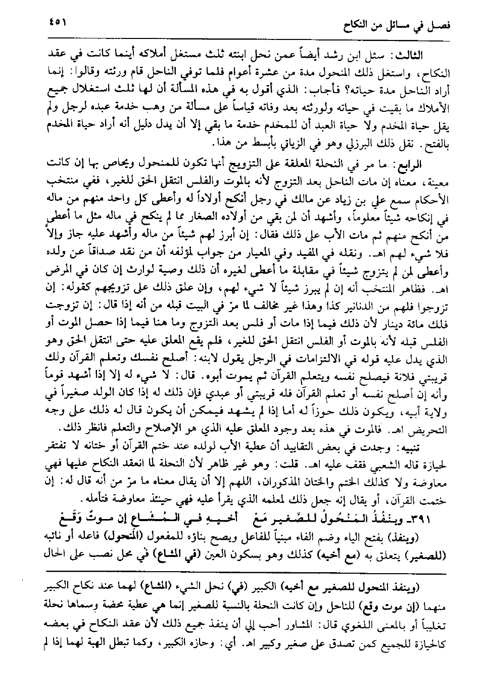 الثَّالِث: سُئِلَ ابْن رشد أَيْضا عَمَّن نحل ابْنَته ثلث مستغل أملاكه أَيْنَمَا كَانَت فِي عقد النِّكَاح، واستغل ذَلِك المنحول مُدَّة من عشرَة أَعْوَام فَلَمَّا توفّي الناحل قَامَ ورثته وَقَالُوا: إِنَّمَا أَرَادَ الناحل مُدَّة حَيَاته؟ فَأجَاب: الَّذِي أَقُول بِهِ فِي هَذِه الْمَسْأَلَة أَن لَهَا ثلث استغلال جَمِيع الْأَمْلَاك مَا بقيت فِي حَيَاته ولورثته بعد وَفَاته قِيَاسا على مَسْأَلَة من وهب خدمَة عَبده لرجل وَلم يقل حَيَاة المخدم وَلَا حَيَاة العَبْد أَن للمخدم خدمَة مَا بَقِي إِلَّا أَن يدل دَلِيل أَنه أَرَادَ حَيَاة المخدم بِالْفَتْح. نقل ذَلِك الْبُرْزُليّ وَهُوَ فِي الزياتي بأبسط من هَذَا. الرَّابِع: مَا مر فِي النحلة الْمُعَلقَة على التَّزْوِيج أَنَّهَا تكون للمنحول ويحاص بهَا إِن كَانَت مُعينَة، مَعْنَاهُ إِن مَاتَ الناحل بعد التَّزَوُّج لِأَنَّهُ بِالْمَوْتِ والفلس انْتقل الْحق للْغَيْر، فَفِي منتخب الْأَحْكَام سمع عَليّ بن زِيَاد عَن مَالك فِي رجل أنكح أَوْلَادًا لَهُ وَأعْطى كل وَاحِد مِنْهُم من مَاله فِي إنكاحه شَيْئا مَعْلُوما، وَأشْهد أَن لمن بَقِي من أَوْلَاده الصغار مِمَّا لم ينْكح فِي مَاله مثل مَا أعْطى من أنكح مِنْهُم ثمَّ مَاتَ الْأَب على ذَلِك فَقَالَ: إِن أبرز لَهُم شَيْئا من مَاله وَأشْهد عَلَيْهِ جَازَ وإلاَّ فَلَا شَيْء لَهُم اه. وَنَقله فِي الْمُفِيد وَفِي المعيار من جَوَاب لمؤلفه أَن من نقد صَدَاقا عَن وَلَده وَأعْطى لمن لم يتَزَوَّج شَيْئا فِي مُقَابلَة مَا أعْطى لغيره أَن ذَلِك وَصِيَّة لوَارث إِن كَانَ فِي الْمَرَض اه. فَظَاهر الْمُنْتَخب أَنه إِن لم يبرز شَيْئا لَا شَيْء لَهُم، وَإِن علق ذَلِك على تزويجهم كَقَوْلِه: إِن تزوجوا فَلهم من الدَّنَانِير كَذَا وَهَذَا غير مُخَالف لما مرّ فِي الْبَيْت قبله من أَنه إِذا قَالَ: إِن تزوجت فلك مائَة دِينَار لِأَن ذَلِك فِيمَا إِذا مَاتَ أَو فلس بعد التَّزَوُّج وَمَا هُنَا فِيمَا إِذا حصل الْمَوْت أَو الْفلس قبله لِأَنَّهُ بِالْمَوْتِ أَو الْفلس انْتقل الْحق للْغَيْر، فَلم يَقع الْمُعَلق عَلَيْهِ حَتَّى انْتقل الْحق وَهُوَ الَّذِي يدل عَلَيْهِ قَوْله فِي الالتزامات فِي الرجل يَقُول لِابْنِهِ: أصلح نَفسك وَتعلم الْقُرْآن وَلَك قريبتي فُلَانَة فيصلح نَفسه ويتعلم الْقُرْآن ثمَّ يَمُوت أَبوهُ. قَالَ: لَا شَيْء لَهُ إِلَّا إِذا أشهد قوما وَأَنه إِن أصلح نَفسه أَو تعلم الْقُرْآن فَلهُ قريبتي أَو عَبدِي فَإِن ذَلِك لَهُ إِذا كَانَ الْوَلَد صَغِيرا فِي ولَايَة أَبِيه، وَيكون ذَلِك حوزاً لَهُ أما إِذا لم يشْهد فَيمكن أَن يكون قَالَ لَهُ ذَلِك على وَجه التحريض اه. فالموت فِي هَذِه بعد وجود الْمُعَلق عَلَيْهِ الَّذِي هُوَ الْإِصْلَاح والتعلم فَانْظُر ذَلِك. تَنْبِيه: وجدت فِي بعض التقاييد أَن عَطِيَّة الْأَب لوَلَده عِنْد ختم الْقُرْآن أَو ختانه لَا تفْتَقر لحيازة قَالَه الشّعبِيّ فقف عَلَيْهِ اه. قلت: وَهُوَ غير ظَاهر لِأَن النحلة لما انْعَقَد النِّكَاح عَلَيْهَا فَهِيَ مُعَاوضَة وَلَا كَذَلِك الْخَتْم والختان الْمَذْكُورَان، اللَّهُمَّ إِلَّا أَن يُقَال مَعْنَاهُ مَا مرّ من أَنه قَالَ لَهُ: إِن ختمت الْقُرْآن، أَو يُقَال إِنَّه جعل ذَلِك لمعلمه الَّذِي يقْرَأ عَلَيْهِ فَهِيَ حِينَئِذٍ مُعَاوضَة فَتَأَمّله. وينْفُذُ المَنْحُولُ للصَّغير مَعْ أخيهِ فِي المُشَاعِ إِن موتٌ وَقَعْ (وَينفذ) بِفَتْح الْيَاء وَضم الْفَاء مَبْنِيا للْفَاعِل وَيصِح بِنَاؤُه للْمَفْعُول (المنحول) فَاعله أَو نَائِبه (للصَّغِير) يتَعَلَّق بِهِ (مَعَ أَخِيه) كَذَلِك وَهُوَ بِسُكُون الْعين (فِي الْمشَاع) فِي مَحل نصب على الْحَال
