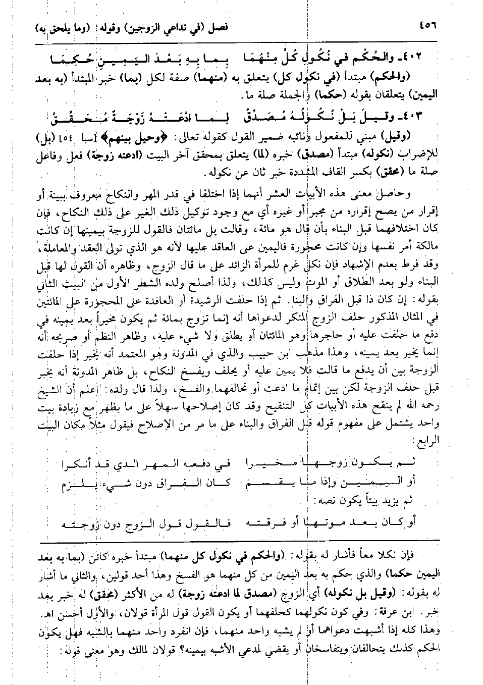 والحُكْم فِي نُكُولِ كُلَ مِنْهُمَا بِما بِهِ بَعْدَ اليَمِينِ حُكِمَا (وَالْحكم) مُبْتَدأ (فِي نُكُول كل) يتَعَلَّق بِهِ (مِنْهُمَا) صفة لكل (بِمَا) خبر الْمُبْتَدَأ (بِهِ بعد الْيَمين) يتعلقان بقوله (حكما) وَالْجُمْلَة صلَة مَا. وقيلَ بَلْ نُكُولُهُ مُصَدِّقُ لِما ادَّعَتْهُ زَوْجَةٌ مُحَقِّقُ (وَقيل) مَبْنِيّ للْمَفْعُول ونائبه ضمير القَوْل كَقَوْلِه تَعَالَى: وحيل بَينهم} (سبأ: 54) (بل) للإضراب (نُكُوله) مُبْتَدأ (مُصدق) خَبره (لما) يتَعَلَّق بمحقق آخر الْبَيْت (ادَّعَتْهُ زَوْجَة) فعل وفاعل صلَة مَا (مُحَقّق) بِكَسْر الْقَاف الْمُشَدّدَة خبر ثَان عَن نُكُوله. وَحَاصِل معنى هَذِه الأبيات الْعشْر أَنَّهُمَا إِذا اخْتلفَا فِي قدر الْمهْر وَالنِّكَاح مَعْرُوف بِبَيِّنَة أَو إِقْرَار من يَصح إِقْرَاره من مجبر أَو غَيره أَي مَعَ وجود تَوْكِيل ذَلِك الْغَيْر على ذَلِك النِّكَاح، فَإِن كَانَ اخْتِلَافهمَا قبل الْبناء بِأَن قَالَ هُوَ مائَة، وَقَالَت بل مِائَتَان فَالْقَوْل للزَّوْجَة بِيَمِينِهَا إِن كَانَت مالكة أَمر نَفسهَا وَإِن كَانَت محجورة فاليمين على الْعَاقِد عَلَيْهَا لِأَنَّهُ هُوَ الَّذِي تولى العقد والمعاملة، وَقد فرط بِعَدَمِ الْإِشْهَاد فَإِن نكل غرم للْمَرْأَة الزَّائِد على مَا قَالَ الزَّوْج، وَظَاهره أَن القَوْل لَهَا قبل الْبناء وَلَو بعد الطَّلَاق أَو الْمَوْت وَلَيْسَ كَذَلِك، وَلذَا أصلح وَلَده الشّطْر الأول من الْبَيْت الثَّانِي بقوله: إِن كَانَ ذَا قبل الْفِرَاق والبنا. ثمَّ إِذا حَلَفت الرشيدة أَو العاقدة على المحجورة على الْمِائَتَيْنِ فِي الْمِثَال الْمَذْكُور حلف الزَّوْج الْمُنكر لدعواها أَنه إِنَّمَا تزوج بِمِائَة ثمَّ يكون مُخَيّرا بعد يَمِينه فِي دفع مَا حَلَفت عَلَيْهِ أَو حاجرها وَهُوَ المائتان أَو يُطلق وَلَا شَيْء عَلَيْهِ، وَظَاهر النّظم أَو صَرِيحه أَنه إِنَّمَا يُخَيّر بعد يَمِينه، وَهَذَا مَذْهَب ابْن حبيب وَالَّذِي فِي الْمُدَوَّنَة وَهُوَ الْمُعْتَمد أَنه يُخَيّر إِذا حَلَفت الزَّوْجَة بَين أَن يدْفع مَا قَالَت فَلَا يَمِين عَلَيْهِ أَو يحلف وَيفْسخ النِّكَاح، بل ظَاهر الْمُدَوَّنَة أَنه يخبر قبل حلف الزَّوْجَة لَكِن بَين إتْمَام مَا ادَّعَت أَو تحالفهما وَالْفَسْخ، وَلذَا قَالَ وَلَده: اعْلَم أَن الشَّيْخ رَحمَه الله لم ينقح هَذِه الأبيات كل التَّنْقِيح وَقد كَانَ إصلاحها سهلاً على مَا يظْهر مَعَ زِيَادَة بَيت وَاحِد يشْتَمل على مَفْهُوم قَوْله قبل الْفِرَاق وَالْبناء على مَا مر من الْإِصْلَاح فَيَقُول مثلا مَكَان الْبَيْت الرَّابِع: ثمَّ يكون زَوجهَا مُخَيّرا فِي دَفعه الْمهْر الَّذِي قد أنكرا أَو الْيَمين وَإِذا مَا يقسم كَانَ الْفِرَاق دون شَيْء يلْزم ثمَّ يزِيد بَيْتا يكون نَصه: أَو كَانَ بعد مَوتهَا أَو فرقته فَالْقَوْل قَول الزَّوْج دون زَوجته