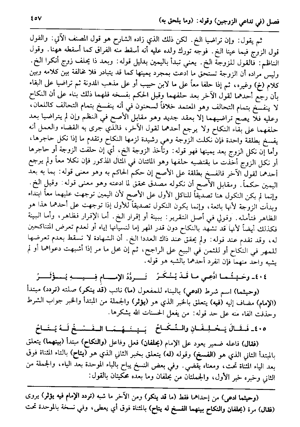 ثمَّ يَقُول: وَإِن تَرَاضيا الخ. لَكِن ذَلِك الَّذِي زَاده الشَّارِح هُوَ قَول المُصَنّف الْآتِي: وَالْقَوْل قَول الزَّوْج فِيمَا عينا الخ. فَوجه تورك وَلَده عَلَيْهِ أَنه أسقط مِنْهُ الْفِرَاق كَمَا أسْقطه هَهُنَا. وَقَول النَّاظِم: فَالْقَوْل للزَّوْجَة الخ. يَعْنِي تبدأ بِالْيَمِينِ بِدَلِيل قَوْله: وَبعد ذَا يحلف زوج أنكرا الخ. وَلَيْسَ مُرَاده أَن الزَّوْجَة تسْتَحقّ مَا ادَّعَت بِمُجَرَّد يَمِينهَا كَمَا قد يتَبَادَر فَلَا مُخَالفَة بَين كَلَامه وَبَين كَلَام (خَ) وَغَيره، ثمَّ إِذا حلفا مَعًا على مَا لِابْنِ حبيب أَو على مَذْهَب الْمُدَوَّنَة ثمَّ تَرَاضيا على الْبَقَاء بِأَن رَجَعَ أَحدهمَا لقَوْل الآخر بعد حلفهما وَقبل الحكم بفسخه فَلَهُمَا ذَلِك بِنَاء على أَن النِّكَاح لَا يَنْفَسِخ بِتمَام التَّحَالُف وَهُوَ الْمُعْتَمد خلافًا لسَحْنُون فِي أَنه يَنْفَسِخ بِتمَام التَّحَالُف كاللعان، وَعَلِيهِ فَلَا يَصح تراضيهما إِلَّا بِعقد جَدِيد وَهُوَ مُقَابل الْأَصَح فِي النّظم وَإِن لم يتراضيا بعد حلفهما على بَقَاء النِّكَاح وَلَا يرجع أَحدهمَا لقَوْل الآخر، فَالَّذِي جرى بِهِ الْقَضَاء وَالْعَمَل أَنه يفْسخ بِطَلْقَة وَاحِدَة فَإِن نكلت الزَّوْجَة وَهِي رَشِيدَة لَزِمَهَا النِّكَاح وَتقدم مَا إِذا نكل حاجرها، وَأما إِن نكل الزَّوْج بعد يَمِينهَا فَهُوَ قَوْله: وَتَأْخُذ الزَّوْجَة الخ، أَي إِن حَلَفت الزَّوْجَة أَو حاجرها أَو نكل الزَّوْج أخذت مَا يَقْتَضِيهِ حَلفهَا وَهُوَ المائتان فِي الْمِثَال الْمَذْكُور فَإِن نكلا مَعًا وَلم يرجع أَحدهمَا لقَوْل الآخر فالفسخ بِطَلْقَة على الْأَصَح إِن حكم الْحَاكِم بِهِ وَهُوَ معنى قَوْله: بِمَا بِهِ بعد الْيَمين حكما. وَمُقَابل الْأَصَح أَن نُكُوله مُصدق مُحَقّق لما ادَّعَتْهُ وَهُوَ معنى قَوْله: وَقيل الخ. وَإِنَّمَا لم يكن النّكُول هُنَا تَصْدِيقًا للناكل الأول على الْأَصَح لِأَن الْيَمين تَوَجَّهت عَلَيْهِمَا مَعًا ابْتِدَاء وبدأت الزَّوْجَة لِأَنَّهَا بائعة، وَإِنَّمَا يكون النّكُول تَصْدِيقًا للْأولِ إِذا تَوَجَّهت على أَحدهمَا هَذَا هُوَ الظَّاهِر فَتَأَمّله. وَقَوْلِي فِي أصل التَّقْرِير: بِبَيِّنَة أَو إِقْرَار الخ. أما الْإِقْرَار فَظَاهر، وَأما الْبَيِّنَة فَكَذَلِك أَيْضا لِأَنَّهَا قد تشهد بِالنِّكَاحِ دون قدر الْمهْر إِمَّا لنسيانها إِيَّاه أَو لعدم تعرض المتناكحين لَهُ، وَقد تقدم عِنْد قَوْله: وَلم يُحَقّق عِنْد ذَاك العددا الخ. أَن الشَّهَادَة لَا تسْقط بِعَدَمِ تعرضها للمهر فِي النِّكَاح أَو للثّمن فِي البيع على الرَّاجِح، ثمَّ إِن مَحل مَا مر إِذا أشبهت دعواهما أَو لم يشبه وَاحِد مِنْهُمَا فَإِن انْفَرد أَحدهمَا بالشبه هُوَ قَوْله. وحَيْثُما ادُّعِي مَا قَدْ يُنْكَرُ تَردُّدُ الإمامِ فِيهِ يُؤْثَرُ (وحيثما) اسْم شَرط (ادعِي) بِالْبِنَاءِ للْمَفْعُول (مَا) نَائِب (قد يُنكر) صلته (تردد) مُبْتَدأ (الإِمَام) مُضَاف إِلَيْهِ (فِيهِ) يتَعَلَّق بالْخبر الَّذِي هُوَ (يُؤثر) وَالْجُمْلَة من الْمُبْتَدَأ وَالْخَبَر جَوَاب الشَّرْط وحذفت الْفَاء مِنْهُ على حد قَوْله: من يفعل الْحَسَنَات الله يشكرها. فَقَالَ يَحْلِفَانِ والنِّكَاحُ بَيْنَهُمَا الفَسْخُ لَهُ يُتَاحُ (فَقَالَ) فَاعله ضمير يعود على الإِمَام (يحلفان) فعل وفاعل (وَالنِّكَاح) مُبْتَدأ (بَينهمَا) يتَعَلَّق بالمبتدأ الثَّانِي الَّذِي هُوَ (الْفَسْخ) وَقَوله (لَهُ) يتَعَلَّق بِخَبَر الثَّانِي الَّذِي هُوَ (يتاح) بِالتَّاءِ الْمُثَنَّاة فَوق بعد الْيَاء الْمُثَنَّاة تَحت، وَمَعْنَاهُ يقْضِي. وَفِي بعض النّسخ يُبَاح بِالْبَاء الْمُوَحدَة بعد الْيَاء، وَالْجُمْلَة من الثَّانِي وَخَبره خبر الأول، والجملتان من يحلفان وَمَا بعده محكيتان بالْقَوْل: