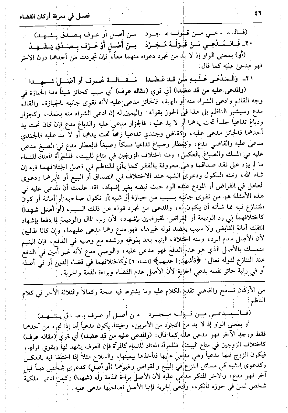 (فالمدعي من قَوْله مُجَرّد من أصل أَو عرف بِصدق يشْهد) فَالمُدَّعِي مَنْ قَوْلُهُ مُجَرَّدُ مِنْ أَصْلٍ أَوْ عُرْف بِصدْقِ يَشْهَدُ (أَو) بِمَعْنى الْوَاو إِذْ لَا بُد من تجرد دَعْوَاهُ مِنْهُمَا مَعًا، فَإِن تجردت من أَحدهمَا دون الآخر فَهُوَ مدعى عَلَيْهِ كَمَا قَالَ: وَالمدَّعَى عَلَيهِ من قد عَضَدا مَقالَة عُرف أَو أصْل شهِدا (وَالْمُدَّعى عَلَيْهِ من قد عضدا) أَي قوي (مقاله عرف) أَي سَبَب كحائز شَيْئا مُدَّة الْحِيَازَة فِي وَجه الْقَائِم وَادّعى الشِّرَاء مِنْهُ أَو الْهِبَة، فالحائز مدعى عَلَيْهِ لِأَنَّهُ تقوى جَانِبه بالحيازة، والقائم مُدع وسيشير النَّاظِم إِلَى هَذَا فِي الْحَوْز بقوله: وَالْيَمِين لَهُ إِن ادّعى الشِّرَاء مِنْهُ بِعَمَلِهِ، وكجزار ودباغ تداعيا جلدا تَحت يدهما أَو لَا يَد عَلَيْهِ، فالجزار مدعى عَلَيْهِ والدباغ مُدع فَإِن كَانَ تَحت يَد أَحدهمَا فالحائز مدعى عَلَيْهِ، وكقاض وجندي تداعيا رمحاً تَحت يدهما أَو لَا يَد عَلَيْهِ فالجندي مدعى عَلَيْهِ وَالْقَاضِي مُدع، وكعطار وصباغ تداعيا مسكاً وصبغاً فالعطار مُدع فِي الصَّبْغ مدعى عَلَيْهِ فِي الْمسك والصباغ بِالْعَكْسِ، وَمِنْه اخْتِلَاف الزَّوْجَيْنِ فِي مَتَاع للبيت، فللمرأة الْمُعْتَاد للنِّسَاء مَا لم يزدْ على نقد صَدَاقهَا وَهِي مَعْرُوفَة بالفقر كَمَا يَأْتِي للناظم فِي فصل اخْتِلَافهمَا فِيهِ إِن شَاءَ الله، وَمِنْه النّكُول وَدَعوى الشّبَه عِنْد الِاخْتِلَاف فِي الصَدَاق أَو البيع أَو غَيرهمَا وَدَعوى الْعَامِل فِي الْقَرَاض أَو الْمُودع عِنْده الرَّد حَيْثُ قَبضه بِغَيْر إِشْهَاد، فقد علمت أَن الْمُدعى عَلَيْهِ فِي هَذِه الْأَمْثِلَة هُوَ من تقوى جَانِبه بِسَبَب من حِيَازَة أَو شبه أَو نُكُول صَاحبه أَو أَمَانَة أَو كَون الْمُتَنَازع فِيهِ مِمَّا شَأْنه أَن يكون لَهُ، وَالْمُدَّعِي من تجرد قَوْله عَن ذَلِك السَّبَب (أَو أصل شَهدا) كاختلافهما فِي رد الْوَدِيعَة أَو الْقَرَاض المقبوضين بإشهاد، لِأَن رب المَال والوديعة لما دفعا بإشهاد انْتَفَت أَمَانَة الْقَابِض وَلَا سَبَب يعضد قَوْله غَيرهَا، فَهُوَ مُدع وهما مدعى عَلَيْهِمَا، وَإِن كَانَا طَالِبين لِأَن الأَصْل عدم الرَّد، وَمِنْه اخْتِلَاف الْيَتِيم بعد بُلُوغه ورشده مَعَ وَصِيّه فِي الدّفع، فَإِن الْيَتِيم متمسك بِالْأَصْلِ الَّذِي هُوَ عدم الدّفع فَهُوَ مدعى عَلَيْهِ، وَالْوَصِيّ مُدع لِأَنَّهُ غير أَمِين فِي الدّفع عِنْد التَّنَازُع لقَوْله تَعَالَى: فأشهدوا عَلَيْهِم} (النِّسَاء: 6) وكاختلافهما فِي قَضَاء الدّين أَو فِي أَصله أَو فِي رَقَبَة حائز نَفسه يَدعِي الْحُرِّيَّة لِأَن الأَصْل عدم الْقَضَاء وَبَرَاءَة الذِّمَّة وَالْحريَّة.