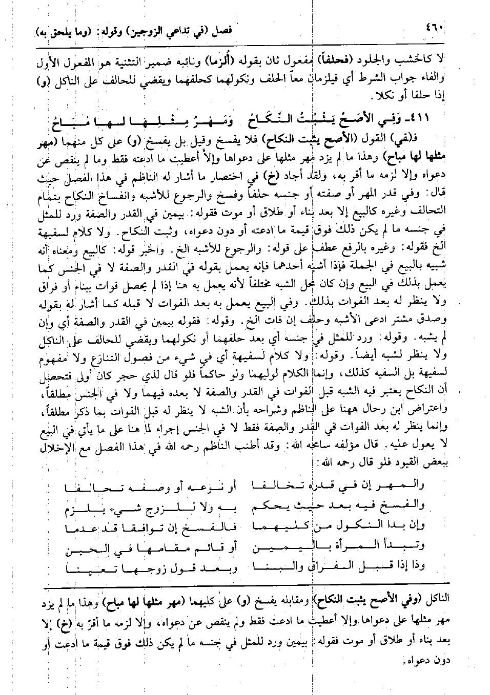 أَو لَا كالخشب والجلود (فَحَلفا) مفعول ثَان بقوله (أُلزما) ونائبه ضمير التَّثْنِيَة هُوَ الْمَفْعُول الأول وَالْفَاء جَوَاب الشَّرْط أَي فيلزمان مَعًا الْحلف ونكولهما كحلفهما وَيَقْضِي للْحَالِف على الناكل (و) إِذا حلفا أَو نكلا. وَفِي الأصَحِّ يَثْبُتُ النِّكَاحُ وَمَهْرُ مِثْلِهَا لَهَا مُبَاحُ ف (فِي) القَوْل (الْأَصَح يثبت النِّكَاح) فَلَا يفْسخ وَقيل بل يفْسخ (و) على كل مِنْهُمَا (مهر مثلهَا لَهَا مُبَاح) وَهَذَا مَا لم يزدْ مهر مثلهَا على دَعْوَاهَا وإلاَّ أَعْطَيْت مَا ادَّعَتْهُ فَقَط وَمَا لم ينقص عَن دَعْوَاهُ وَإِلَّا لزمَه مَا أقرّ بِهِ، وَلَقَد أَجَاد (خَ) فِي اخْتِصَار مَا أَشَارَ لَهُ النَّاظِم فِي هَذَا الْفَصْل حَيْثُ قَالَ: وَفِي قدر الْمهْر أَو صفته أَو جنسه حلفا وَفسخ وَالرُّجُوع للأشبه وانفساخ النِّكَاح بِتمَام التَّحَالُف وَغَيره كَالْبيع إِلَّا بعد بِنَاء أَو طَلَاق أَو موت فَقَوله: بِيَمِين فِي الْقدر وَالصّفة ورد للمثل فِي جنسه مَا لم يكن ذَلِك فَوق قيمَة مَا ادَّعَتْهُ أَو دون دَعْوَاهُ، وَثَبت النِّكَاح. وَلَا كَلَام لسفيهة الخ فَقَوله: وَغَيره بِالرَّفْع عطف على قَوْله: وَالرُّجُوع للأشبه الخ. وَالْخَبَر قَوْله: كَالْبيع وَمَعْنَاهُ أَنه شَبيه بِالْبيعِ فِي الْجُمْلَة فَإِذا أشبه أَحدهمَا فَإِنَّهُ يعْمل بقوله فِي الْقدر وَالصّفة لَا فِي الْجِنْس كَمَا يعْمل بذلك فِي البيع وَإِن كَانَ مَحل الشّبَه مُخْتَلفا لِأَنَّهُ يعْمل بِهِ هُنَا إِذا لم يحصل فَوَات بِبِنَاء أَو فِرَاق وَلَا ينظر لَهُ بعد الْفَوات بذلك. وَفِي البيع يعْمل بِهِ بعد الْفَوات لَا قبله كَمَا أَشَارَ لَهُ بقوله وَصدق مُشْتَر ادّعى الْأَشْبَه وَحلف إِن فَاتَ الخ. وَقَوله: فَقَوله بِيَمِين فِي الْقدر وَالصّفة أَي وَإِن لم يشبه. وَقَوله: ورد للمثل فِي جنسه أَي بعد حلفهما أَو نكولهما وَيَقْضِي للْحَالِف على الناكل وَلَا ينظر لشبه أَيْضا. وَقَوله: وَلَا كَلَام لسفيهة أَي فِي شَيْء من فُصُول التَّنَازُع وَلَا مَفْهُوم لسفيهة بل السَّفِيه كَذَلِك، وَإِنَّمَا الْكَلَام لوليهما وَلَو حَاكما فَلَو قَالَ لذِي حجر كَانَ أولى فَتحصل أَن النِّكَاح يعْتَبر فِيهِ الشّبَه قبل الْفَوات فِي الْقدر وَالصّفة لَا بعده فيهمَا وَلَا فِي الْجِنْس مُطلقًا، وَاعْتِرَاض ابْن رحال هَهُنَا على النَّاظِم وشراحه بِأَن الشّبَه لَا ينظر لَهُ قبل الْفَوات بِمَا ذكر مُطلقًا، وَإِنَّمَا ينظر لَهُ بعد الْفَوات فِي الْقدر وَالصّفة فَقَط لَا فِي الْجِنْس إِجْرَاء لما هُنَا على مَا يَأْتِي فِي البيع لَا يعول عَلَيْهِ. قَالَ مُؤَلفه سامحه الله: وَقد أطنب النَّاظِم رَحمَه الله فِي هَذَا الْفَصْل مَعَ الْإِخْلَال بِبَعْض الْقُيُود فَلَو قَالَ رَحمَه الله: وَالْمهْر إِن فِي قدره تخالفا أَو نَوعه أَو وَصفه تحَالفا وَالْفَسْخ فِيهِ بعد حَيْثُ يحكم بِهِ وَلَا للزَّوْج شَيْء يلْزم وَإِن بدا النّكُول من كليهمَا فالفسخ إِن توافقا قد عدما وتبدأ الْمَرْأَة بِالْيَمِينِ أَو قَائِم مقَامهَا فِي الْحِين وَذَا إِذا قبل الْفِرَاق والبنا وَبعد قَول زَوجهَا تعينا