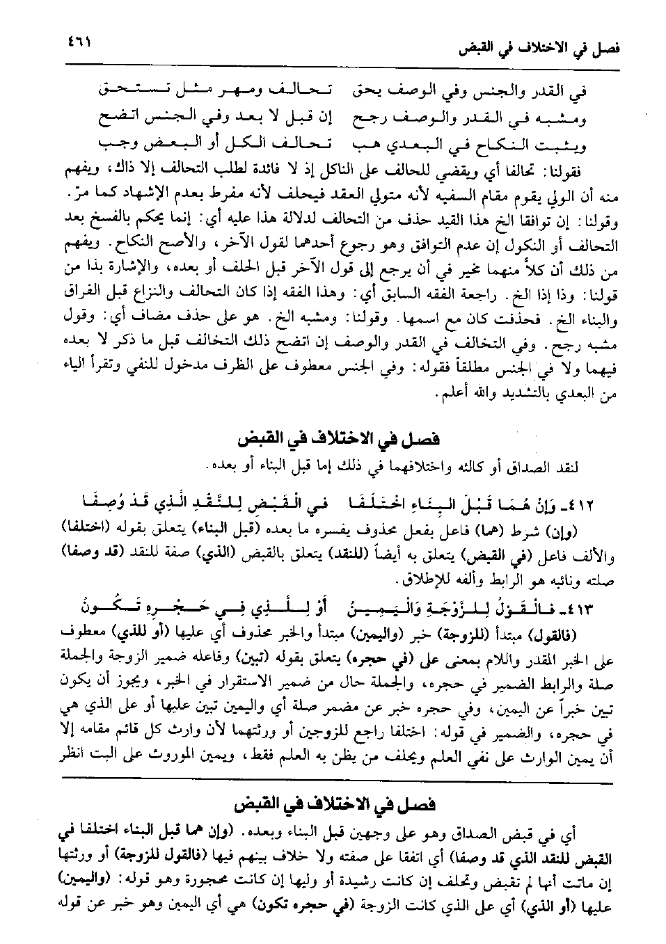 لنقد الصَدَاق أَو كالئه واختلافهما فِي ذَلِك إِمَّا قبل الْبناء أَو بعده. وَإنْ هُمَا قَبْلَ البِنَاءِ اخْتَلَفَا فِي الْقَبْضِ لِلنَّقْدِ الَّذِي قَدْ وُصِفَا (وَإِن) شَرط (هما) فَاعل بِفعل مَحْذُوف يفسره مَا بعده (قبل الْبناء) يتَعَلَّق بقوله (اخْتلفَا) وَالْألف فَاعل (فِي الْقَبْض) يتَعَلَّق بِهِ أَيْضا (للنقد) يتَعَلَّق بِالْقَبْضِ (الَّذِي) صفة للنقد (قد وَصفا) صلته ونائبه هُوَ الرابط وألفه للإطلاق. فالْقَوْلُ لِلزَّوْجَةِ وَالْيَمِينُ أَوْ لِلَّذِي فِي حَجْرِهِ تَكُونُ (فَالْقَوْل) مُبْتَدأ (للزَّوْجَة) خبر (وَالْيَمِين) مُبْتَدأ وَالْخَبَر مَحْذُوف أَي عَلَيْهَا (أَو للَّذي) مَعْطُوف على الْخَبَر الْمُقدر وَاللَّام بِمَعْنى على (فِي حجره) يتَعَلَّق بقوله (تبين) وفاعله ضمير الزَّوْجَة وَالْجُمْلَة صلَة والرابط الضَّمِير فِي حجره، وَالْجُمْلَة حَال من ضمير الِاسْتِقْرَار فِي الْخَبَر، وَيجوز أَن يكون تبين خَبرا عَن الْيَمين، وَفِي حجره خبر عَن مُضْمر صلَة أَي وَالْيَمِين تبين عَلَيْهَا أَو على الَّذِي هِيَ فِي حجره، وَالضَّمِير فِي قَوْله: اخْتلفَا رَاجع للزوجين أَو ورثتهما لِأَن وَارِث كل قَائِم مقَامه إِلَّا أَن يَمِين الْوَارِث على نفي الْعلم وَيحلف من يظنّ بِهِ الْعلم فَقَط، وَيَمِين الْمَوْرُوث على الْبَتّ انْظُر