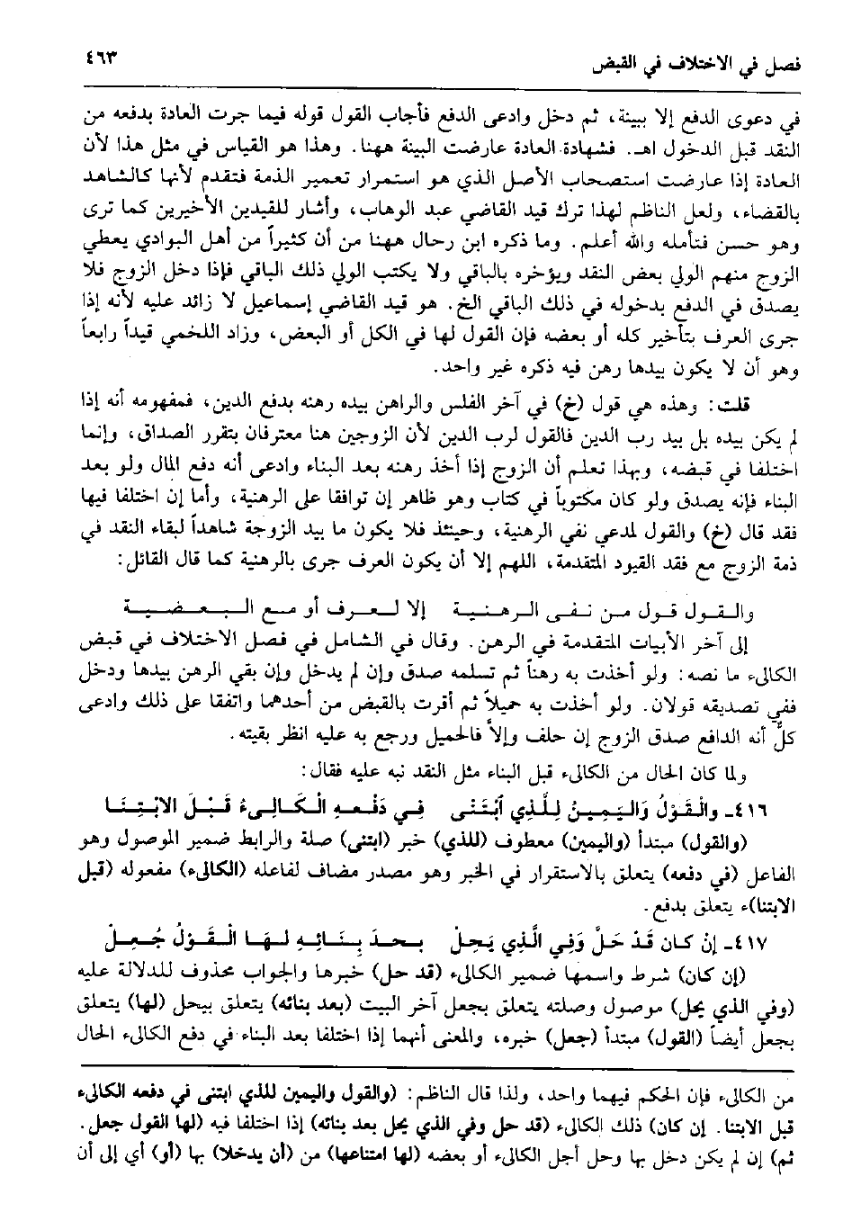 فِي دَعْوَى الدّفع إِلَّا بِبَيِّنَة، ثمَّ دخل وَادّعى الدّفع فَأجَاب القَوْل قَوْله فِيمَا جرت الْعَادة بِدَفْعِهِ من النَّقْد قبل الدُّخُول اه. فشهادة الْعَادة عارضت الْبَيِّنَة هَهُنَا. وَهَذَا هُوَ الْقيَاس فِي مثل هَذَا لِأَن الْعَادة إِذا عارضت اسْتِصْحَاب الأَصْل الَّذِي هُوَ اسْتِمْرَار تعمير الذِّمَّة فَتقدم لِأَنَّهَا كالشاهد بِالْقضَاءِ وَلَعَلَّ النَّاظِم لهَذَا ترك قيد القَاضِي عبد الْوَهَّاب، وَأَشَارَ للقيدين الْأَخيرينِ كَمَا ترى وَهُوَ حسن فَتَأَمّله وَالله أعلم. وَمَا ذكره ابْن رحال هَهُنَا من أَن كثيرا من أهل الْبَوَادِي يُعْطي الزَّوْج مِنْهُم الْوَلِيّ بعض النَّقْد ويؤخره بِالْبَاقِي وَلَا يكْتب الْوَلِيّ ذَلِك الْبَاقِي فَإِذا دخل الزَّوْج فَلَا يصدق فِي الدّفع بِدُخُولِهِ فِي ذَلِك الْبَاقِي الخ. هُوَ قيد القَاضِي إِسْمَاعِيل لَا زَائِد عَلَيْهِ لِأَنَّهُ إِذا جرى الْعرف بِتَأْخِير كُله أَو بعضه فَإِن القَوْل لَهَا فِي الْكل أَو الْبَعْض، وَزَاد اللَّخْمِيّ قيدا رَابِعا وَهُوَ أَن لَا يكون بِيَدِهَا رهن فِيهِ ذكره غير وَاحِد. قلت: وَهَذِه هِيَ قَول (خَ) فِي آخر الْفلس والراهن بِيَدِهِ رَهنه بِدفع الدّين، فمفهومه أَنه إِذا لم يكن بِيَدِهِ بل بيد رب الدّين فَالْقَوْل لرب الدّين لِأَن الزَّوْجَيْنِ هُنَا معترفان بتقرر الصَدَاق، وَإِنَّمَا اخْتلفَا فِي قَبضه، وَبِهَذَا تعلم أَن الزَّوْج إِذا أَخذ رَهنه بعد الْبناء وَادّعى أَنه دفع المَال وَلَو بعد الْبناء فَإِنَّهُ يصدق وَلَو كَانَ مَكْتُوبًا فِي كتاب وَهُوَ ظَاهر إِن توافقا على الرهنية، وَأما إِن اخْتلفَا فِيهَا فقد قَالَ (خَ) وَالْقَوْل لمُدعِي نفي الرهنية، وَحِينَئِذٍ فَلَا يكون مَا بيد الزَّوْجَة شَاهدا لبَقَاء النَّقْد فِي ذمَّة الزَّوْج مَعَ فقد الْقُيُود الْمُتَقَدّمَة، اللَّهُمَّ إِلَّا أَن يكون الْعرف جرى بالرهنية كَمَا قَالَ الْقَائِل: وَالْقَوْل قَول من نفى الرهنية إِلَّا لعرف أَو مَعَ البعضية إِلَى آخر الأبيات الْمُتَقَدّمَة فِي الرَّهْن. وَقَالَ فِي الشَّامِل فِي فصل الِاخْتِلَاف فِي قبض الكالىء مَا نَصه: وَلَو أخذت بِهِ رهنا ثمَّ تسلمه صدق وَإِن لم يدْخل وَإِن بَقِي الرَّهْن بِيَدِهَا وَدخل فَفِي تَصْدِيقه قَولَانِ. وَلَو أخذت بِهِ حميلاً ثمَّ أقرَّت بِالْقَبْضِ من أَحدهمَا واتفقا على ذَلِك وَادّعى كلٌّ أَنه الدَّافِع صدق الزَّوْج إِن حلف وإلاَّ فالحميل وَرجع بِهِ عَلَيْهِ انْظُر بَقِيَّته. وَلما كَانَ الْحَال من الكالىء قبل الْبناء مثل النَّقْد نبه عَلَيْهِ فَقَالَ: والْقَوْلُ وَاليَمِينُ لِلَّذِي ابْتَنْى فِي دَفْعهِ الْكَالِىءُ قَبْلَ الابْتِنَا (وَالْقَوْل) مُبْتَدأ (وَالْيَمِين) مَعْطُوف (للَّذي) خبر (ابتنى) صلَة والرابط ضمير الْمَوْصُول وَهُوَ الْفَاعِل (فِي دَفعه) يتَعَلَّق بالاستقرار فِي الْخَبَر وَهُوَ مصدر مُضَاف لفَاعِله (الكالىء) مَفْعُوله (قبل الابتنا) ء يتَعَلَّق بِدفع. إنْ كَانَ قَدْ حَلَّ وَفِي الَّذِي يَحِلْ بحدَ بِنَائِهِ لهَا الْقَوْلُ جُعِلْ (إِن كَانَ) شَرط وَاسْمهَا ضمير الكالىء (قد حل) خَبَرهَا وَالْجَوَاب مَحْذُوف للدلالة عَلَيْهِ (وَفِي الَّذِي يحل) مَوْصُول وصلته يتَعَلَّق بِجعْل آخر الْبَيْت (بعد بنائِهِ) يتَعَلَّق بيحل (لَهَا) يتَعَلَّق بِجعْل أَيْضا (القَوْل) مُبْتَدأ (جعل) خَبره، وَالْمعْنَى أَنَّهُمَا إِذا اخْتلفَا بعد الْبناء فِي دفع الكالىء الْحَال