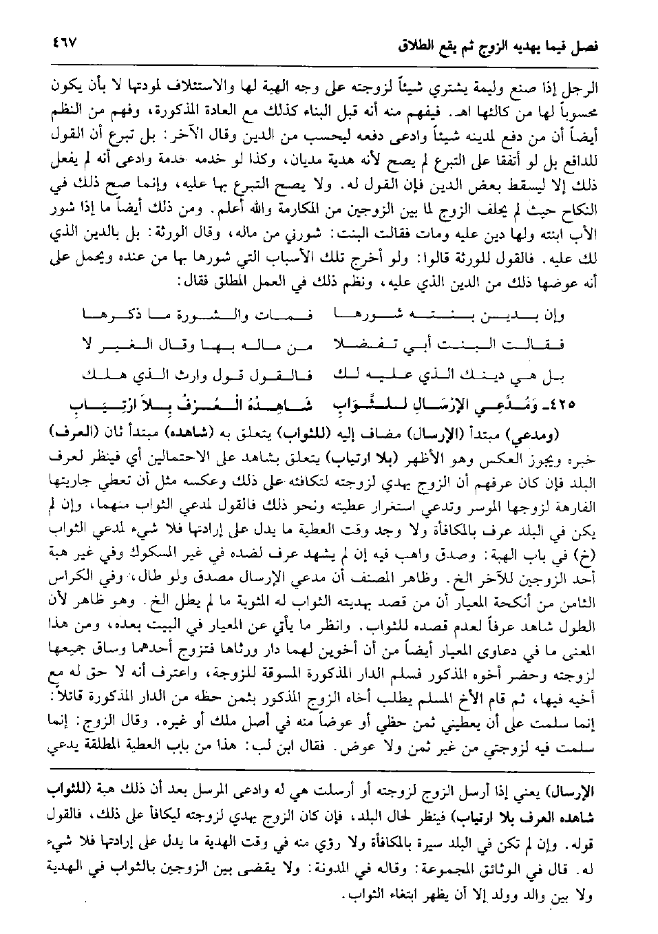 الرجل إِذا صنع وَلِيمَة يَشْتَرِي شَيْئا لزوجته على وَجه الْهِبَة لَهَا والاستئلاف لمودتها لَا بِأَن يكون محسوباً لَهَا من كالئها اه. فيفهم مِنْهُ أَنه قبل الْبناء كَذَلِك مَعَ الْعَادة الْمَذْكُورَة، وَفهم من النّظم أَيْضا أَن من دفع لمدينه شَيْئا وَادّعى دَفعه ليحسب من الدّين وَقَالَ الآخر: بل تبرع أَن القَوْل للدافع بل لَو أتفقا على التَّبَرُّع لم يَصح لِأَنَّهُ هَدِيَّة مديان، وَكَذَا لَو خدمه خدمَة وَادّعى أَنه لم يفعل ذَلِك إِلَّا ليسقط بعض الدّين فَإِن القَوْل لَهُ. وَلَا يَصح التَّبَرُّع بهَا عَلَيْهِ، وَإِنَّمَا صَحَّ ذَلِك فِي النِّكَاح حَيْثُ لم يحلف الزَّوْج لما بَين الزَّوْجَيْنِ من المكارمة وَالله أعلم. وَمن ذَلِك أَيْضا مَا إِذا شور الْأَب ابْنَته وَلها دين عَلَيْهِ وَمَات فَقَالَت الْبِنْت: شورني من مَاله، وَقَالَ الْوَرَثَة: بل بِالدّينِ الَّذِي لَك عَلَيْهِ. فَالْقَوْل للْوَرَثَة قَالُوا: وَلَو أخرج تِلْكَ الْأَسْبَاب الَّتِي شورها بهَا من عِنْده وَيحمل على أَنه عوضهَا ذَلِك من الدّين الَّذِي عَلَيْهِ، ونظم ذَلِك فِي الْعَمَل الْمُطلق فَقَالَ: وَإِن بدين بنته شورها فَمَاتَ والشورة مَا ذكرهَا فَقَالَت الْبِنْت أبي تفضلا من مَاله بهَا وَقَالَ الْغَيْر لَا بل هِيَ دينك الَّذِي عَلَيْهِ لَك فَالْقَوْل قَول وَارِث الَّذِي هلك وَمُدَّعِي الإرْسَالِ للثَّوَابِ شَاهِدُهُ الْعُرْفُ بِلاَ ارْتِيَابِ (ومدعي) مُبْتَدأ (الْإِرْسَال) مُضَاف إِلَيْهِ (للثَّواب) يتَعَلَّق بِهِ (شَاهده) مُبْتَدأ ثَان (الْعرف) خَبره وَيجوز الْعَكْس وَهُوَ الْأَظْهر (بِلَا ارتياب) يتَعَلَّق بِشَاهِد على الِاحْتِمَالَيْنِ أَي فَينْظر لعرف الْبَلَد فَإِن كَانَ عرفهم أَن الزَّوْج يهدي لزوجته لتكافئه على ذَلِك وَعَكسه مثل أَن تُعْطِي جاريتها الفارهة لزَوجهَا الْمُوسر وتدعي استغرار عطيته وَنَحْو ذَلِك فَالْقَوْل لمُدعِي الثَّوَاب مِنْهُمَا وَإِن لم يكن فِي الْبَلَد عرف بالمكافأة وَلَا وجد وَقت الْعَطِيَّة مَا يدل على إرادتها فَلَا شَيْء لمُدعِي الثَّوَاب (خَ) فِي بَاب الْهِبَة: وَصدق واهب فِيهِ إِن لم يشْهد عرف لضده فِي غير المسكوك وَفِي غير هبة أحد الزَّوْجَيْنِ للْآخر الخ. وَظَاهر المُصَنّف أَن مدعي الْإِرْسَال مُصدق وَلَو طَال، وَفِي الكراس الثَّامِن من أنكحة المعيار أَن من قصد بهديته الثَّوَاب لَهُ المثوبة مَا لم يطلّ الخ. وَهُوَ ظَاهر لِأَن الطول شَاهد عرفا لعدم قَصده للثَّواب. وَانْظُر مَا يَأْتِي عَن المعيار فِي الْبَيْت بعده، وَمن هَذَا الْمَعْنى مَا فِي دعاوى المعيار أَيْضا من أَن أَخَوَيْنِ لَهما دَار ورثاها فَتزَوج أَحدهمَا وسَاق جَمِيعهَا لزوجته وَحضر أَخُوهُ الْمَذْكُور فَسلم الدَّار الْمَذْكُورَة المسوقة للزَّوْجَة، واعترف أَنه لَا حق لَهُ مَعَ أَخِيه فِيهَا، ثمَّ قَامَ الْأَخ الْمُسلم يطْلب أَخَاهُ الزَّوْج الْمَذْكُور بِثمن حَظه من الدَّار الْمَذْكُورَة قَائِلا: إِنَّمَا سلمت على أَن يعطيني ثمن حظي أَو عوضا مِنْهُ فِي أصل ملك أَو غَيره. وَقَالَ الزَّوْج: إِنَّمَا سلمت فِيهِ لزوجتي من غير ثمن وَلَا عوض. فَقَالَ ابْن لب: هَذَا من بَاب الْعَطِيَّة الْمُطلقَة يَدعِي