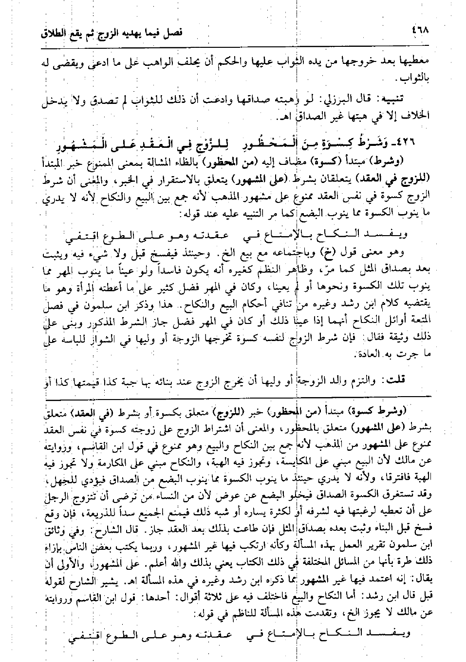 معطيها بعد خُرُوجهَا من يَده الثَّوَاب عَلَيْهَا وَالْحكم أَن يحلف الْوَاهِب على مَا ادّعى وَيقْضى لَهُ بالثواب. تَنْبِيه: قَالَ الْبُرْزُليّ: لَو وهبته صَدَاقهَا وَادعت أَن ذَلِك للثَّواب لم تصدق وَلَا يدْخل الْخلاف إِلَّا فِي هبتها غير الصَدَاق اه. وَشَرْطُ كِسْوَةٍ مِنَ الْمَحْظُورِ لِلزَّوْجِ فِي الْعَقْدِ عَلى الْمَشْهُورِ (وَشرط) مُبْتَدأ (كسْوَة) مُضَاف إِلَيْهِ (من الْمَحْظُور) بالظاء المشالة بِمَعْنى الْمَمْنُوع خبر الْمُبْتَدَأ (للزَّوْج فِي العقد) يتعلقان بِشَرْط (على الْمَشْهُور) يتَعَلَّق بالاستقرار فِي الْخَبَر، وَالْمعْنَى أَن شَرط الزَّوْج كسْوَة فِي نفس العقد مَمْنُوع على مَشْهُور الْمَذْهَب لِأَنَّهُ جمع بَين البيع وَالنِّكَاح لِأَنَّهُ لَا يدْرِي مَا يَنُوب الْكسْوَة مِمَّا يَنُوب الْبضْع كَمَا مر التَّنْبِيه عَلَيْهِ عِنْد قَوْله: وَيفْسد النِّكَاح بالإمتاع فِي عقدته وَهُوَ على الطوع اقتفي وَهُوَ معنى قَول (خَ) وباجتماعه مَعَ بيع الخ. وَحِينَئِذٍ فَيفْسخ قبل وَلَا شَيْء فِيهِ وَيثبت بعد بِصَدَاق الْمثل كَمَا مرّ، وَظَاهر النّظم كَغَيْرِهِ أَنه يكون فَاسِدا وَلَو عينا مَا يَنُوب الْمهْر مِمَّا يَنُوب تِلْكَ الْكسْوَة وَنَحْوهَا أَو لم يعينا، وَكَانَ فِي الْمهْر فضل كثير على مَا أَعطَتْهُ الْمَرْأَة وَهُوَ مَا يَقْتَضِيهِ كَلَام ابْن رشد وَغَيره من تنَافِي أَحْكَام البيع وَالنِّكَاح. هَذَا وَذكر ابْن سَلمُون فِي فصل الْمُتْعَة أَوَائِل النِّكَاح أَنَّهُمَا إِذا عينا ذَلِك أَو كَانَ فِي الْمهْر فضل جَازَ الشَّرْط الْمَذْكُور وَبنى على ذَلِك وَثِيقَة فَقَالَ: فَإِن شَرط الزَّوْج لنَفسِهِ كسْوَة تخرجها الزَّوْجَة أَو وَليهَا فِي الشوار للباسه على مَا جرت بِهِ الْعَادة. قلت: وَالْتزم وَالِد الزَّوْجَة أَو وَليهَا أَن يخرج الزَّوْج عِنْد بنائِهِ بهَا جُبَّة كَذَا قيمتهَا كَذَا أَو