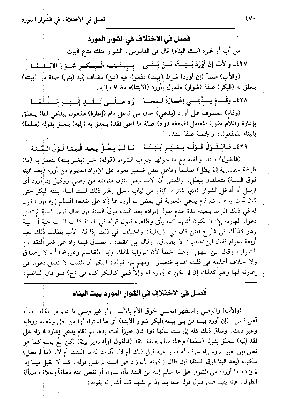من أَب أَو غَيره (بَيت الْبناء) قَالَ فِي الْقَامُوس: الشوار مُثَلّثَة مَتَاع الْبَيْت. والأبُ إنْ أَوْرَدَ بَيْتُ مَنْ بَنَى بِبِنْتِهِ الْبِكْرِ شِوَارَ الابْتِنَا (وَالْأَب) مُبْتَدأ (إِن أورد) شَرط (بَيت) مفعول فِيهِ (من) مُضَاف إِلَيْهِ (بنى) صلَة من (ببنته) يتَعَلَّق بِهِ (الْبكر) صفة (شوار) مفعول بأورد (الابتنا) ء مُضَاف إِلَيْهِ. وَقَامَ يَدَّعِي إعَارَةً لِمَا زَادَ عَلَى نَقْدٍ إلَيْهِ سُلِّمَا (وَقَامَ) مَعْطُوف على أورد (يَدعِي) حَال من فَاعل قَامَ (إِعَارَة) مفعول بيدعي (لما) يتَعَلَّق بإعارة وَاللَّام مقوية لِلْعَامِلِ لضَعْفه (زَاد) صلَة مَا (على نقد) يتَعَلَّق بِهِ (إِلَيْهِ) يتَعَلَّق بقوله (سلما) بِالْبِنَاءِ للْمَفْعُول، وَالْجُمْلَة صفة لنقد. فالقَوْلُ قَوْلُهُ بِغَيْرِ بَيِّنَهْ مَا لَمْ يَطُّلْ بَعْد الْبِنَا فَوْقَ السَّنَهْ (فَالْقَوْل) مُبْتَدأ وَالْفَاء مَعَ مدخولها جَوَاب الشَّرْط (قَوْله) خبر (بِغَيْر بَيِّنَة) يتَعَلَّق بِهِ (مَا) ظرفية مَصْدَرِيَّة (لم يطلّ) صلتها وفاعل يطلّ ضمير يعود على الْإِيرَاد الْمَفْهُوم من أورد (بعد الْبَنَّا فَوق السّنة) يتعلقان بيطل، وَالْمعْنَى أَن الْأَب وَمن تنزل مَنْزِلَته من وَصِيّ ووكيل إِن أورد أَي أرسل أَو أَدخل الشوار الَّذِي اشْتَرَاهُ بِالنَّقْدِ من ثِيَاب وحلى وَغير ذَلِك لبيت الْبناء ببنته الْبكر حَتَّى كَانَ تَحت يَدهَا، ثمَّ قَامَ يَدعِي الْعَارِية فِي بعض مَا أورد مِمَّا زَاد على نقدها الْمُسلم إِلَيْهِ فَإِن القَوْل لَهُ فِي ذَلِك الزَّائِد بِيَمِينِهِ مُدَّة عدم طول إِيرَاده بعد الْبناء فَوق السّنة فَإِن طَال فَوق السّنة لم تقبل دَعْوَاهُ الْعَارِية إِلَّا أَن يكون أشهد كَمَا يَأْتِي وَظَاهره قبُول قَوْله فِي السّنة كَانَت الْبِنْت حَيَّة أَو ميتَة وَهُوَ كَذَلِك فِي شرَّاح الْمَتْن قَالَ فِي الْمُتَيْطِيَّة: وَاخْتلف فِي ذَلِك إِذا قَامَ الْأَب يطْلب ذَلِك بعد أَرْبَعَة أَعْوَام فَقَالَ ابْن عتاب: لَا يصدق. وَقَالَ ابْن الْقطَّان: يصدق فِيمَا زَاد على قدر النَّقْد من الشوار، وَقَالَ ابْن سهل: وَهَذَا خطأ لِأَن الرِّوَايَة لمَالِك وَابْن الْقَاسِم وَغَيرهمَا أَنه لَا يصدق وَلَا خلاف أعلمهُ فِي ذَلِك اه بِاخْتِصَار. وَفهم من قَوْله: الْبكر أَن الثّيّب لَا تقبل دَعْوَاهُ فِي إعارته لَهَا وَهُوَ كَذَلِك إِن لم تكن محجورة لَهُ وإلاَّ فَهِيَ كالبكر كَمَا فِي (ح) فَلَو قَالَ النَّاظِم: