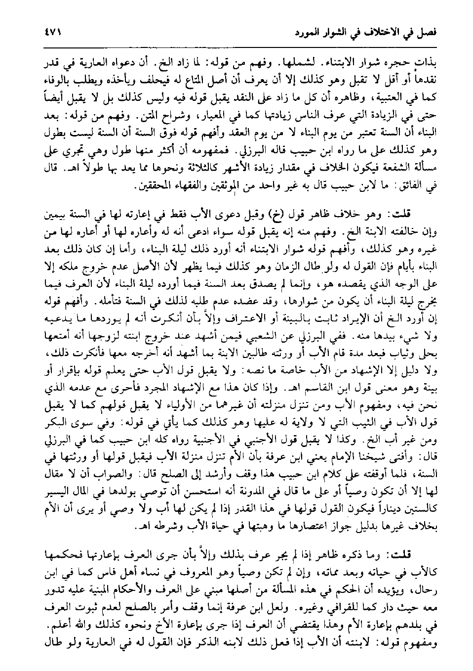 بِذَات حجره شوار الابتناء. لشملها. وَفهم من قَوْله: لما زَاد الخ. أَن دَعْوَاهُ الْعَارِية فِي قدر نقدها أَو أقل لَا تقبل وَهُوَ كَذَلِك إِلَّا أَن يعرف أَن أصل الْمَتَاع لَهُ فَيحلف وَيَأْخُذهُ وَيطْلب بِالْوَفَاءِ كَمَا فِي الْعُتْبِيَّة، وَظَاهره أَن كل مَا زَاد على النَّقْد يقبل قَوْله فِيهِ وَلَيْسَ كَذَلِك بل لَا يقبل أَيْضا حَتَّى فِي الزِّيَادَة الَّتِي عرف النَّاس زيادتها كَمَا فِي المعيار، وشراح الْمَتْن. وَفهم من قَوْله: بعد الْبناء أَن السّنة تعْتَبر من يَوْم الْبناء لَا من يَوْم العقد وَأفهم قَوْله فَوق السّنة أَن السّنة لَيست بطول وَهُوَ كَذَلِك على مَا رَوَاهُ ابْن حبيب قَالَه الْبُرْزُليّ. فمفهومه أَن أَكثر مِنْهَا طول وَهِي تجْرِي على مَسْأَلَة الشُّفْعَة فَيكون الْخلاف فِي مِقْدَار زِيَادَة الْأَشْهر كالثلاثة وَنَحْوهَا مِمَّا يعد بهَا طولا اه. قَالَ فِي الْفَائِق: مَا لِابْنِ حبيب قَالَ بِهِ غير وَاحِد من الموثقين وَالْفُقَهَاء الْمُحَقِّقين. قلت: وَهُوَ خلاف ظَاهر قَول (خَ) وَقبل دَعْوَى الْأَب فَقَط فِي إعارته لَهَا فِي السّنة بِيَمِين وَإِن خالفته الِابْنَة الخ. وَفهم مِنْهُ إِنَّه يقبل قَوْله سَوَاء ادّعى أَنه لَهُ وأعاره لَهَا أَو أَعَارَهُ لَهَا من غَيره وَهُوَ كَذَلِك، وَأفهم قَوْله شوار الابتناء أَنه أورد ذَلِك لَيْلَة الْبناء، وَأما إِن كَانَ ذَلِك بعد الْبناء بأيام فَإِن القَوْل لَهُ وَلَو طَال الزَّمَان وَهُوَ كَذَلِك فِيمَا يظْهر لِأَن الأَصْل عدم خُرُوج ملكه إِلَّا على الْوَجْه الَّذِي يَقْصِدهُ هُوَ، وَإِنَّمَا لم يصدق بعد السّنة فِيمَا أوردهُ لَيْلَة الْبناء لِأَن الْعرف فِيمَا يخرج لَيْلَة الْبناء أَن يكون من شوارها، وَقد عضده عدم طلبه لذَلِك فِي السّنة فَتَأَمّله. وَأفهم قَوْله إِن أورد الخ أَن الْإِيرَاد ثَابت بِالْبَيِّنَةِ أَو الِاعْتِرَاف وإلاَّ بِأَن أنْكرت أَنه لم يوردها مَا يَدعِيهِ وَلَا شَيْء بِيَدِهَا مِنْهُ. فَفِي الْبُرْزُليّ عَن الشّعبِيّ فِيمَن أشهد عِنْد خُرُوج ابْنَته لزَوجهَا أَنه أمتعها بحلى وَثيَاب فَبعد مُدَّة قَامَ الْأَب أَو ورثته طَالِبين الِابْنَة بِمَا أشهد أَنه أخرجه مَعهَا فأنكرت ذَلِك، وَلَا دَلِيل إِلَّا الْإِشْهَاد من الْأَب خَاصَّة مَا نَصه: وَلَا يقبل قَول الْأَب حَتَّى يعلم قَوْله بِإِقْرَار أَو بَيِّنَة وَهُوَ معنى قَول ابْن الْقَاسِم اه. وَإِذا كَانَ هَذَا مَعَ الْإِشْهَاد الْمُجَرّد فأحرى مَعَ عَدمه الَّذِي نَحن فِيهِ، وَمَفْهُوم الْأَب وَمن تنزل مَنْزِلَته أَن غَيرهمَا من الْأَوْلِيَاء لَا يقبل قَوْلهم كَمَا لَا يقبل قَول الْأَب فِي الثّيّب الَّتِي لَا ولَايَة لَهُ عَلَيْهَا وَهُوَ كَذَلِك كَمَا يَأْتِي فِي قَوْله: وَفِي سوى الْبكر وَمن غير أَب الخ. وَكَذَا لَا يقبل قَول الْأَجْنَبِيّ فِي الْأَجْنَبِيَّة رَوَاهُ كُله ابْن حبيب كَمَا فِي الْبُرْزُليّ قَالَ: وَأفْتى شَيخنَا الإِمَام يَعْنِي ابْن عَرَفَة بِأَن الْأُم تنزل منزلَة الْأَب فَيقبل قَوْلهَا أَو ورثتها فِي السّنة، فَلَمَّا أوقفته على كَلَام ابْن حبيب هَذَا وقف وأرشد إِلَى الصُّلْح قَالَ: وَالصَّوَاب أَن لَا مقَال لَهَا إِلَّا أَن تكون وَصِيّا أَو على مَا قَالَ فِي الْمُدَوَّنَة أَنه اسْتحْسنَ أَن توصي بِوَلَدِهَا فِي المَال الْيَسِير كالستين دِينَارا فَيكون القَوْل قَوْلهَا فِي هَذَا الْقدر إِذا لم يكن لَهَا أَب وَلَا وَصِيّ أَو يرى أَن الْأُم بِخِلَاف غَيرهَا بِدَلِيل جَوَاز اعتصارها مَا وهبتها فِي حَيَاة الْأَب وَشَرطه اه. قلت: وَمَا ذكره ظَاهر إِذا لم يجر عرف بذلك وإلاَّ بِأَن جرى الْعرف بإعارتها فَحكمهَا كَالْأَبِ فِي حَيَاته وَبعد مماته، وَإِن لم تكن وَصِيّا وَهُوَ الْمَعْرُوف فِي نسَاء أهل فاس كَمَا فِي ابْن رحال، وَيُؤَيِّدهُ أَن الحكم فِي هَذِه الْمَسْأَلَة من أَصْله