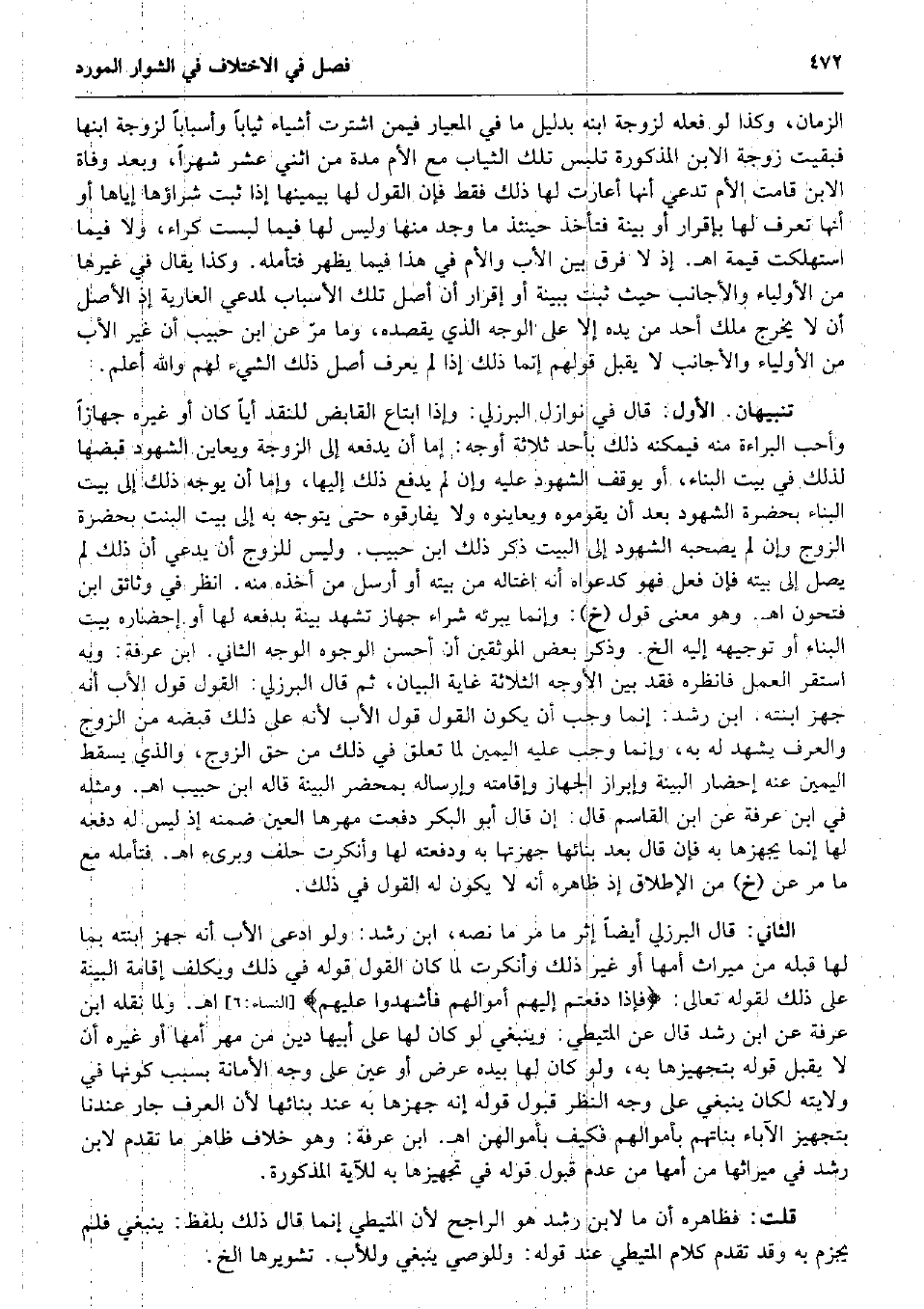 الزَّمَان، وَكَذَا لَو فعله لزوجة ابْنه بِدَلِيل مَا فِي المعيار فِيمَن اشترت أَشْيَاء ثيابًا وأسباباً لزوجة ابْنهَا فَبَقيت زَوْجَة الابْن الْمَذْكُورَة تلبس تِلْكَ الثِّيَاب مَعَ الْأُم مُدَّة من اثْنَي عشر شهرا، وَبعد وَفَاة الابْن قَامَت الْأُم تَدعِي أَنَّهَا أعارت لَهَا ذَلِك فَقَط فَإِن القَوْل لَهَا بِيَمِينِهَا إِذا ثَبت شراؤها إِيَّاهَا أَو أَنَّهَا تعرف لَهَا بِإِقْرَار أَو بَيِّنَة فتأخذ حِينَئِذٍ مَا وجد مِنْهَا وَلَيْسَ لَهَا فِيمَا لبست كِرَاء، وَلَا فِيمَا استهلكت قيمَة اه. إِذْ لَا فرق بَين الْأَب وَالأُم فِي هَذَا فِيمَا يظْهر فَتَأَمّله. وَكَذَا يُقَال فِي غَيرهَا من الْأَوْلِيَاء والأجانب حَيْثُ ثَبت بِبَيِّنَة أَو إِقْرَار أَن أصل تِلْكَ الْأَسْبَاب لمُدعِي الْعَارِية إِذْ الأَصْل أَن لَا يخرج ملك أحد من يَده إِلَّا على الْوَجْه الَّذِي يَقْصِدهُ، وَمَا مرّ عَن ابْن حبيب أَن غير الْأَب من الْأَوْلِيَاء والأجانب لَا يقبل قَوْلهم إِنَّمَا ذَلِك إِذا لم يعرف أصل ذَلِك الشَّيْء لَهُم وَالله أعلم. تَنْبِيهَانِ. الأول: قَالَ فِي نَوَازِل الْبُرْزُليّ: وَإِذا ابْتَاعَ الْقَابِض للنقد أياً كَانَ أَو غَيره جهازاً وَأحب الْبَرَاءَة مِنْهُ فيمكنه ذَلِك بِأحد ثَلَاثَة أوجه: إِمَّا أَن يَدْفَعهُ إِلَى الزَّوْجَة ويعاين الشُّهُود قبضهَا لذَلِك فِي بَيت الْبناء، أَو يُوقف الشُّهُود عَلَيْهِ وَإِن لم يدْفع ذَلِك إِلَيْهَا، وَإِمَّا أَن يُوَجه ذَلِك إِلَى بَيت الْبناء بِحَضْرَة الشُّهُود بعد أَن يقوموه ويعاينوه وَلَا يفارقوه حَتَّى يتَوَجَّه بِهِ إِلَى بَيت الْبِنْت بِحَضْرَة الزَّوْج وَإِن لم يَصْحَبهُ الشُّهُود إِلَى الْبَيْت ذكر ذَلِك ابْن حبيب. وَلَيْسَ للزَّوْج أَن يَدعِي أَن ذَلِك لم يصل إِلَى بَيته فَإِن فعل فَهُوَ كدعواه أَنه اغتاله من بَيته أَو أرسل من أَخذه مِنْهُ. انْظُر فِي وثائق ابْن فتحون اه. وَهُوَ معنى قَول (خَ) : وَإِنَّمَا يُبرئهُ شِرَاء جهاز تشهد بَيِّنَة بِدَفْعِهِ لَهَا أَو إِحْضَاره بَيت الْبناء أَو تَوْجِيهه إِلَيْهِ الخ. وَذكر بعض الموثقين أَن أحسن الْوُجُوه الْوَجْه الثَّانِي. ابْن عَرَفَة: وَبِه اسْتَقر الْعَمَل فَانْظُرْهُ فقد بَين الْأَوْجه الثَّلَاثَة غَايَة الْبَيَان، ثمَّ قَالَ الْبُرْزُليّ: القَوْل قَول الْأَب أَنه جهز ابْنَته. ابْن رشد: إِنَّمَا وَجب أَن يكون القَوْل قَول الْأَب لِأَنَّهُ على ذَلِك قَبضه من الزَّوْج وَالْعرْف يشْهد لَهُ بِهِ، وَإِنَّمَا وَجب عَلَيْهِ الْيَمين لما تعلق فِي ذَلِك من حق الزَّوْج، وَالَّذِي يسْقط الْيَمين عَنهُ إِحْضَار الْبَيِّنَة وإبراز الجهاز وإقامته وإرساله بِمحضر الْبَيِّنَة قَالَه ابْن حبيب اه. وَمثله فِي ابْن عَرَفَة عَن ابْن الْقَاسِم قَالَ: إِن قَالَ أَبُو الْبكر دفعت مهرهَا الْعين ضمنه إِذْ لَيْسَ لَهُ دَفعه لَهَا إِنَّمَا يجهزها بِهِ فَإِن قَالَ بعد بنائها جهزتها بِهِ ودفعته لَهَا وَأنْكرت حلف وبرىء اه. فَتَأَمّله مَعَ مَا مر عَن (خَ) من الْإِطْلَاق إِذْ ظَاهره أَنه لَا يكون لَهُ القَوْل فِي ذَلِك. الثَّانِي: قَالَ الْبُرْزُليّ أَيْضا إِثْر مَا مر مَا نَصه، ابْن رشد: وَلَو ادّعى الْأَب أَنه جهز ابْنَته بِمَا لَهَا قبله من مِيرَاث أمهَا أَو غير ذَلِك وَأنْكرت لما كَانَ القَوْل قَوْله فِي ذَلِك ويكلف إِقَامَة الْبَيِّنَة على ذَلِك لقَوْله تَعَالَى: فَإِذا دفعتم إِلَيْهِم أَمْوَالهم فأشهدوا عَلَيْهِم} (النِّسَاء: 6) اه. وَلما نَقله ابْن عَرَفَة عَن ابْن رشد قَالَ عَن المتيطي: وَيَنْبَغِي لَو كَانَ لَهَا على أَبِيهَا دين من مهر أمهَا أَو غَيره أَن لَا يقبل قَوْله بتجهيزها بِهِ، وَلَو كَانَ لَهَا بِيَدِهِ عرض أَو عين على وَجه الْأَمَانَة بِسَبَب كَونهَا فِي ولَايَته لَكَانَ يَنْبَغِي على وَجه النّظر قبُول قَوْله إِنَّه جهزها بِهِ عِنْ