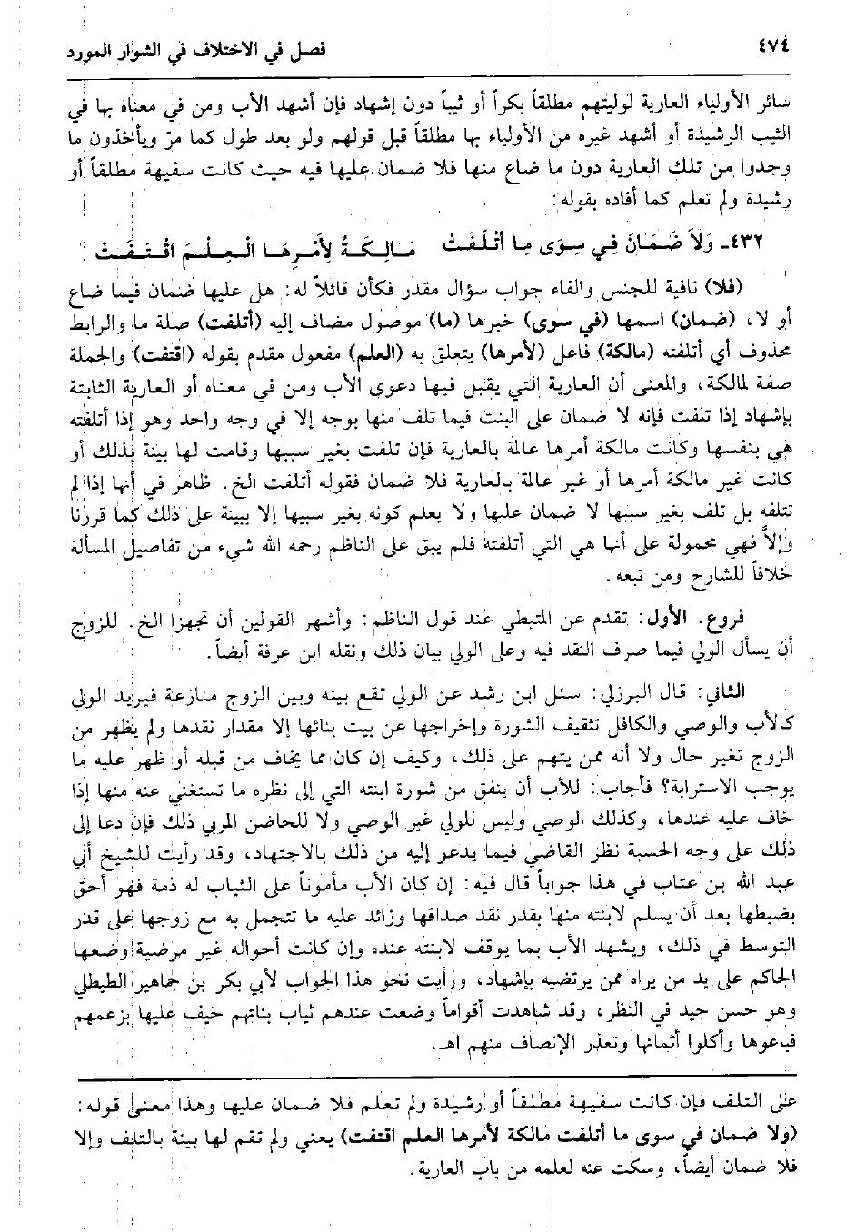 سَائِر الْأَوْلِيَاء الْعَارِية لوليتهم مُطلقًا بكرا أَو ثَيِّبًا دون إِشْهَاد فَإِن أشهد الْأَب وَمن فِي مَعْنَاهُ بهَا فِي الثّيّب الرشيدة أَو أشهد غَيره من الْأَوْلِيَاء بهَا مُطلقًا قبل قَوْلهم وَلَو بعد طول كَمَا مرّ وَيَأْخُذُونَ مَا وجدوا من تِلْكَ الْعَارِية دون مَا ضَاعَ مِنْهَا فَلَا ضَمَان عَلَيْهَا فِيهِ حَيْثُ كَانَت سَفِيهَة مُطلقًا أَو رَشِيدَة وَلم تعلم كَمَا أَفَادَهُ بقوله: وَلاَ ضَمَانَ فِي سِوَى مِا أتْلَفَتْ مَالِكَةٌ لأَمْرِهَا الْعِلْمَ اقْتَفَتْ (فَلَا) نَافِيَة للْجِنْس وَالْفَاء جَوَاب سُؤال مُقَدّر فَكَأَن قَائِلا لَهُ: هَل عَلَيْهَا ضَمَان فِيمَا ضَاعَ أَو لَا، (ضَمَان) اسْمهَا (فِي سوى) خَبَرهَا (مَا) مَوْصُول مُضَاف إِلَيْهِ (أتلفت) صلَة مَا والرابط مَحْذُوف أَي أتلفته (مالكة) فَاعل (لأمرها) يتَعَلَّق بِهِ (الْعلم) مفعول مقدم بقوله (اقتفت) وَالْجُمْلَة صفة لمالكة، وَالْمعْنَى أَن الْعَارِية الَّتِي يقبل فِيهَا دَعْوَى الْأَب وَمن فِي مَعْنَاهُ أَو الْعَارِية الثَّابِتَة بإشهاد إِذا تلفت فَإِنَّهُ لَا ضَمَان على الْبِنْت فِيمَا تلف مِنْهَا بِوَجْه إِلَّا فِي وَجه وَاحِد وَهُوَ إِذا أتلفته هِيَ بِنَفسِهَا وَكَانَت مالكة أمرهَا عَالِمَة بالعارية فَإِن تلفت بِغَيْر سَببهَا وَقَامَت لَهَا بَيِّنَة بذلك أَو كَانَت غير مالكة أمرهَا أَو غير عَالِمَة بالعارية فَلَا ضَمَان فَقَوله أتلفت الخ. ظَاهر فِي أَنَّهَا إِذا لم تتلفه بل تلف بِغَيْر سَببهَا لَا ضَمَان عَلَيْهَا وَلَا يعلم كَونه بِغَيْر سبيهَا إِلَّا بِبَيِّنَة على ذَلِك كَمَا قَررنَا وإلاَّ فَهِيَ مَحْمُولَة على أَنَّهَا هِيَ الَّتِي أتلفته فَلم يبْق على النَّاظِم رَحمَه الله شَيْء من تفاصيل الْمَسْأَلَة خلافًا للشَّارِح وَمن تبعه. فروع. الأول: تقدم عَن المتيطي عِنْد قَول النَّاظِم: وَأشهر الْقَوْلَيْنِ أَن تجهزا الخ. للزَّوْج أَن يسْأَل الْوَلِيّ فِيمَا صرف النَّقْد فِيهِ وعَلى الْوَلِيّ بَيَان ذَلِك وَنَقله ابْن عَرَفَة أَيْضا. الثَّانِي: قَالَ الْبُرْزُليّ: سُئِلَ ابْن رشد عَن الْوَلِيّ تقع بَينه وَبَين الزَّوْج مُنَازعَة فيريد الْوَلِيّ كَالْأَبِ وَالْوَصِيّ والكافل تثقيف الشورة وإخراجها عَن بَيت بنائها إِلَّا مِقْدَار نقدها وَلم يظْهر من الزَّوْج تغير حَال وَلَا أَنه مِمَّن يتهم على ذَلِك، وَكَيف إِن كَانَ مِمَّا يخَاف من قبله أَو ظهر عَلَيْهِ مَا يُوجب الاسترابة؟ فَأجَاب: للْأَب أَن ينْفق من شورة ابْنَته الَّتِي إِلَى نظره مَا تَسْتَغْنِي عَنهُ مِنْهَا إِذا خَافَ عَلَيْهِ عِنْدهَا، وَكَذَلِكَ الْوَصِيّ وَلَيْسَ للْوَلِيّ غير الْوَصِيّ وَلَا للحاضن المربي ذَلِك فَإِن دَعَا إِلَى ذَلِك على وَجه الْحِسْبَة نظر القَاضِي فِيمَا يَدْعُو إِلَيْهِ من ذَلِك بِالِاجْتِهَادِ، وَقد رَأَيْت للشَّيْخ أبي عبد الله بن عتاب فِي هَذَا جَوَابا قَالَ فِيهِ: إِن كَانَ الْأَب مَأْمُونا على الثِّيَاب لَهُ ذمَّة فَهُوَ أَحَق بضبطها بعد أَن يسلم لابنته مِنْهَا بِقدر نقد صَدَاقهَا وزائد عَلَيْهِ مَا تتجمل بِهِ مَعَ زَوجهَا على قدر التَّوَسُّط فِي ذَلِك، وَيشْهد الْأَب بِمَا يُوقف لابنته عِنْده وَإِن كَانَت أَحْوَاله غير مرضية وَضعهَا الْحَاكِم على يَد من يرَاهُ مِمَّن يرتضيه بإشهاد، وَرَأَيْت نَحْو هَذَا الْجَواب لأبي بكر بن جَمَاهِير الطيطلي وَهُوَ حسن جيد فِي النّظر، وَقد شاهدت أَقْوَامًا وضعت عِنْدهم ثِيَاب بناتهم خيف عَلَيْهَا بزعمهم فَبَاعُوهَا وأكلوا أثمانها وَتعذر الْإِنْصَاف مِنْهُم اه.