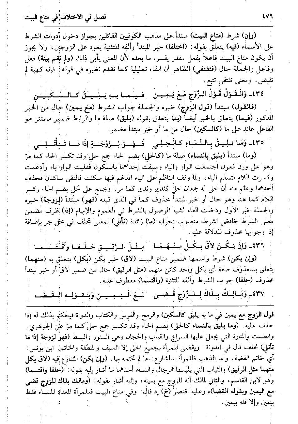 (وَإِن) شَرط (مَتَاع الْبَيْت) مُبْتَدأ على مَذْهَب الْكُوفِيّين الْقَائِلين بِجَوَاز دُخُول أدوات الشَّرْط على الْأَسْمَاء (فِيهِ) يتَعَلَّق بقوله: (اخْتلفَا) خبر الْمُبْتَدَأ وألفه للتثنية يعود على الزَّوْجَيْنِ، وَلَا يجوز أَن يكون مَتَاع الْبَيْت فَاعِلا بِفعل مُقَدّر يفسره مَا بعده لِأَن الْمَعْنى يَأْبَى ذَلِك (وَلم تقم بَيِّنَة) فعل وفاعل وَالْجُمْلَة حَال (فتقتفى) الظَّاهِر أَن الْفَاء تعليلية كَمَا تقدم نَظِيره فِي قَوْله: فَإِنَّهُ كَهِبَة لم تقبض. وَمعنى تقتفى تتبع. وَالْقَوْلُ قَوْلُ الزَّوْجِ مَعْ يَمِينِ فِيمَا بهِ يَلِيقُ كالسِّكِّينِ (فَالْقَوْل) مُبْتَدأ (قَول الزَّوْج) خَبره وَالْجُمْلَة جَوَاب الشَّرْط (مَعَ يَمِين) حَال من الْخَبَر الْمَذْكُور (فِيمَا) يتَعَلَّق بالْخبر أَيْضا (بِهِ) يتَعَلَّق بقوله (يَلِيق) صلَة مَا والرابط ضمير مستتر هُوَ الْفَاعِل عَائِد على مَا (كالسكين) حَال من مَا أَو خبر مُبْتَدأ مُضْمر. وَمَا يَلِيقُ بِالنِّسَاءِ كالْحِلِي فَهْوَ لِزَوْجَةٍ إذَا مَا تَأْتَلِي (وَمَا) مُبْتَدأ (يَلِيق بِالنسَاء) صلَة مَا (كالحلي) بِضَم الْحَاء جمع حلي وَقد تكسر الْحَاء كَمَا مرّ وَهُوَ على وزن فعول اجْتمعت الْوَاو وَالْيَاء وسبقت إِحْدَاهمَا بِالسُّكُونِ فقلبت الْوَاو يَاء وأدغمت وَكسرت اللَّام لتسلم الْيَاء، وَلما وقف النَّاظِم على الْيَاء المدغم فِيهَا سكنت فَالتقى ساكنان فَحذف أَحدهمَا وَعلم مِنْهُ أَن حلى لَهُ جمعان حلي كثدي وثدى كَمَا مر، وَيجمع على حُلِي بِضَم الْحَاء وَكسر اللَّام كَمَا هُنَا وَهُوَ حَال أَو خبر لمبتدأ مَحْذُوف كَمَا فِي الَّذِي قبله (فَهُوَ) مُبْتَدأ (لزوجة) خَبره وَالْجُمْلَة خبر الأول وَدخلت الْفَاء لشبه الْمَوْصُول بِالشّرطِ فِي الْعُمُوم والإبهام (إِذا) ظرف مضمن معنى الشَّرْط خافض لشرطه مَنْصُوب بجوابه (مَا) زَائِدَة (تأتلي) بِمَعْنى تحلف فِي مَحل جر بِإِضَافَة إِذا وجوابها مَحْذُوف للدلالة عَلَيْهِ. وَإنْ يَكُنْ لاَقَ بِكُلَ مِنْهُمَا مِثْلَ الرَّقِيقِ حَلَفا واقْتَسَما (وَإِن يكن) شَرط وَاسْمهَا ضمير مَتَاع الْبَيْت (لَاق) خبر يكن (بِكُل) يتَعَلَّق بِهِ (مِنْهُمَا) يتَعَلَّق بِمَحْذُوف صفة أَي بِكُل وَاحِد كَائِن مِنْهُمَا (مثل الرَّقِيق) حَال من ضمير لَاق أَو خبر لمبتدأ مَحْذُوف (حلفا) جَوَاب الشَّرْط وألفه للتثنية (واقتسما) مَعْطُوف عَلَيْهِ. وَمَالِكٌ بِذَاكَ لِلزَّوْجِ قَضى صلى الله عَلَيْهِ وَسلم