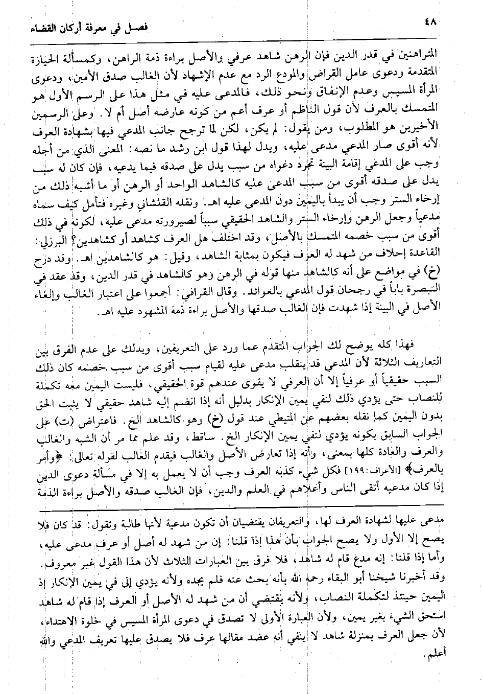 المتراهنين فِي قدر الدّين فَإِن الرَّهْن شَاهد عرفي وَالْأَصْل بَرَاءَة ذمَّة الرَّاهِن، وكمسألة الْحِيَازَة الْمُتَقَدّمَة وَدَعوى عَامل الْقَرَاض وَالْمُودع الرَّد مَعَ عدم الْإِشْهَاد لِأَن الْغَالِب صدق الْأمين، وَدَعوى الْمَرْأَة الْمَسِيس وَعدم الْإِنْفَاق وَنَحْو ذَلِك، فالمدعى عَلَيْهِ فِي مثل هَذَا على الرَّسْم الأول هُوَ المتمسك بِالْعرْفِ لِأَن قَول النَّاظِم أَو عرف أَعم من كَونه عَارضه أصل أم لَا. وعَلى الرسمين الْأَخيرينِ هُوَ الْمَطْلُوب، وَمن يَقُول: لم يكن، لَكِن لما ترجح جَانب الْمُدَّعِي فِيهَا بِشَهَادَة الْعرف لِأَنَّهُ أقوى صَار الْمُدَّعِي مدعى عَلَيْهِ، وَيدل لهَذَا قَول ابْن رشد مَا نَصه: الْمَعْنى الَّذِي من أَجله وَجب على الْمُدَّعِي إِقَامَة الْبَيِّنَة تجرد دَعْوَاهُ من سَبَب يدل على صدقه فِيمَا يَدعِيهِ، فَإِن كَانَ لَهُ سَبَب يدل على صدقه أقوى من سَبَب الْمُدعى عَلَيْهِ كالشاهد الْوَاحِد أَو الرَّهْن أَو مَا أشبه ذَلِك من إرخاء السّتْر وَجب أَن يبْدَأ بِالْيَمِينِ دون الْمُدعى عَلَيْهِ اه. وَنَقله القلشاني وَغَيره فَتَأمل كَيفَ سَمَّاهُ مُدعيًا وَجعل الرَّهْن وإرخاء السّتْر وَالشَّاهِد الْحَقِيقِيّ سَببا لصيرورته مدعى عَلَيْهِ، لكَونه فِي ذَلِك أقوى من سَبَب خَصمه المتمسك بِالْأَصْلِ، وَقد اخْتلف هَل الْعرف كشاهد أَو كشاهدين؟ الْبُرْزُليّ: الْقَاعِدَة إحلاف من شهد لَهُ الْعرف فَيكون بِمَثَابَة الشَّاهِد، وَقيل: هُوَ كالشاهدين اه. وَقد درج (خَ) فِي مَوَاضِع على أَنه كالشاهد مِنْهَا قَوْله فِي الرَّهْن وَهُوَ كالشاهد فِي قدر الدّين، وَقد عقد فِي التَّبْصِرَة بَابا فِي رُجْحَان قَول الْمُدَّعِي بالعوائد. وَقَالَ الْقَرَافِيّ: أَجمعُوا على اعْتِبَار الْغَالِب وإلغاء الأَصْل فِي الْبَيِّنَة إِذا شهِدت فَإِن الْغَالِب صدقهَا وَالْأَصْل بَرَاءَة ذمَّة الْمَشْهُود عَلَيْهِ اه. فَهَذَا كُله يُوضح لَك الْجَواب الْمُتَقَدّم عَمَّا ورد على التعريفين، ويدلك على عدم الْفرق بَين التعاريف الثَّلَاثَة لِأَن الْمُدَّعِي قد يَنْقَلِب مدعى عَلَيْهِ لقِيَام سَبَب أقوى من سَبَب خَصمه كَانَ ذَلِك السَّبَب حَقِيقِيًّا أَو عرفياً إِلَّا أَن الْعرفِيّ لَا يقوى عِنْدهم قُوَّة الْحَقِيقِيّ فَلَيْسَتْ الْيَمين مَعَه تَكْمِلَة للنصاب حَتَّى يُؤَدِّي ذَلِك لنفي يَمِين الْإِنْكَار بِدَلِيل أَنه إِذا انْضَمَّ إِلَيْهِ شَاهد حَقِيقِيّ لَا يثبت الْحق بِدُونِ الْيَمين كَمَا نَقله بَعضهم عَن المتيطي عِنْد قَول (خَ) وَهُوَ كالشاهد الخ. فاعتراض (ت) على الْجَواب السَّابِق بِكَوْنِهِ يُؤَدِّي لنفي يَمِين الْإِنْكَار الخ. سَاقِط، وَقد علم مِمَّا مر أَن الشّبَه وَالْغَالِب وَالْعرْف وَالْعَادَة كلهَا بِمَعْنى، وَأَنه إِذا تعَارض الأَصْل وَالْغَالِب فَيقدم الْغَالِب لقَوْله تَعَالَى: وَأمر بِالْعرْفِ} (الْأَعْرَاف: 199) فَكل شَيْء كذبه الْعرف وَجب أَن لَا يعْمل بِهِ إِلَّا فِي مَسْأَلَة دَعْوَى الدّين إِذا كَانَ مدعيه أتقى النَّاس وَأَعْلَاهُمْ فِي الْعلم وَالدّين، فَإِن الْغَالِب صدقه وَالْأَصْل بَرَاءَة الذِّمَّة