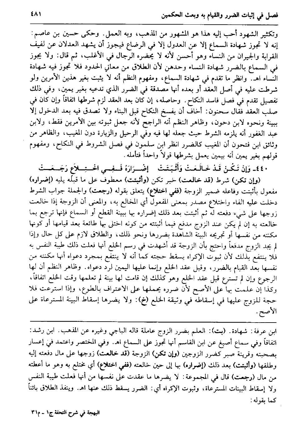 وتكثير الشُّهُود أحب إِلَيْهِ هَذَا هُوَ الْمَشْهُور من الْمَذْهَب، وَبِه الْعَمَل. وَحكى حُسَيْن بن عَاصِم: إِنَّه لَا تجوز شَهَادَة السماع إِلَّا عَن الْعُدُول إِلَّا فِي الرَّضَاع فَيجوز أَن يشْهد العدلان عَن لفيف الْقَرَابَة وَالْجِيرَان من النِّسَاء وَهُوَ أحسن لِأَنَّهُ لَا يحضرهُ الرِّجَال فِي الْأَغْلَب، ثمَّ قَالَ: وَلَا يجوز فِي السماع بِالضَّرَرِ شَهَادَة النِّسَاء وحدهن لِأَن الطَّلَاق من مَعَاني الْحُدُود فَلَا تجوز فِيهِ شَهَادَة النِّسَاء اه. وَانْظُر مَا تقدم فِي شَهَادَة السماع، وَمَفْهُوم النّظم أَنه لَا يثبت بِغَيْر هذَيْن الْأَمريْنِ وَلَو شرطت عَلَيْهِ فِي أصل العقد أَو بعده أَنَّهَا مصدقة فِي الضَّرَر الَّذِي تدعيه بِغَيْر يَمِين، وَفِي ذَلِك تَفْصِيل تقدم فِي فصل فَاسد النِّكَاح. وَحَاصِله، إِن كَانَ بعد العقد لزم شَرطهَا اتِّفَاقًا وَإِن كَانَ فِي صلب العقد فَقَالَ سَحْنُون: أَخَاف أَن يفْسخ النِّكَاح قبل الْبناء وَلَا تصدق فِيهِ بعد الدُّخُول إِلَّا بِبَيِّنَة وَنَحْوه لِابْنِ دحون، وَظَاهر النّظم أَنه الرَّاجِح لِأَنَّهُ جعل ثُبُوته بَين الْأَمريْنِ فَقَط، وَلابْن عبد الغفور أَنه يلْزمه الشَّرْط حَيْثُ جعله لَهَا فِيهِ وَفِي الرحيل والزيارة دون المغيب، وَالظَّاهِر من وثائق ابْن فتحون أَن المغيب كالضرر انْظُر ابْن سَلمُون فِي فصل الشُّرُوط فِي النِّكَاح، وَمَفْهُوم قَوْلهم بِغَيْر يَمِين أَنه بِيَمِين يعْمل بشرطها قولا وَاحِدًا فَتَأَمّله. وَإنْ تَكُنْ قَدْ خَالَعَتْ وَأَثْبَتَتْ إضْرَارَهُ فَفِي اخْتِلاَعٍ رَجَعَتْ (وَإِن تكن) شَرط (قد خالعت) خبر تكن (وأثبتت) مَعْطُوف على مَا قبله يَلِيهِ (إضراره) مفعول بأثبتت وفاعله ضمير الزَّوْجَة (فَفِي اختلاع) يتَعَلَّق بقوله (رجعت) وَالْجُمْلَة جَوَاب الشَّرْط دخلت عَلَيْهِ الْفَاء واختلاع مصدر بِمَعْنى الْمَفْعُول أَي المخالع بِهِ، وَالْمعْنَى أَن الزَّوْجَة إِذا خالعت زَوجهَا على شَيْء دَفعته لَهُ ثمَّ أَثْبَتَت بعد ذَلِك إضراره بهَا بِبَيِّنَة الْقطع أَو السماع فَإِنَّهَا ترجع بِمَا خالعته بِهِ إِن لم يكن عِنْد الزَّوْج مدفع فِيمَا أثبتته من كَونه اختلى بهَا طَائِعَة بعد قِيَامهَا أَو كَونهَا مكنته من نَفسهَا أَو تجريحه الْبَيِّنَة الشاهدة بضررها وَنَحْو ذَلِك، وَالطَّلَاق لَازم على كل حَال وَإِذا لم يجد الزَّوْج مدفعاً وَاحْتج بِأَن الزَّوْجَة قد أشهدت فِي رسم الْخلْع أَنَّهَا فعلت ذَلِك طيبَة النَّفس بِهِ فَلَا ينْتَفع بذلك لِأَن ثُبُوت الْإِكْرَاه يسْقط حجَّته كَمَا أَنه لَا ينْتَفع بِمُجَرَّد دَعْوَاهُ أَنَّهَا مكنته من نَفسهَا بعد الْقيام بِالضَّرَرِ، وَقبل عقد الْخلْع وَإِنَّمَا عَلَيْهَا الْيَمين لرد دَعْوَاهُ. وَظَاهر النّظم أَن لَهَا الرُّجُوع وَإِن لم تسترع قبل عقد الْخلْع وَهُوَ كَذَلِك إِن قَامَت لَهَا بَيِّنَة لم تعلمهَا وَقت الْخلْع اتِّفَاقًا، وَكَذَا إِن علمت بهَا على الْأَصَح لِأَن ضَرَره يحملهَا على الِاعْتِرَاف بالطوع، وَإِذا استرعت فَلَا حجَّة للزَّوْج عَلَيْهَا فِي إِسْقَاطه فِي وَثِيقَة الْخلْع (خَ) : وَلَا يَضرهَا إِسْقَاط الْبَيِّنَة المسترعاة على الْأَصَح.