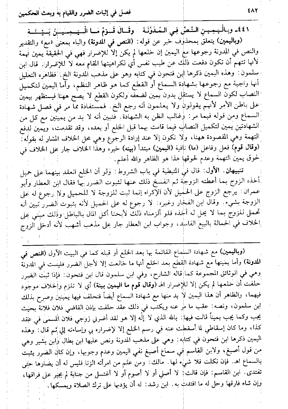 وبالْيَمِينِ النَّصَّ فِي المُدَوَّنَهْ وقَالَ قَوْمٌ مَا الْيَمِينُ بَيِّنَهْ (وباليمين) يتَعَلَّق بِمَحْذُوف خبر عَن قَوْله: (النَّص فِي الْمُدَوَّنَة) وَالْبَاء بِمَعْنى (مَعَ) وَالتَّقْدِير وَالنَّص فِي الْمُدَوَّنَة رُجُوعهَا مَعَ الْيَمين إِن خلعها لم يكن إِلَّا للإضرار فَهِيَ فِي الْحَقِيقَة يَمِين تُهْمَة لِأَنَّهَا تتهم أَن تكون دفعت ذَلِك عَن طيب نفس أَي لكراهيتها الْمقَام مَعَه لَا للإضرار. قَالَ ابْن سَلمُون: وَهَذِه الْيَمين ذكرهَا ابْن فتحون فِي كِتَابه وَهُوَ على مَذْهَب الْمُدَوَّنَة الخ. فَظَاهره التَّعْلِيل أَنَّهَا وَاجِبَة مَعَ رُجُوعهَا بِشَهَادَة السماع أَو الْقطع كَمَا هُوَ ظَاهر النّظم، وَأما الْيَمين لتكميل النّصاب لكَون السماع لَا يسْتَقلّ بِدُونِ يَمِين لضَعْفه وَلكَون الْقطع لَا يَصح هَهُنَا فيستظهر بِيَمِين على بَاطِن الْأَمر لأَنهم يَقُولُونَ وَلَا يعلمُونَ أَنه رَجَعَ الخ. فمستفادة مِمَّا مر فِي فصل شَهَادَة السماع وَمن قَوْله فِيمَا مر: وغالب الظَّن بِهِ الشَّهَادَة. فَتبين أَنه لَا بُد من يمينين مَعَ كل من الشَّهَادَتَيْنِ يَمِين لتكميل النّصاب فِيمَا قَامَت بهما قبل الْخلْع أَو بعده، وَقد تقدّمت، وَيَمِين لدفع التُّهْمَة وَهِي الْمَقْصُودَة هَهُنَا، وَلَا تكون إِلَّا عِنْد إِرَادَة الرُّجُوع وَهِي مَحل الْخلاف الْمشَار لَهُ بقوله: (وَقَالَ قوم) فعل وفاعل (مَا) نَافِيَة (الْيَمين) مُبْتَدأ (بَينه) خَبره وَهَذَا الْخلاف جَار على الْخلاف فِي لُحُوق يَمِين التُّهْمَة وَعدم لحوقها هَذَا هُوَ الظَّاهِر وَالله أعلم. تَنْبِيهَانِ. الأول: قَالَ فِي الْمُتَيْطِيَّة فِي بَاب الشُّرُوط: وَلَو أَن الْخلْع انْعَقَد بَينهمَا على حميل أَخذه الزَّوْج بِمَا أَعطَتْهُ الزَّوْجَة ثمَّ انْفَسَخ ذَلِك عَنْهَا لثُبُوت الضَّرَر بهَا فَقَالَ ابْن الْعَطَّار وَأَبُو عمرَان: يرجع الزَّوْج على الْحميل لِأَن الْإِكْرَاه إِنَّمَا ثَبت للزَّوْجَة لَا للحميل وَلَا رُجُوع لَهُ على الزَّوْجَة بِشَيْء. وَقَالَ ابْن الفخار وَغَيره: لَا رُجُوع لَهُ على الْحميل لِأَنَّهُ بِثُبُوت الضَّرَر تبين أَنه تحمل للزَّوْج بِمَا لَا يحل لَهُ أَخذه فَلَو ألزمناه ذَلِك لأبحنا أكل المَال بِالْبَاطِلِ وَذَلِكَ مَبْنِيّ على الْخلاف فِي الْحمالَة بِالْبيعِ الْفَاسِد، وَجَوَاب ابْن الْعَطَّار جَار على مَذْهَب أَشهب لِأَنَّهُ أَدخل الزَّوْج