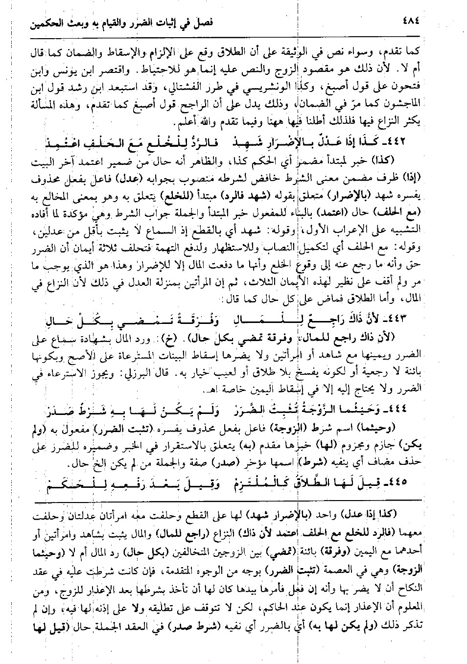 كَمَا تقدم، وَسَوَاء نَص فِي الْوَثِيقَة على أَن الطَّلَاق وَقع على الْإِلْزَام والإسقاط وَالضَّمان كَمَا قَالَ أم لَا. لِأَن ذَلِك هُوَ مَقْصُود الزَّوْج وَالنَّص عَلَيْهِ إِنَّمَا هُوَ للِاحْتِيَاط. وَاقْتصر ابْن يُونُس وَابْن فتحون على قَول أصبغ وَكَذَا الونشريسي فِي طرر الفشتالي، وَقد استبعد ابْن رشد قَول ابْن الْمَاجشون كَمَا مرّ فِي الضَّمَان، وَذَلِكَ يدل على أَن الرَّاجِح قَول أصبغ كَمَا تقدم، وَهَذِه الْمَسْأَلَة يكثر النزاع فِيهَا فَلذَلِك أطلنا فِيهَا هَهُنَا وَفِيمَا تقدم وَالله أعلم. كَذَا إذَا عَدْلٌ بالإضْرَارِ شَهِدْ فالرَّدُّ لِلْخُلْعِ مَعَ الحَلْفِ اعْتُمِدْ (كَذَا) خبر لمبتدأ مُضْمر أَي الحكم كَذَا، وَالظَّاهِر أَنه حَال من ضمير اعْتمد آخر الْبَيْت (إِذا) ظرف مضمن معنى الشَّرْط خافض لشرطه مَنْصُوب بجوابه (عدل) فَاعل بِفعل مَحْذُوف يفسره شهد (بالإضرار) مُتَعَلق بقوله (شهد فالرد) مُبْتَدأ (لِلْخلعِ) يتَعَلَّق بِهِ وَهُوَ بِمَعْنى المخالع بِهِ (مَعَ الْحلف) حَال (اعْتمد) بِالْبِنَاءِ للْمَفْعُول خبر الْمُبْتَدَأ وَالْجُمْلَة جَوَاب الشَّرْط وَهِي مُؤَكدَة لما أَفَادَهُ التَّشْبِيه على الْإِعْرَاب الأول، وَقَوله: شهد أَي بِالْقطعِ إِذْ السماع لَا يثبت بِأَقَلّ من عَدْلَيْنِ، وَقَوله: مَعَ الْحلف أَي لتكميل النّصاب وللاستظهار ولدفع التُّهْمَة فتحلف ثَلَاثَة أَيْمَان أَن الضَّرَر حق وَأَنه مَا رَجَعَ عَنهُ إِلَى وُقُوع الْخلْع وَأَنَّهَا مَا دفعت المَال إِلَّا للإضرار وَهَذَا هُوَ الَّذِي يُوجب مَا مر وَلم أَقف على نَظِير لهَذِهِ الْأَيْمَان الثَّلَاث، ثمَّ إِن الْمَرْأَتَيْنِ بِمَنْزِلَة الْعدْل فِي ذَلِك لِأَن النزاع فِي المَال، وَأما الطَّلَاق فماض على كل حَال كَمَا قَالَ: لأنَّ ذَاكَ رَاجِعٌ لِلْمَالِ وَفُرْقَةٌ تَمْضي بِكُلِّ حَالِ (لِأَن ذَاك رَاجع لِلْمَالِ، وَفرْقَة تمْضِي بِكُل حَال) . (خَ) : ورد المَال بِشَهَادَة سَماع على الضَّرَر ويمينها مَعَ شَاهد أَو امْرَأتَيْنِ وَلَا يَضرهَا إِسْقَاط الْبَينَات المسترعاة على الْأَصَح وبكونها بَائِنَة لَا رَجْعِيَّة أَو لكَونه يفْسخ بِلَا طَلَاق أَو لعيب خِيَار بِهِ. قَالَ الْبُرْزُليّ: وَيجوز الاسترعاء فِي الضَّرَر وَلَا يحْتَاج إِلَيْهِ إِلَّا فِي إِسْقَاط الْيَمين خَاصَّة اه. وَحَيْثُما الزَّوْجَةُ تُثْبِتُ الضَّرَرْ وَلَمْ يَكُنْ لَهَا بِهِ شَرْطٌ صَدَرْ (وحيثما) اسْم شَرط (الزَّوْجَة) فَاعل بِفعل مَحْذُوف يفسره (تثبت الضَّرَر) مفعول بِهِ (وَلم يكن) جازم ومجزوم (لَهَا) خَبَرهَا مقدم (بِهِ) يتَعَلَّق بالاستقرار فِي الْخَبَر وضميره للضَّرَر على حذف مُضَاف أَي يَنْفِيه (شَرط) اسْمهَا مُؤخر (صدر) صفة وَالْجُمْلَة من لم يكن الخ حَال. قِيلَ لَهَا الطَّلاَقُ كَالْمُلْتَزِمْ وَقِيلَ بَعْدَ رَفْعِهِ لِلْحَكَمْ