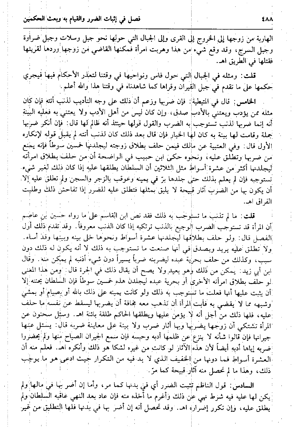 الهاربة من زَوجهَا إِلَى الْخُرُوج إِلَى الْقرى وَإِلَى الْجبَال الَّتِي حولهَا نَحْو جبل وسلات وجبل ضراوة وجبل السرج، وَقد وَقع شَيْء من هَذَا وهربت امْرَأَة فمكنها القَاضِي من زَوجهَا وردهَا لقريتها فَقَتلهَا فِي الطَّرِيق اه. قلت: وَمثله فِي الْجبَال الَّتِي حول فاس ونواحيها فِي وقتنا لتعذر الْأَحْكَام فِيهَا فَيجْرِي حكمهَا على مَا تقدم فِي جبل القيران وقراها كَمَا شَاهَدْنَاهُ فِي وقتنا هَذَا وَالله أعلم. الْخَامِس: قَالَ فِي الْمُتَيْطِيَّة: فَإِن ضربهَا وَزعم أَن ذَلِك على وَجه التَّأْدِيب لذنب أَتَتْهُ فَإِن كَانَ مثله مِمَّن يُؤَدب ويعتني بالأدب صدق، وَإِن كَانَ لَيْسَ من أهل الْأَدَب وَلَا يعتني بِهِ فَعَلَيهِ الْبَيِّنَة أَنه إِنَّمَا ضربهَا لذنب تستوجب بِهِ الضَّرْب وَالْقَوْل قَوْلهَا حِينَئِذٍ أَنه ظَالِم لَهَا قَالَ: فَإِن أنكر ضربهَا جملَة وَقَامَت لَهَا بَيِّنَة بِهِ كَانَ لَهَا الْخِيَار فَإِن قَالَ بعد ذَلِك كَانَ لذنب أَتَتْهُ لم يقبل قَوْله لإنكاره الأول قَالَ: وَفِي الْعُتْبِيَّة عَن مَالك فِيمَن حلف بِطَلَاق زَوجته ليجلدنها خمسين سَوْطًا فَإِنَّهُ يمْنَع من ضربهَا وَتطلق عَلَيْهِ، وَنَحْوه حكى ابْن حبيب فِي الْوَاضِحَة أَن من حلف بِطَلَاق امْرَأَته ليجلدنها أَكثر من عشرَة أسواط مثل الثَّلَاثِينَ أَن السُّلْطَان يطلقهَا عَلَيْهِ إِذا كَانَ ذَلِك لغير شَيْء تستوجبه فَإِن لم يعلم بذلك حَتَّى جلدهَا برّ فِي يَمِينه وعوقب بالزجر والسجن وَلم تطلق عَلَيْهِ إِلَّا أَن يكون بهَا من الضَّرْب آثَار قبيحة لَا يَلِيق بِمِثْلِهَا فَتطلق عَلَيْهِ للضَّرَر إِذا تفاحش ذَلِك وَطلبت الْفِرَاق اه. قلت: مَا لم تذنب مَا تستوجب بِهِ ذَلِك فقد نَص ابْن الْقَاسِم على مَا رَوَاهُ حُسَيْن بن عَاصِم أَن الْمَرْأَة قد تستوجب الضَّرْب الوجيع بالذنب ترتكبه إِذا كَانَ الذَّنب مَعْرُوفا. وَقد تقدم ذَلِك أول الْفَصْل قَالَ: وَلَو حلف بِطَلَاقِهَا ليجلدنها عشرَة أسواط وَنَحْوهَا خلى بَينه وَبَينهَا وَقد أَسَاءَ. وَلَا تطلق عَلَيْهِ يُرِيد وَيصدق فِي أَنَّهَا صنعت مَا تستوجب بِهِ ذَلِك لَا أَنه يكون لَهُ ذَلِك دون سَبَب، وَكَذَلِكَ من حلف بحريّة عَبده ليضربنه ضربا يَسِيرا دون شَيْء أذنبه لم يُمكن مِنْهُ. وَقَالَ ابْن أبي زيد: يُمكن من ذَلِك وَهُوَ بعيد وَلَا يَصح أَن يُقَال ذَلِك فِي الْحرَّة قَالَ: وَمن هَذَا الْمَعْنى لَو حلف بِطَلَاق امْرَأَته الْأُخْرَى أَو بحريّة عَبده ليجلدن هَذِه خمسين سَوْطًا فَإِن السُّلْطَان يحنثه إِلَّا أَن يثبت عَلَيْهَا أَنَّهَا فعلت مَا تستوجب بِهِ ذَلِك وَلَو كَانَت يَمِينه على ذَلِك بِاللَّه أَو بصيام أَو بمشي وَشبهه مِمَّا لَا يقْضِي بِهِ فَأَبت الْمَرْأَة أَن تذْهب مَعَه مَخَافَة أَن يضْربهَا ليسقط عَن نَفسه مَا حلف عَلَيْهِ، فلهَا ذَلِك من أجل أَنه لَا يُؤمن عَلَيْهَا ويطلقها الْحَاكِم طَلْقَة بَائِنَة اه. وَسُئِلَ سَحْنُون عَن الْمَرْأَة تَشْتَكِي أَن زَوجهَا يضْربهَا وَبهَا أثار ضرب وَلَا بَيِّنَة على مُعَاينَة ضربه قَالَ: يسئل عَنْهَا جِيرَانهَا فَإِن قَالُوا شَأْنه لَا ينْزع عَن ظلمها أدبه وحبسه فَإِن سمع الْجِيرَان الصياح مِنْهَا وَلم يحضروا ضربه إِيَّاهَا أدبه أَيْضا لِأَن هَذِه الْآثَار لَو كَانَت من غَيره لشكا هُوَ ذَلِك وَأنْكرهُ اه. فَعلم مِنْهُ أَن الْعشْرَة أسواط فَمَا دونهَا من الْخَفِيف الَّذِي لَا بُد فِيهِ من التّكْرَار حَيْثُ ادّعى هُوَ مَا يُوجب ذَلِك، وَهَذَا مَا لم تحصل مِنْهُ آثَار قبيحة كَمَا مرّ. السَّادِس: قَول النَّاظِم تثبت الضَّرَر أَي فِي بدنهَا كَمَا مر، وَأما إِن أضرّ بهَا فِي مَالهَا وَلم يكن لَهَا عَلَيْهِ فِيهِ شَرط نهي عَن ذَلِك وأغرم مَا أَخذه مِنْهُ فَإِن عَاد بعد النَّهْي عاقبه السُّلْطَان وَلم يُطلق عَلَيْهِ، وَإِن تكَرر إضراره اه. وَقد تحصل أَنه
