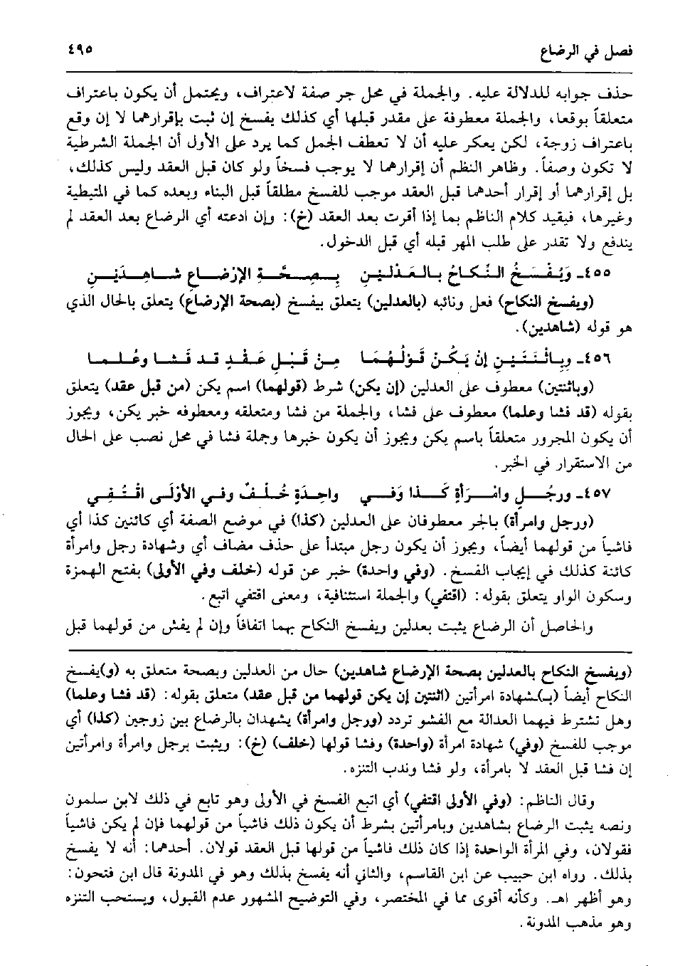 حذف جَوَابه للدلالة عَلَيْهِ. وَالْجُمْلَة فِي مَحل جر صفة لاعتراف، وَيحْتَمل أَن يكون باعتراف مُتَعَلقا بوقعا، وَالْجُمْلَة معطوفة على مُقَدّر قبلهَا أَي كَذَلِك يفْسخ إِن ثَبت بإقرارهما لَا إِن وَقع باعتراف زَوْجَة، لَكِن يُعَكر عَلَيْهِ أَن لَا تعطف الْجمل كَمَا يرد على الأول أَن الْجُمْلَة الشّرطِيَّة لَا تكون وَصفا. وَظَاهر النّظم أَن إقرارهما لَا يُوجب فسخا وَلَو كَانَ قبل العقد وَلَيْسَ كَذَلِك، بل إقرارهما أَو إِقْرَار أَحدهمَا قبل العقد مُوجب للْفَسْخ مُطلقًا قبل الْبناء وَبعده كَمَا فِي الْمُتَيْطِيَّة وَغَيرهَا، فيقيد كَلَام النَّاظِم بِمَا إِذا أقرَّت بعد العقد (خَ) : وَإِن ادَّعَتْهُ أَي الرَّضَاع بعد العقد لم ينْدَفع وَلَا تقدر على طلب الْمهْر قبله أَي قبل الدُّخُول. وَيُفْسَخُ النِّكاحُ بالعَدْليْنِ بِصِحَّةِ الإرْضاعِ شاهِدَيْنِ (وَيفْسخ النِّكَاح) فعل ونائبه (بالعدلين) يتَعَلَّق بيفسخ (بِصِحَّة الْإِرْضَاع) يتَعَلَّق بِالْحَال الَّذِي هُوَ قَوْله (شَاهِدين) . وِبِاثْنَتَيْنِ إنْ يَكُنْ قَوْلُهُمَا مِنْ قَبْلِ عَقْدٍ قد فَشا وعُلما (وباثنتين) مَعْطُوف على العدلين (إِن يكن) شَرط (قَوْلهمَا) اسْم يكن (من قبل عقد) يتَعَلَّق بقوله (قد فَشَا وعلما) مَعْطُوف على فَشَا، وَالْجُمْلَة من فَشَا ومتعلقه ومعطوفه خبر يكن، وَيجوز أَن يكون الْمَجْرُور مُتَعَلقا باسم يكن وَيجوز أَن يكون خَبَرهَا وَجُمْلَة فَشَا فِي مَحل نصب على الْحَال من الِاسْتِقْرَار فِي الْخَبَر. ورجُلٍ وامْرَأةٍ كَذا وَفي واحِدَةٍ خُلْفٌ وَفِي الأوْلَى اقْتُفِي (وَرجل وَامْرَأَة) بِالْجَرِّ معطوفان على العدلين (كَذَا) فِي مَوضِع الصّفة أَي كائنين كَذَا أَي فاشياً من قَوْلهمَا أَيْضا، وَيجوز أَن يكون رجل مُبْتَدأ على حذف مُضَاف أَي وَشَهَادَة رجل وَامْرَأَة كائنة كَذَلِك فِي إِيجَاب الْفَسْخ. (وَفِي وَاحِدَة) خبر عَن قَوْله (خلف وَفِي الأولى) بِفَتْح الْهمزَة وَسُكُون الْوَاو يتَعَلَّق بقوله: (اقتفي) وَالْجُمْلَة استئنافية، وَمعنى اقتفي اتبع. وَالْحَاصِل أَن الرَّضَاع يثبت بعدلين وَيفْسخ النِّكَاح بهما اتفافاً وَإِن لم يفش من قَوْلهمَا قبل