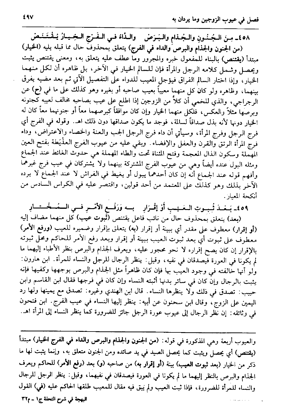 مِنَ الجُنُونِ والجُذامِ والبَرَصْ والدَّاءُ فِي الفَرْجِ الخِيارُ يُقْتَنَصْ (من الْجُنُون والجذام والبرص والداء فِي الْفرج) يتَعَلَّق بِمَحْذُوف حَال مِمَّا قبله يَلِيهِ (الْخِيَار) مُبْتَدأ (يقتنص) بِالْبِنَاءِ للْمَفْعُول خَبره وَالْمَجْرُور وَمَا عطف عَلَيْهِ يتَعَلَّق بِهِ، وَمعنى يقتنص يثبت وَيحصل وَشَمل كَلَامه الرجل وَالْمَرْأَة فَإِن للسالم الْخِيَار فِي الآخر، بل ظَاهره أَن لكل مِنْهُمَا الْخِيَار، وَإِذا اخْتَار السَّالِم الْفِرَاق فيؤجل الْمَعِيب للدواء على التَّفْصِيل الْآتِي ثمَّ بعد مضيه يفرق بَينهمَا، وَظَاهره وَلَو كَانَ كل مِنْهُمَا معيبا بِعَيْب صَاحبه أَو بِغَيْرِهِ وَهُوَ كَذَلِك على مَا فِي (ح) عَن الرجراجي، وَالَّذِي للخمي أَن كلاًّ من الزَّوْجَيْنِ إِذا اطلع على عيب بِصَاحِبِهِ مُخَالف لعيبه كجنونه وبرصها مثلا وَالْعَكْس، فَلِكُل مِنْهُمَا الْخِيَار وَإِن كَانَ مُوَافقا كبرصهما مَعًا أَو جنونهما مَعًا كَانَ لَهُ الْخِيَار دونهَا لِأَنَّهُ بذل صَدَاقا لسالمة، فَوجدَ مَا يكون صَدَاقهَا دون ذَلِك اه. وَقَوله فِي الْفرج أَي فرج الرجل وَفرج الْمَرْأَة، وَسَيَأْتِي أَن دَاء فرج الرجل الْجب والعنة والخصاء والاعتراض، وداء فرج الْمَرْأَة الرتق والقرن والعفل والإفضاء. وَبَقِي عَلَيْهِ من عُيُوب الْفرج العذْيَطة بِفَتْح الْعين الْمُهْملَة وَسُكُون الذَّال الْمُعْجَمَة وَفتح الْمُثَنَّاة تَحت والطاء الْمُهْملَة هِيَ حُدُوث الْغَائِط عِنْد الْجِمَاع وَمثله الْبَوْل عِنْده أَيْضا وَهِي من عُيُوب الْفرج الْمُشْتَركَة بَينهمَا وَلَا يَشْتَرِكَانِ فِي عيب فرج غَيرهمَا وَأفهم قَوْله عِنْد الْجِمَاع أَنه إِن كَانَ أَحدهمَا يَبُول أَو يغيط فِي الْفراش لَا عِنْد الْجِمَاع لَا يردهُ الآخر بذلك وَهُوَ كَذَلِك على الْمُعْتَمد من أحد قَوْلَيْنِ، وَاقْتصر عَلَيْهِ فِي الكراس السَّادِس من أنكحة المعيار. بَعْدَ ثُبوتِ العَيْبِ أَوْ إقْرَارِ بِهِ وَرَفْعِ الأمْرِ فِي المُخْتارِ (بعد) يتَعَلَّق بِمَحْذُوف حَال من نَائِب فَاعل يقتنص (ثُبُوت عيب) كل مِنْهُمَا مُضَاف إِلَيْهِ (أَو إِقْرَار) مَعْطُوف على مُقَدّر أَي بِبَيِّنَة أَو إِقْرَار (بِهِ) يتَعَلَّق بِإِقْرَار وضميره للعيب (وَرفع الْأَمر) مَعْطُوف على ثُبُوت أَي بعد ثُبُوت الْعَيْب بِبَيِّنَة أَو إِقْرَار وَبعد رفع الْأَمر للْحَاكِم وَمحل ثُبُوته بِالْإِقْرَارِ إِن كَانَ يَصح إِقْرَاره لَا نَحْو مَحْجُور عَلَيْهِ، وَيعرف الجذام والبرص بِنَظَر الْأَطِبَّاء إِلَيْهِمَا مَا لم يَكُونَا فِي الْعَوْرَة فيصدقان فِي نَفْيه، وَقيل: ينظر الرِّجَال للرجل وَالنِّسَاء للْمَرْأَة. ابْن هَارُون: وَلَو أَنَّهَا خالفته فِي وجود الْعَيْب بهَا فَإِن كَانَ ظَاهرا مثل الجذام والبرص بوجهها وكفيها فَإِنَّهُ يثبت بِالرِّجَالِ وَإِن كَانَ فِي سَائِر بدنهَا أثْبته النِّسَاء وَإِن كَانَ فِي فرجهَا فَقَالَ ابْن الْقَاسِم وَابْن حبيب: تصدق فِي ذَلِك وَلَا ينظرها النِّسَاء. قَالَ ابْن الْهِنْدِيّ وَغَيره: تصدق مَعَ يَمِينهَا وَلها رد الْيَمين على الزَّوْج، وَقَالَ ابْن سَحْنُون عَن أَبِيه: ينظر إِلَيْهَا النِّسَاء فِي عيب الْفرج. ابْن فتحون فِي وثائقه: إِن نظر الرِّجَال إِلَى عُيُوب عَورَة الرجل جَائِز للضَّرُورَة كَمَا ينظر النِّسَاء إِلَى الْمَرْأَة اه.