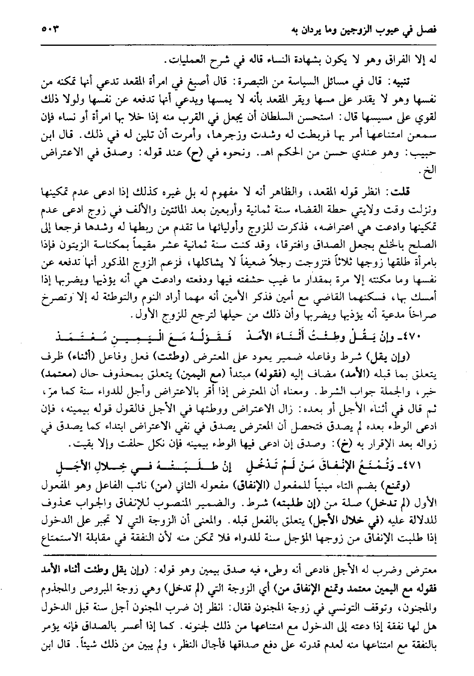 لَهُ إِلَّا الْفِرَاق وَهُوَ لَا يكون بِشَهَادَة النِّسَاء قَالَه فِي شرح العمليات. تَنْبِيه: قَالَ فِي مسَائِل السياسة من التَّبْصِرَة: قَالَ أصبغ فِي امْرَأَة المقعد تَدعِي أَنَّهَا تمكنه من نَفسهَا وَهُوَ لَا يقدر على مَسهَا ويقر المقعد بِأَنَّهُ لَا يَمَسهَا وَيَدعِي أَنَّهَا تَدْفَعهُ عَن نَفسهَا وَلَوْلَا ذَلِك لقوي على مسيسها قَالَ: اسْتحْسنَ السُّلْطَان أَن يَجْعَل فِي الْقرب مِنْهُ إِذا خلا بهَا امْرَأَة أَو نسَاء فَإِن سمعن امتناعها أَمر بهَا فَربطت لَهُ وشدت وزجرها، وَأمرت أَن تلين لَهُ فِي ذَلِك. قَالَ ابْن حبيب: وَهُوَ عِنْدِي حسن من الحكم اه. وَنَحْوه فِي (ح) عِنْد قَوْله: وَصدق فِي الِاعْتِرَاض الخ. قلت: انْظُر قَوْله المقعد، وَالظَّاهِر أَنه لَا مَفْهُوم لَهُ بل غَيره كَذَلِك إِذا ادّعى عدم تمكينها وَنزلت وَقت ولايتي حطة الْقَضَاء سنة ثَمَانِيَة وَأَرْبَعين بعد الْمِائَتَيْنِ وَالْألف فِي زوج ادّعى عدم تمكينها وَادعت هِيَ اعتراضه، فَذكرت للزَّوْج وأوليائها مَا تقدم من ربطها لَهُ وشدها فَرَجَعَا إِلَى الصُّلْح بِالْخلْعِ بِجعْل الصَدَاق وافترقا، وَقد كنت سنة ثَمَانِيَة عشر مُقيما بمكناسة الزَّيْتُون فَإِذا بِامْرَأَة طَلقهَا زَوجهَا ثَلَاثًا فَتزوّجت رجلا ضَعِيفا لَا يشاكلها، فَزعم الزَّوْج الْمَذْكُور أَنَّهَا تَدْفَعهُ عَن نَفسهَا وَمَا مكنته إِلَّا مرّة بِمِقْدَار مَا غيب حشفته فِيهَا ودفعته وَادعت هِيَ أَنه يؤذيها ويضربها إِذا أمسك بهَا، فسكنهما القَاضِي مَعَ أَمِين فَذكر الْأمين أَنه مهما أَرَادَ النّوم والتوطئة لَهُ إِلَّا وتصرخ صراخاً مدعية أَنه يؤذيها ويضربها وَأَن ذَلِك من حيلها لترجع للزَّوْج الأول. وإنْ يَقُلْ وطِئْتُ أَثْنَاءَ الأمَدْ فَقَوْلُهُ مَعَ الْيَمِينِ مُعْتَمَدْ (وَإِن يقل) شَرط وفاعله ضمير يعود على الْمُعْتَرض (وطِئت) فعل وفاعل (أثْنَاء) ظرف يتَعَلَّق بِمَا قبله (الأمد) مُضَاف إِلَيْهِ (فَقَوله) مُبْتَدأ (مَعَ الْيَمين) يتَعَلَّق بِمَحْذُوف حَال (مُعْتَمد) خبر، وَالْجُمْلَة جَوَاب الشَّرْط. وَمَعْنَاهُ أَن الْمُعْتَرض إِذا أقرّ بالاعتراض وَأجل للدواء سنة كَمَا مرّ، ثمَّ قَالَ فِي أثْنَاء الْأَجَل أَو بعده: زَالَ الِاعْتِرَاض وَوَطئهَا فِي الْأَجَل فَالْقَوْل قَوْله بِيَمِينِهِ، فَإِن ادّعى الْوَطْء بعده لم يصدق فَتحصل أَن الْمُعْتَرض يصدق فِي نفي الِاعْتِرَاض ابْتِدَاء كَمَا يصدق فِي زَوَاله بعد الْإِقْرَار بِهِ (خَ) : وَصدق إِن ادّعى فِيهَا الْوَطْء بِيَمِينِهِ فَإِن نكل حَلَفت وَإِلَّا بقيت. وَتُمْنَعُ الإنْفاقَ مَنْ لَمْ تَدْخُلِ إنْ طلَبَتْهُ فِي خِلالِ الأجَلِ (وتمنع) بِضَم التَّاء مَبْنِيا للْمَفْعُول (الْإِنْفَاق) مَفْعُوله الثَّانِي (من) نَائِب الْفَاعِل وَهُوَ الْمَفْعُول الأول (لم تدخل) صلَة من (إِن طلبته) شَرط. وَالضَّمِير الْمَنْصُوب للإنفاق وَالْجَوَاب مَحْذُوف للدلالة عَلَيْهِ (فِي خلال الْأَجَل) يتَعَلَّق بِالْفِعْلِ قبله. وَالْمعْنَى أَن الزَّوْجَة الَّتِي لَا تجبر على الدُّخُول إِذا طلبت الْإِنْفَاق من زَوجهَا الْمُؤَجل سنة للدواء فَلَا تمكن مِنْهُ لِأَن النَّفَقَة فِي مُقَابلَة الِاسْتِمْتَاع