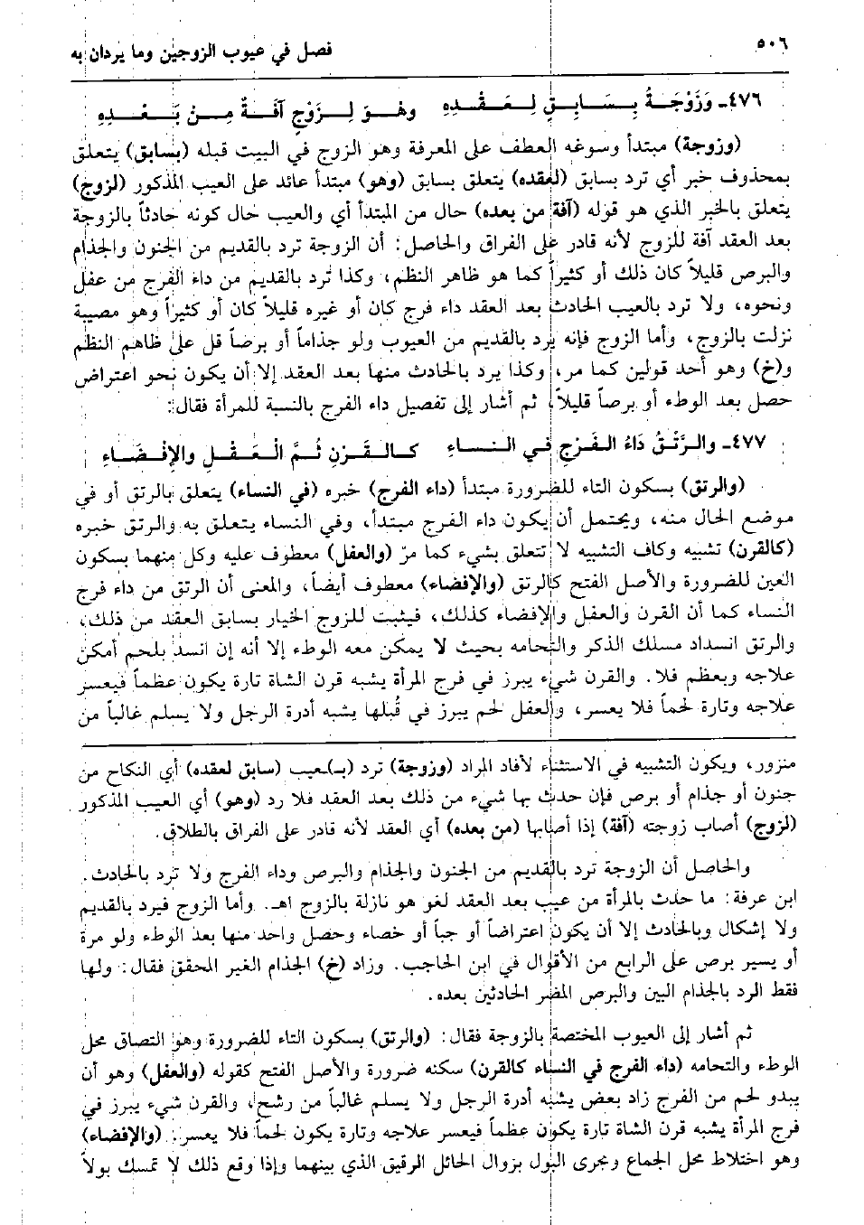وَزَوْجَةُ بِسَابِقٍ لِعَقْدِهِ وهْوَ لِزَوْجٍ آفَةٌ مِنْ بَعْدِهِ (وَزَوْجَة) مُبْتَدأ وسوغه الْعَطف على الْمعرفَة وَهُوَ الزَّوْج فِي الْبَيْت قبله (بسابق) يتَعَلَّق بِمَحْذُوف خبر أَي ترد بسابق (لعقده) يتَعَلَّق بسابق (وَهُوَ) مُبْتَدأ عَائِد على الْعَيْب الْمَذْكُور (لزوج) يتَعَلَّق بالْخبر الَّذِي هُوَ قَوْله (آفَة من بعده) حَال من الْمُبْتَدَأ أَي وَالْعَيْب حَال كَونه حَادِثا بِالزَّوْجَةِ بعد العقد آفَة للزَّوْج لِأَنَّهُ قَادر على الْفِرَاق وَالْحَاصِل: أَن الزَّوْجَة ترد بالقديم من الْجُنُون والجذام والبرص قَلِيلا كَانَ ذَلِك أَو كثيرا كَمَا هُوَ ظَاهر النّظم، وَكَذَا ترد بالقديم من دَاء الْفرج من عفل وَنَحْوه، وَلَا ترد بِالْعَيْبِ الْحَادِث بعد العقد دَاء فرج كَانَ أَو غَيره قَلِيلا كَانَ أَو كثيرا وَهُوَ مُصِيبَة نزلت بِالزَّوْجِ، وَأما الزَّوْج فَإِنَّهُ يرد بالقديم من الْعُيُوب وَلَو جذاماً أَو برصاً قل على ظاهم النّظم و (خَ) وَهُوَ أحد قَوْلَيْنِ كَمَا مر، وَكَذَا يرد بالحادث مِنْهَا بعد العقد إِلَّا أَن يكون نَحْو اعْتِرَاض حصل بعد الْوَطْء أَو برصاً قَلِيلا، ثمَّ أَشَارَ إِلَى تَفْصِيل دَاء الْفرج بِالنِّسْبَةِ للْمَرْأَة فَقَالَ: والرَّتْقُ دَاءُ الفَرْجِ فِي النساءِ كالقَرْنِ ثُمَّ الْعَقْلِ والإِفْضَاءِ (والرتق) بِسُكُون التَّاء للضَّرُورَة مُبْتَدأ (دَاء الْفرج) خَبره (فِي النِّسَاء) يتَعَلَّق بالرتق أَو فِي مَوضِع الْحَال مِنْهُ، وَيحْتَمل أَن يكون دَاء الْفرج مُبْتَدأ، وَفِي النِّسَاء يتَعَلَّق بِهِ والرتق خَبره (كالقرن) تَشْبِيه وكاف التَّشْبِيه لَا تتَعَلَّق بِشَيْء كَمَا مرّ (والعفل) مَعْطُوف عَلَيْهِ وكل مِنْهُمَا بِسُكُون الْعين للضَّرُورَة وَالْأَصْل الْفَتْح كالرتق (والإفضاء) مَعْطُوف أَيْضا، وَالْمعْنَى أَن الرتق من دَاء فرج النِّسَاء كَمَا أَن الْقرن والعفل والإفضاء كَذَلِك، فَيثبت للزَّوْج الْخِيَار بسابق العقد من ذَلِك، والرتق انسداد مَسْلَك الذّكر والتحامه بِحَيْثُ لَا يُمكن مَعَه الْوَطْء إِلَّا أَنه إِن انسد بِلَحْم أمكن علاجه وبعظم فَلَا. والقرن شَيْء يبرز فِي فرج الْمَرْأَة يشبه قرن الشَّاة تَارَة يكون عظما فيعسر علاجه وَتارَة لَحْمًا فَلَا يعسر، والعفل لحم يبرز فِي قُبلها يشبه أدرة الرجل وَلَا يسلم غَالِبا من