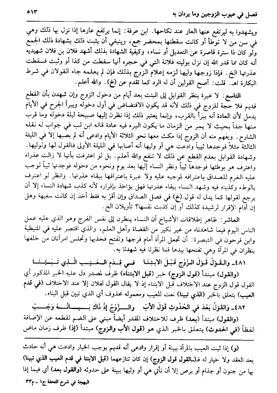 ويشهدوا بِهِ ليرتفع عَنْهَا الْعَار عِنْد نِكَاحهَا. ابْن عَرَفَة: إِنَّمَا يرْتَفع عارها إِذا نزل بهَا ذَلِك وَهِي فِي سنّ من لَا تُوطأ أَو كَانَت سقطتها بِمحضر جمع، وَيَنْبَغِي أَن يثبت ذَلِك بِشَهَادَة ذَلِك الْجمع وَلَو كَانَ ذَا ستْرَة قَاصِرَة عَن التَّعْدِيل أَو نسَاء، وَكَيْفِيَّة الشَّهَادَة بذلك أشهد فلَان بن فلَان شهيديه أَنه كَانَ مِمَّا قدر الله إِن نزل بوليته فُلَانَة الَّتِي فِي حجره أَنَّهَا سَقَطت من كَذَا أَو وَثَبت فَسَقَطت عذرتها الخ. فَإِذا زَوجهَا وَليهَا لزمَه إِعْلَام الزَّوْج بذلك فَإِن لم يُعلمهُ جَاءَ الْقَوْلَانِ فِي شَرط الْبكارَة اه. قلت: أصح الْقَوْلَيْنِ أَن لَهُ الرَّد كَمَا تقدم عَن (خَ) . وَالله أعلم. التَّاسِع: لَا عِبْرَة بِنَظَر القوابل إِلَى الْبِنْت بعد أَيَّام من دُخُول الزَّوْج وَإِن شهدن بِأَن الْقطع قديم فَلَا حجَّة للزَّوْج فِي ذَلِك لِأَنَّهُ قد يكون الافتضاض فِي أول دُخُوله وَيبرأ الْجرْح فِي الْأَيَّام بدمل لِأَن الْعَادة أَنه يبرأ بِالْقربِ، وَإِنَّمَا يعْتَبر ذَلِك إِذا نظرن إِلَيْهَا صَبِيحَة لَيْلَة دُخُوله وَمَا قرب مِنْهَا جدا بِحَيْثُ لَا يمر من الزَّمَان مَا يكون الْبُرْء فِيهِ عَادَة قَالَه ابْن لب فِي جَوَاب لَهُ نَقله الشَّارِح. وَيفهم مِنْهُ أَن الزَّوْج إِذا مكث مَعهَا نَحْو الثَّلَاثَة الْأَيَّام وَادّعى أَنه لم يصبهَا إِلَّا فِي اللَّيْلَة الثَّالِثَة مثلا فَوَجَدَهَا ثَيِّبًا وَادعت هِيَ أَو وَليهَا أَنه أَصَابَهَا فِي اللَّيْلَة الأولى فَالْقَوْل لَهَا ولوليها. وَشَهَادَة القوابل بِعَدَمِ الْقطع عَن ذَلِك لَا تَنْفَع وَالله أعلم. بل لَو اعْترفت بِأَنَّهَا لَا زَالَت عذراء واعترف هُوَ بِوَطْئِهَا فَوَجَدَهَا ثَيِّبًا وَنظر النِّسَاء إِلَيْهَا بعد يَوْم وَنَحْوه من دُخُوله فوجدنها ثَيِّبًا لوَجَبَ عَلَيْهِ الْغرم للصداق باعترافه لموجبه عَلَيْهِ وَلَا عِبْرَة باعترافها بِبَقَاء عذرتها. وَانْظُر لَو اعْترف بِالْوَطْءِ وكذبته فِيهِ وَشهد النِّسَاء بِبَقَاء عذرتها فَهَل يُؤَاخذ بِإِقْرَارِهِ لِأَنَّهُ كذب شَهَادَة النِّسَاء إِلَّا أَن يرجع لقولها كَمَا يدل لَهُ قَول (خَ) فِي فصل الصَدَاق وَإِن أقرّ بِهِ فَقَط أَخذ إِن كَانَت سَفِيهَة وَهل إِن أدام الْإِقْرَار لرشيدة كَذَلِك أَو إِن كذبت نَفسهَا؟ تَأْوِيلَانِ الخ. الْعَاشِر: ظَاهر إطلاقات الْأَشْيَاخ أَن النِّسَاء ينظرن إِلَى نفس الْفرج وَهُوَ الَّذِي عَلَيْهِ عمل النَّاس الْيَوْم فِيمَا شَاهَدْنَاهُ من غير نَكِير من الْقُضَاة وَأهل الْعلم، وَالَّذِي اقْتصر عَلَيْهِ فِي الْمُتَيْطِيَّة وَابْن فَرِحُونَ فِي التَّبْصِرَة: أَن تجْعَل الْمرْآة أَمَام فرجهَا وتفتح فخذيها وتجلس امْرَأَتَانِ من خلفهَا ينْظرَانِ فِي الْمرْآة وَهِي تفتحها بِيَدِهَا فَمَا نظرتا فِيهِ شهدتا بِهِ. والقَوْلُ قَوْلُ الزَّوْجِ قَبْلَ الابتِنَا فِي قِدَمِ العَيْب الَّذِي تَبَيَّنَا (وَالْقَوْل) مُبْتَدأ (قَول الزَّوْج) خبر (قبل الابتناء) ظرف لمصدر دلّ عَلَيْهِ الْخَبَر الْمَذْكُور أَي القَوْل قَول الزَّوْج عِنْد الِاخْتِلَاف قبل الابتناء إِذْ لَا يُقَال القَوْل لفُلَان إِلَّا عِنْد الِاخْتِلَاف (فِي قدم الْعَيْب) يتَعَلَّق بالْخبر (الَّذِي تَبينا) نعت للعيب ومعموله مَحْذُوف أَي الَّذِي تبين قبل الْبناء. وَالقَوْلُ بَعْدَ فِي الحُدُوثِ قَوْلَ الأبْ والزَّوْجُ إذْ ذَاكَ بَيانُهُ وَجَبْ (وَالْقَوْل) مُبْتَدأ (بعد) ظرف للِاخْتِلَاف الْمُقدر أَيْضا مَبْنِيّ على الضَّم لقطعه عَن الْإِضَافَة لفظا (فِي الْحُدُوث) يتَعَلَّق بالْخبر الَّذِي هُوَ (قَول الْأَب وَالزَّوْج) مُبْتَدأ (إِذْ) ظرف زمَان مَاض