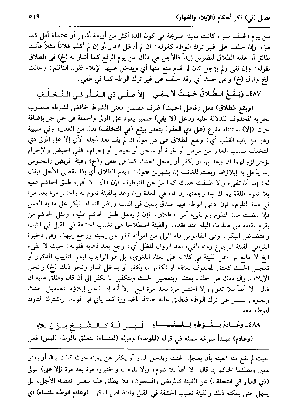 من يَوْم الْحلف سَوَاء كَانَت يَمِينه صَرِيحَة فِي كَون الْمدَّة أَكثر من أَرْبَعَة أشهر أَو مُحْتَملَة أقل كَمَا مرّ، وَإِن حلف على غير ترك الْوَطْء كَقَوْلِه: إِن لم أَدخل الدَّار أَو إِن لم أكلم فلَانا مثلا فَأَنت طَالِق أَو عَلَيْهِ الطَّلَاق ليضربن زيدا فالأجل فِي ذَلِك من يَوْم الرّفْع كَمَا أَشَارَ لَهُ (خَ) فِي الطَّلَاق بقوله: وَإِن نفى وَلم يُؤَجل كَانَ لم أقدم منع مِنْهَا أَي وَيدخل عَلَيْهَا الْإِيلَاء فَقَوْل النَّاظِم: وحانث الخ وَقَول (خَ) وعَلى حنث أَي وَقد حلف على غير ترك الْوَطْء كَمَا فِي طفي. وَيَقَعُ الطَّلاقُ حَيْثُ لَا يَفِي إلاّ عَلَى ذِي العُذْرِ فِي التَّخَلُّفِ (وَيَقَع الطَّلَاق) فعل وفاعل (حَيْثُ) ظرف مضمن معنى الشَّرْط خافض لشرطه مَنْصُوب بجوابه الْمَحْذُوف للدلالة عَلَيْهِ وفاعل (لَا يَفِي) ضمير يعود على الْمولى وَالْجُمْلَة فِي مَحل جر بِإِضَافَة حَيْثُ (إِلَّا) اسْتثِْنَاء مفرغ (على ذِي الْعذر) يتَعَلَّق بيقع (فِي التَّخَلُّف) بدل من الْعذر وَفِي سَبَبِيَّة وَهُوَ من بَاب الْقلب أَي: وَيَقَع الطَّلَاق على كل مول إِن لم يَفِ بعد أَجله الْآتِي إِلَّا على الْمولى ذِي التَّخَلُّف بِسَبَب الْعذر من مرض أَو غيبَة أَو سجن أَو حيض أَو إِحْرَام، فَفِي الْحيض وَالْإِحْرَام يُؤَخر لزوالهما إِن وعد بهَا أَو يكفر أَو يعجل الْحِنْث كَمَا فِي طفي و (خَ) وفيئة الْمَرِيض والمحبوس بِمَا ينْحل بِهِ إيلاؤهما وَبعث للْغَائِب إِن بشهرين فَقَوله: وَيَقَع الطَّلَاق أَي إِذا انْقَضى الْأَجَل فَيُقَال لَهُ: إِمَّا أَن تفيء وَإِلَّا طلقت عَلَيْك كَمَا مرّ عَن الْمُتَيْطِيَّة، فَإِن قَالَ: لَا أفيء طلق الْحَاكِم عَلَيْهِ بِلَا تلوم طَلْقَة يملك بهَا رَجعتهَا إِن فَاء فِي الْعدة وَإِن وعد بالفيئة تلوم لَهُ واختبر مرّة بعد مرّة فِي مُدَّة التَّلَوُّم، فَإِن ادّعى الْوَطْء فِيهَا صدق بِيَمِين فِي الثّيّب وَينظر النِّسَاء للبكر على مَا بِهِ الْعَمَل فَإِن مَضَت مُدَّة التَّلَوُّم وَلم يفىء أَمر بِالطَّلَاق، فَإِن لم يفعل طلق الْحَاكِم عَلَيْهِ، وَمثل الْحَاكِم من يقوم مقَامه من صلحاء البله عِنْد فَقده. والفيئة اصْطِلَاحا هِيَ تغييب الْحَشَفَة فِي الْقبل فِي الثّيّب وافتضاض الْبكر. وَفِي الْقَامُوس فَاء الْمولى من امْرَأَته كفر عَن يَمِينه وَرجع إِلَيْهَا. وَفِي ذخيرة الْقَرَافِيّ الْفَيْئَة الرُّجُوع وَمِنْه الْفَيْء بعد الزَّوَال للظل أَي: رَجَعَ بعد ذَهَابه فَقَوله: حَيْثُ لَا يفىء الخ لَا مَانع من حمل الْفَيْئَة فِي كَلَامه على مَعْنَاهُ اللّغَوِيّ، بل هُوَ الْوَاجِب ليعم التغييب الْمَذْكُور أَو تَعْجِيل الْحِنْث كعتق الْمَحْلُوف بِعِتْقِهِ أَو تَكْفِير مَا يكفر أَو يدْخل الدَّار وَنَحْو ذَلِك (خَ) وانحل الْإِيلَاء بِزَوَال ملك من حلف بِعِتْقِهِ وبتعجيل الْحِنْث وبتكفير مَا يكفر إِلَى أَن قَالَ وطلق عَلَيْهِ إِن قَالَ: لَا أَطَأ بِلَا تلوم وَإِلَّا اختبر مرّة بعد مرّة الخ. إِلَّا أَنه إِذا انحل إيلاؤه بتعجيل الْحِنْث وَنَحْوه وَاسْتمرّ على ترك الْوَطْء فيطلق عَلَيْهِ حِينَئِذٍ للضَّرُورَة كَمَا يَأْتِي فِي قَوْله: واشترك التارك للْوَطْء مَعَه. وَعَادِمٌ لِلْوَطْءِ لِلنِّساءِ لَيْسَ لَهُ كالشَّيْخِ مِنْ إيلاءِ (وعادم) مُبْتَدأ سوغه عمله فِي قَوْله (للْوَطْء) وَقَوله (للنِّسَاء) يتَعَلَّق بِالْوَطْءِ (لَيْسَ) فعل