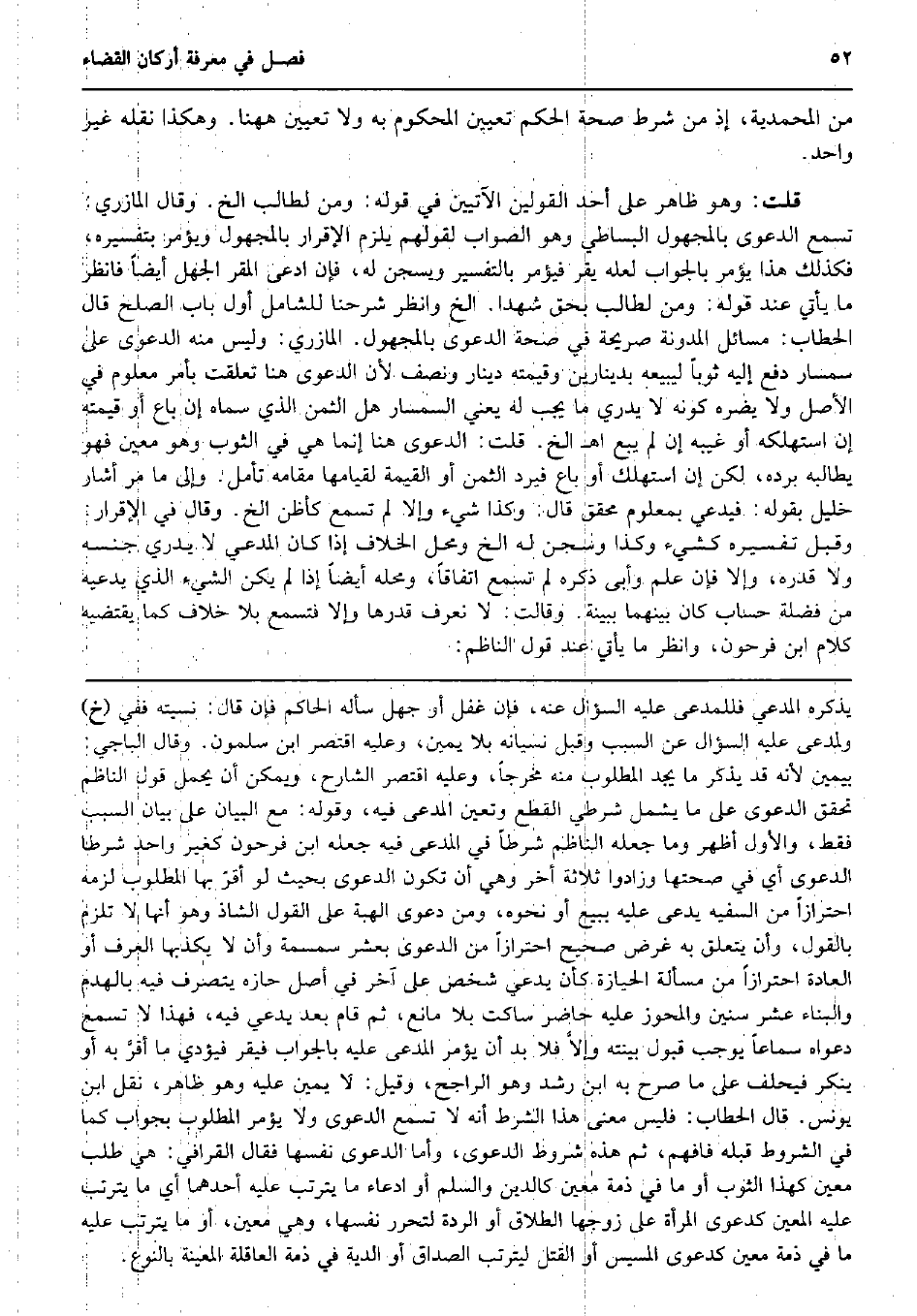 من المحمدية، إِذْ من شَرط صِحَة الحكم تعْيين الْمَحْكُوم بِهِ وَلَا تعْيين هَهُنَا. وَهَكَذَا نَقله غير وَاحِد. قلت: وَهُوَ ظَاهر على أحد الْقَوْلَيْنِ الآتيين فِي قَوْله: وَمن لطَالب الخ. وَقَالَ الْمَازرِيّ: تسمع الدَّعْوَى بِالْمَجْهُولِ الْبِسَاطِيّ وَهُوَ الصَّوَاب لقَولهم يلْزم الْإِقْرَار بِالْمَجْهُولِ وَيُؤمر بتفسيره، فَكَذَلِك هَذَا يُؤمر بِالْجَوَابِ لَعَلَّه يقر فَيُؤْمَر بالتفسير ويسجن لَهُ، فَإِن ادّعى الْمقر الْجَهْل أَيْضا فَانْظُر مَا يَأْتِي عِنْد قَوْله: وَمن لطَالب بِحَق شَهدا. الخ وَانْظُر شرحنا للشامل أول بَاب الصُّلْح قَالَ الْحطاب: مسَائِل الْمُدَوَّنَة صَرِيحَة فِي صِحَة الدَّعْوَى بِالْمَجْهُولِ. الْمَازرِيّ: وَلَيْسَ مِنْهُ الدَّعْوَى على سمسار دفع إِلَيْهِ ثوبا ليَبِيعهُ بدينارين وَقِيمَته دِينَار وَنصف لِأَن الدَّعْوَى هُنَا تعلّقت بِأَمْر مَعْلُوم فِي الأَصْل وَلَا يضرّهُ كَونه لَا يدْرِي مَا يجب لَهُ يَعْنِي السمسار هَل الثّمن الَّذِي سَمَّاهُ إِن بَاعَ أَو قِيمَته إِن اسْتَهْلكهُ أَو غيبه إِن لم يبع اه الخ. قلت: الدَّعْوَى هُنَا إِنَّمَا هِيَ فِي الثَّوْب وَهُوَ معِين فَهُوَ يُطَالِبهُ برده، لَكِن إِن اسْتهْلك أَو بَاعَ فَيرد الثّمن أَو الْقيمَة لقيامها مقَامه تَأمل. وَإِلَى مَا مر أَشَارَ خَلِيل بقوله: فيدعي بِمَعْلُوم مُحَقّق قَالَ: وَكَذَا شَيْء وَإِلَّا لم تسمع كأظن الخ. وَقَالَ فِي الْإِقْرَار: وَقبل تَفْسِيره كشيء وَكَذَا وسجن لَهُ الخ وَمحل الْخلاف إِذا كَانَ الْمُدَّعِي لَا يدْرِي جنسه وَلَا قدره، وَإِلَّا فَإِن علم وأبى ذكره لم تسمع اتِّفَاقًا، وَمحله أَيْضا إِذا لم يكن الشَّيْء الَّذِي يَدعِيهِ من فضلَة حِسَاب كَانَ بَينهمَا بِبَيِّنَة. وَقَالَت: لَا نَعْرِف قدرهَا وَإِلَّا فَتسمع بِلَا خلاف كَمَا يَقْتَضِيهِ كَلَام ابْن فَرِحُونَ، وَانْظُر مَا يَأْتِي عِنْد قَول النَّاظِم: