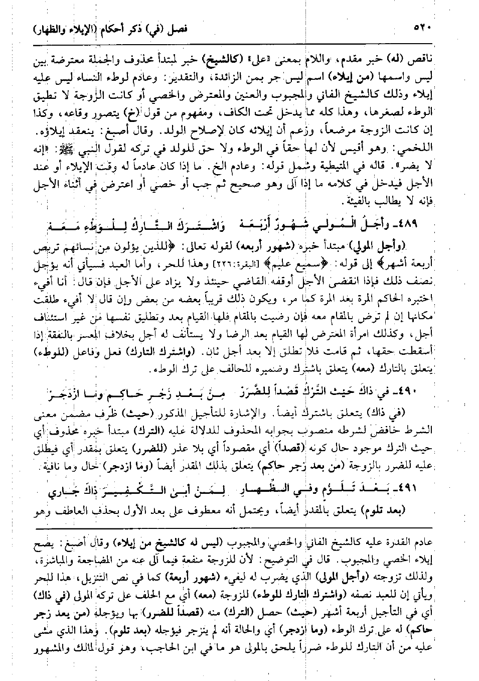 نَاقص (لَهُ) خبر مقدم، وَاللَّام بِمَعْنى (على) (كالشيخ) خبر لمبتدأ مَحْذُوف وَالْجُمْلَة مُعْتَرضَة بَين لَيْسَ وَاسْمهَا (من إِيلَاء) اسْم لَيْسَ جر بِمن الزَّائِدَة، وَالتَّقْدِير: وعادم لوطء النِّسَاء لَيْسَ عَلَيْهِ إِيلَاء وَذَلِكَ كالشيخ الفاني والمجبوب والعنين والمعترض والخصي أَو كَانَت الزَّوْجَة لَا تطِيق الْوَطْء لصغرها، وَهَذَا كُله مِمَّا يدْخل تَحت الْكَاف، وَمَفْهُوم من قَول (خَ) يتَصَوَّر وقاعه، وَكَذَا إِن كَانَت الزَّوْجَة مُرْضعًا، وَزعم أَن إيلائه كَانَ لإِصْلَاح الْوَلَد. وَقَالَ أصبغ: ينْعَقد إيلاؤه. اللَّخْمِيّ: وَهُوَ أَقيس لِأَن لَهَا حَقًا فِي الْوَطْء وَلَا حق للْوَلَد فِي تَركه لقَوْل النَّبِي صلى الله عَلَيْهِ وَسلم: (إِنَّه لَا يضر) . قَالَه فِي الْمُتَيْطِيَّة وَشَمل قَوْله: وعادم الخ. مَا إِذا كَانَ عادماً لَهُ وَقت الْإِيلَاء أَو عِنْد الْأَجَل فَيدْخل فِي كَلَامه مَا إِذا آلى وَهُوَ صَحِيح ثمَّ جب أَو خصي أَو اعْترض فِي أثْنَاء الْأَجَل فَإِنَّهُ لَا يُطَالب بالفيئة. وأجَلُ الْمُولي شَهُورٌ أَرْبَعَهْ وَاشْتَرَكَ التَّارِكُ لِلْوَطْءِ مَعَهْ (وَأجل الْمولي) مُبْتَدأ خَبره (شهور أَرْبَعه) لقَوْله تَعَالَى: للَّذين يؤلون من نِسَائِهِم تربص أَرْبَعَة أشهر} إِلَى قَوْله: سميع عليم} (الْبَقَرَة: 226) وَهَذَا للْحرّ، وَأما العَبْد فَسَيَأْتِي أَنه يُؤَجل نصف ذَلِك فَإِذا انْقَضى الْأَجَل أوقفهُ القَاضِي حِينَئِذٍ وَلَا يُزَاد على الْأَجَل فَإِن قَالَ: أَنا أفيء اختبره الْحَاكِم الْمرة بعد الْمرة كَمَا مر، وَيكون ذَلِك قَرِيبا بعضه من بعض وَإِن قَالَ لَا أفيء طلقت مَكَانهَا إِن لم ترض بالْمقَام مَعَه فَإِن رضيت بالْمقَام فلهَا الْقيام بعد وتطليق نَفسهَا من غير اسْتِئْنَاف أجل، وَكَذَلِكَ امْرَأَة الْمُعْتَرض لَهَا الْقيام بعد الرِّضَا وَلَا يسْتَأْنف لَهُ أجل بِخِلَاف الْمُعسر بِالنَّفَقَةِ إِذا أسقطت حَقّهَا، ثمَّ قَامَت فَلَا تطلق إِلَّا بعد أجل ثَان. (واشترك التارك) فعل وفاعل (للْوَطْء) يتَعَلَّق بالتارك (مَعَه) يتَعَلَّق باشترك وضميره للْحَالِف على ترك الْوَطْء. فِي ذاكَ حَيْث التَّرْكُ قَصْداً لِلضَّرَرْ مِنْ بَعْدِ زَجْرِ حَاكِمٍ وَمَا ازْدَجَرْ (فِي ذَاك) يتَعَلَّق باشترك أَيْضا. وَالْإِشَارَة للتأجيل الْمَذْكُور (حَيْثُ) ظرف مضمن معنى الشَّرْط خافض لشرطه مَنْصُوب بجوابه الْمَحْذُوف للدلالة عَلَيْهِ (التّرْك) مُبْتَدأ خَبره مَحْذُوف أَي حَيْثُ التّرْك مَوْجُود حَال كَونه (قصدا) أَي مَقْصُودا أَي بِلَا عذر (للضَّرَر) يتَعَلَّق بمقدر أَي فيطلق عَلَيْهِ للضَّرَر بِالزَّوْجَةِ (من بعد زجر حَاكم) يتَعَلَّق بذلك الْمُقدر أَيْضا (وَمَا ازدجر) حَال وَمَا نَافِيَة. بَعْدَ تَلَوُّمٍ وَفِي الظِّهارِ لِمَنْ أَبى صلى الله عَلَيْهِ وَسلم