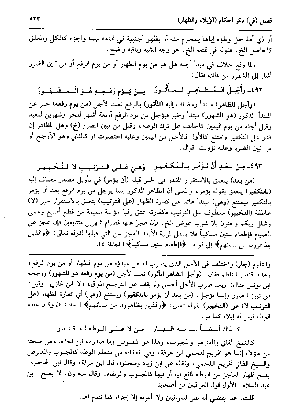 أَو ذِي أمة حل وَطْؤُهُ إِيَّاهَا بِمحرم مِنْهُ أَو بِظهْر أَجْنَبِيَّة فِي تمتعه بهما والجزء كالكل وَالْمُعَلّق كالحاصل الخ. فَقَوله فِي تمتعه الخ. هُوَ وَجه الشّبَه وَبَاقِيه وَاضح. وَلما وَقع خلاف فِي مبدأ أَجله هَل هُوَ من يَوْم الظِّهَار أَو من يَوْم الرّفْع أَو من تبين الضَّرَر أَشَارَ إِلَى الْمَشْهُور من ذَلِك فَقَالَ: وأَجَلُ المُظاهِرِ المَأْثُورُ مِنْ يَوْمِ رَفْعِهِ هُوَ الْمَشْهُورُ (وَأجل الْمظَاهر) مُبْتَدأ ومضاف إِلَيْهِ (الْمَأْثُور) بِالرَّفْع نعت لأجل (من يَوْم رَفعه) خبر عَن الْمُبْتَدَأ الْمَذْكُور (هُوَ الْمَشْهُور) مُبْتَدأ وَخبر فيؤجل من يَوْم الرّفْع أَرْبَعَة أشهر للْحرّ وشهرين للْعَبد وَقيل أَجله من يَوْم الْيَمين كالحالف على ترك الْوَطْء، وَقيل من تبين الضَّرَر (خَ) وَهل الْمظَاهر إِن قدر على التَّكْفِير وَامْتنع كَالْأولِ فالأجل من الْيَمين وَعَلِيهِ اختصرت أَو كالثاني وَهُوَ الْأَرْجَح أَو من تبين الضَّرَر وَعَلِيهِ تؤولت أَقْوَال. مِنْ بَعْدِ أَنْ يُؤْمَرَ بالتَّكْفِيرِ وَهْيَ عَلَى التَّرْتِيبِ لَا التَّخْيِيرِ (من بعد) يتَعَلَّق بالاستقرار الْمُقدر فِي الْخَبَر قبله (أَن يُؤمر) فِي تَأْوِيل مصدر مُضَاف إِلَيْهِ (بالتكفير) يتَعَلَّق بقوله يُؤمر وَالْمعْنَى أَن الْمظَاهر الْمَذْكُور إِنَّمَا يُؤَجل من يَوْم الرّفْع بعد أَن يُؤمر بالتكفير فَيمْتَنع (وَهِي) مُبْتَدأ عَائِد على كَفَّارَة الظِّهَار (على التَّرْتِيب) يتَعَلَّق بالاستقرار خبر (لَا) عاطفة (التَّخْيِير) مَعْطُوف على التَّرْتِيب فكفارته عتق رَقَبَة مُؤمنَة سليمَة من قطع أصْبع وعمى وشلل وبكم وجنون بِلَا شوب عوض الخ. فَإِن عجز عَنْهَا فَصِيَام شَهْرَيْن مُتَتَابعين فَإِن عجز عَن الصّيام فإطعام سِتِّينَ مِسْكينا فَلَا ينْتَقل لمرتبة الْأَبْعَد الْعَجز عَن الَّتِي قبلهَا لقَوْله تَعَالَى: وَالَّذين يظاهرون من نِسَائِهِم} إِلَى قَوْله: فإطعام سِتِّينَ مِسْكينا} (المجادلة: 4) .