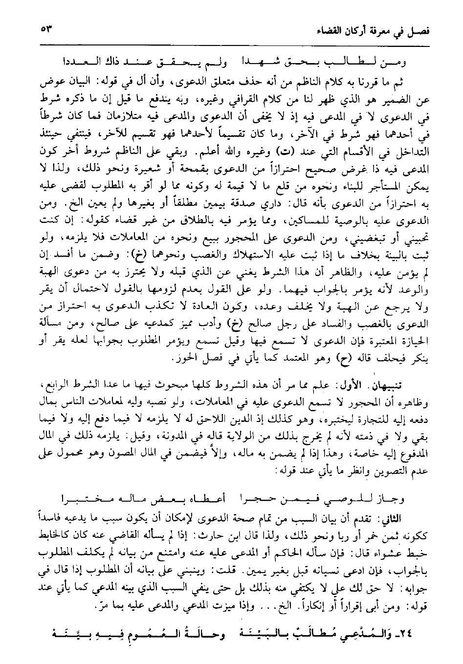 وَمن لطَالب بِحَق شَهدا وَلم يُحَقّق عِنْد ذَاك العددا ثمَّ مَا قَررنَا بِهِ كَلَام النَّاظِم من أَنه حذف مُتَعَلق الدَّعْوَى وَأَن أل فِي قَوْله: الْبَيَان عوض عَن الضَّمِير هُوَ الَّذِي ظهر لنا من كَلَام الْقَرَافِيّ وَغَيره، وَبِه ينْدَفع مَا قيل إِن مَا ذكره شَرط فِي الدَّعْوَى لَا فِي الْمُدعى فِيهِ إِذْ لَا يخفى أَن الدَّعْوَى وَالْمُدَّعى فِيهِ متلازمان فَمَا كَانَ شرطا فِي أَحدهمَا فَهُوَ شَرط فِي الآخر، وَمَا كَانَ تقسيماً لأَحَدهمَا فَهُوَ تَقْسِيم للْآخر، فَيَنْتَفِي حِينَئِذٍ التَّدَاخُل فِي الْأَقْسَام الَّتِي عِنْد (ت) وَغَيره وَالله أعلم. وَبَقِي على النَّاظِم شُرُوط أخر كَون الْمُدعى فِيهِ ذَا غَرَض صَحِيح احْتِرَازًا من الدَّعْوَى بقمحة أَو شعيرَة وَنَحْو ذَلِك، وَلذَا لَا يُمكن الْمُسْتَأْجر للْبِنَاء وَنَحْوه من قلع مَا لَا قيمَة لَهُ وَكَونه مِمَّا لَو أقرّ بِهِ الْمَطْلُوب لقضى عَلَيْهِ بِهِ احْتِرَازًا من الدَّعْوَى بِأَنَّهُ قَالَ: دَاري صَدَقَة بِيَمِين مُطلقًا أَو بغَيْرهَا وَلم يعين الخ. وَمن الدَّعْوَى عَلَيْهِ بِالْوَصِيَّةِ للْمَسَاكِين، وَمِمَّا يُؤمر فِيهِ بِالطَّلَاق من غير قَضَاء كَقَوْلِه: إِن كنت تحبيني أَو تبغضيني، وَمن الدَّعْوَى على الْمَحْجُور بِبيع وَنَحْوه من الْمُعَامَلَات فَلَا يلْزمه، وَلَو ثَبت بِالْبَيِّنَةِ بِخِلَاف مَا إِذا ثَبت عَلَيْهِ الِاسْتِهْلَاك وَالْغَصْب وَنَحْوهمَا (خَ) : وَضمن مَا أفسد إِن لم يُؤمن عَلَيْهِ، وَالظَّاهِر أَن هَذَا الشَّرْط يُغني عَن الَّذِي قبله وَلَا يحْتَرز بِهِ من دَعْوَى الْهِبَة والوعد لِأَنَّهُ يُؤمر بِالْجَوَابِ فيهمَا. وَلَو على القَوْل بِعَدَمِ لُزُومهَا بالْقَوْل لاحْتِمَال أَن يقر وَلَا يرجع عَن الْهِبَة وَلَا يخلف وعده، وَكَون الْعَادة لَا تكذب الدَّعْوَى بِهِ احْتِرَاز من الدَّعْوَى بِالْغَصْبِ وَالْفساد على رجل صَالح (خَ) وأدب مُمَيّز كمدعيه على صَالح، وَمن مَسْأَلَة الْحِيَازَة الْمُعْتَبرَة فَإِن الدَّعْوَى لَا تسمع فِيهَا وَقيل تسمع وَيُؤمر الْمَطْلُوب بجوابها لَعَلَّه يقر أَو يُنكر فَيحلف قَالَه (ح) وَهُوَ الْمُعْتَمد كَمَا يَأْتِي فِي فصل الْحَوْز. تَنْبِيهَانِ. الأول: علم مِمَّا مر أَن هَذِه الشُّرُوط كلهَا مبحوث فِيهَا مَا عدا الشَّرْط الرَّابِع، وَظَاهره أَن الْمَحْجُور لَا تسمع الدَّعْوَى عَلَيْهِ فِي الْمُعَامَلَات، وَلَو نَصبه وليه لمعاملات النَّاس بِمَال دَفعه إِلَيْهِ للتِّجَارَة ليختبره، وَهُوَ كَذَلِك إِذْ الدّين اللَّاحِق لَهُ لَا يلْزمه لَا فِيمَا دفع إِلَيْهِ وَلَا فِيمَا بَقِي وَلَا فِي ذمَّته لِأَنَّهُ لم يخرج بذلك من الْولَايَة قَالَه فِي الْمُدَوَّنَة، وَقيل: يلْزمه ذَلِك فِي المَال الْمَدْفُوع إِلَيْهِ خَاصَّة، وَهَذَا إِذا لم يضمن بِهِ مَاله، وإلاَّ فَيضمن فِي المَال المصون وَهُوَ مَحْمُول على عدم التصوين وَانْظُر مَا يَأْتِي عِنْد قَوْله: وَجَاز للْوَصِيّ فِيمَن حجرا أعطَاهُ بعض مَاله مختبرا الثَّانِي: تقدم أَن بَيَان السَّبَب من تَمام صِحَة الدَّعْوَى لِإِمْكَان أَن يكون سَبَب مَا يَدعِيهِ فَاسِدا كَكَوْنِهِ ثمن خمر أَو رَبًّا وَنَحْو ذَلِك، وَلذَا قَالَ ابْن حَارِث: إِذا لم يسْأَله القَاضِي عَنهُ كَانَ كالخابط خبط عشواء قَالَ: فَإِن سَأَلَهُ الْحَاكِم أَو الْمُدعى عَلَيْهِ عَنهُ وَامْتنع من بَيَانه لم يُكَلف الْمَطْلُوب بِالْجَوَابِ، فَإِن ادّعى نسيانه قبل بِغَيْر يَمِين. قلت: وَيَنْبَنِي على بَيَانه أَن الْمَطْلُوب إِذا قَالَ فِي جَوَابه: لَا حق لَك عَليّ لَا يَكْتَفِي مِنْهُ بذلك بل حَتَّى يَنْفِي السَّبَب الَّذِي بَينه الْمُدَّعِي كَمَا يَأْتِي عِنْد قَوْله: وَمن أَبى إِقْرَارا أَو إنكاراً. الخ ... وَإِذا ميزت الْمُدَّعِي وَالْمُدَّعى عَلَيْهِ بِمَا مرّ. وَالمُدَّعِي مُطالَب