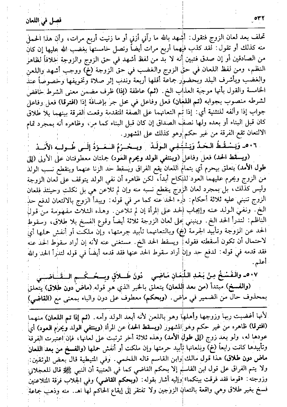 تحلف بعد لعان الزَّوْج فَتَقول: أشهد بِاللَّه مَا رَآنِي أزني أَو مَا زَنَيْت أَربع مَرَّات، وَأَن هَذَا الْحمل مِنْهُ كَذَلِك أَو تَقول: لقد كذب فيهمَا أَربع مَرَّات أَيْضا وَتصل خامستها بغضب الله عَلَيْهَا إِن كَانَ من الصَّادِقين أَو إِن صدق فَتبين أَنه لَا بُد من لفظ أشهد فِي حق الزَّوْج وَالزَّوْجَة خلافًا لظَاهِر النّظم، وَمن لفظ اللّعان فِي حق الزَّوْج وَالْغَضَب فِي حق الزَّوْجَة (خَ) وَوَجَب أشهد واللعن وَالْغَضَب وبأشرف الْبَلَد وبحضور جمَاعَة أقلهَا أَرْبَعَة وَندب إِثْر صَلَاة وتخويفها وخصوصاً عِنْد الْخَامِسَة وَالْقَوْل بِأَنَّهَا مُوجبَة الْعَذَاب الخ. (ثمَّ) عاطفة (إِذا) ظرف مضمن معنى الشَّرْط خافض لشرطه مَنْصُوب بجوابه (تمّ اللّعان) فعل وفاعل فِي مَحل جر بِإِضَافَة إِذا (افْتَرقَا) فعل وفاعل جَوَاب إِذا وألفه للتثنية أَي: إِذا تمّ التعانهما على الصّفة الْمُتَقَدّمَة وَقعت الْفرْقَة بَينهمَا بِلَا طَلَاق كَانَ قبل الْبناء أَو بعده وَلها نصف الصَدَاق إِن كَانَ قبل الْبناء كَمَا مر، وَظَاهره أَنه بِمُجَرَّد تَمام الالتعان تقع الْفرْقَة من غير حكم وَهُوَ كَذَلِك على الْمَشْهُور. وَيَسْقُطُ الحَدُّ وَيَنْتَفِي الولَدْ ويحْرُمُ العَوْدُ إلَى طُوله الأَمَدْ (وَيسْقط الْحَد) فعل وفاعل (وينتفي الْوَلَد وَيحرم الْعود) جملتان معطوفتان على الأولى (إِلَى طول الأمد) يتَعَلَّق بيحرم أَي بِتمَام اللّعان يَقع الْفِرَاق وَيسْقط حد الزِّنَا عَنْهُمَا وَيَنْقَطِع نسب الْوَلَد من الزَّوْج وَيحرم عَلَيْهِمَا الْعود للنِّكَاح أبدا، لَكِن ظَاهره أَن نفي الْوَلَد يتَوَقَّف على لعان الزَّوْجَة وَلَيْسَ كَذَلِك، بل بِمُجَرَّد لعان الزَّوْج يَنْقَطِع نسبه مِنْهُ وَإِن لم تلاعن هِيَ بل نكلت وَحِينَئِذٍ فلعان الزَّوْج تنبني عَلَيْهِ ثَلَاثَة أَحْكَام: دَرْء الْحَد عَنهُ كَمَا مر فِي قَوْله: وَيبدأ الزَّوْج بالالتعان لدفع حد الخ. وَنفي الْوَلَد عَنهُ وَإِيجَاب الْحَد على الْمَرْأَة إِن لم تلاعن. وَهَذِه الثَّلَاث مفهومة من قَول النَّاظِم: لتدرأ الْحَد الخ. وَيَنْبَنِي على لعان الزَّوْجَة ثَلَاثَة أَيْضا وُقُوع الْفَسْخ بِلَا طَلَاق، وَسُقُوط الْحَد عَن الزَّوْجَة وتأبيد الجرمة (خَ) وبالتعانهما تأبيد جرمتها، وَإِن ملكت أَو أنفش حملهَا أَي لاحْتِمَال أَن تكون أسقطته فَقَوله: وَيسْقط الْحَد الخ. مُسْتَغْنى عَنهُ لِأَنَّهُ إِن أَرَادَ سُقُوط الْحَد عَنهُ فقد قدمه فِي قَوْله: لدفع حد وَإِن أَرَادَ سُقُوط الْحَد عَنْهَا فقد قدمه أَيْضا فِي قَوْله لتدرأ الْحَد وَالله أعلم. والفَسْخُ مِنْ بَعْدِ اللِّعَانِ مَاضِي دُونَ طَلاَقٍ وبِحُكْمِ القَاضي (وَالْفَسْخ) مُبْتَدأ (من بعد اللّعان) يتَعَلَّق بالْخبر الَّذِي هُوَ قَوْله (مَاض دون طَلَاق) يتَعَلَّق بِمَحْذُوف حَال من الضَّمِير فِي مَاض. (وبحكم) مَعْطُوف على دون وَالْبَاء بِمَعْنى مَعَ (القَاضِي)