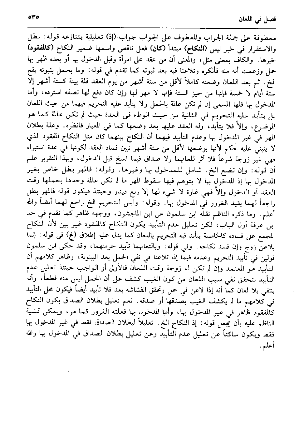 معطوفة على جملَة الْجَواب والمعطوف على الْجَواب جَوَاب (إِذْ) تعليلية يتنازعه قَوْله: بَطل والاستقرار فِي خبر لَيْسَ (النِّكَاح) مُبْتَدأ (كَانَ) فعل نَاقص وَاسْمهَا ضمير النِّكَاح (كالمفقود) خَبَرهَا. وَالْكَاف بِمَعْنى مثل، وَالْمعْنَى أَن من عقد على امْرَأَة وَقبل الدُّخُول بهَا أَو بعده ظهر بهَا حمل وَزَعَمت أَنه مِنْهُ فَأنكرهُ وتلاعنا فِيهِ بعد ثُبُوته كَمَا تقدم فِي قَوْله: وَمَا بِحمْل بِثُبُوتِهِ يَقع الخ. ثمَّ بعد اللّعان وَضعته كَامِلا لأَقل من سِتَّة أشهر من يَوْم العقد قلَّة بَيِّنَة كستة أشهر إِلَّا سِتَّة أَيَّام لَا خَمْسَة فَإِنَّهَا من حيّز السِّتَّة فَإِنَّهَا لَا مهر لَهَا وَإِن كَانَ دفع لَهَا نصفه استرده، وَأما الْمَدْخُول بهَا فلهَا الْمُسَمّى إِن لم تكن عَالِمَة بِالْحملِ وَلَا يتأبد عَلَيْهِ التَّحْرِيم فيهمَا من حَيْثُ اللّعان بل يتأبد عَلَيْهِ التَّحْرِيم فِي الثَّانِيَة من حَيْثُ الْوَطْء فِي الْعدة حَيْثُ لم تكن عَالِمَة كَمَا هُوَ الْمَوْضُوع، وإلاَّ فَلَا يتأبد، وَله العقد عَلَيْهَا بعد وَضعهَا كَمَا فِي المعيار فَانْظُرْهُ. وَعلة بطلَان الْمهْر فِي غير الْمَدْخُول بهَا وَعدم التَّأْبِيد فيهمَا أَن النِّكَاح بَينهمَا كَانَ مثل النِّكَاح الْمَفْقُود الَّذِي لَا يَنْبَنِي عَلَيْهِ حكم لِأَنَّهَا بوضعها لأَقل من سِتَّة أشهر تبين فَسَاد العقد لكَونهَا فِي عدَّة اسْتِبْرَاء فَهِيَ غير زَوْجَة شرعا فَلَا أثر للعانهما وَلَا صدَاق فِيمَا فسخ قبل الدُّخُول، وَبِهَذَا التَّقْرِير علم أَن قَوْله: وَإِن تضع الخ. شَامِل للمدخول بهَا وَغَيرهَا. وَقَوله: فالمهر بَطل خَاص بِغَيْر الْمَدْخُول بهَا إِذْ الْمَدْخُول بهَا لَا يتَوَهَّم فِيهَا سُقُوط الْمهْر مَا لم تكن عَالِمَة وَحدهَا بحملها وَقت العقد أَو الدُّخُول وإلاَّ فَهِيَ غَارة لَا شَيْء لَهَا إِلَّا ربع دِينَار وَحِينَئِذٍ فَيكون قَوْله فالمهر بَطل رَاجعا لَهما بِقَيْد الْغرُور فِي الْمَدْخُول بهَا. وَقَوله: وَلَيْسَ للتَّحْرِيم الخ رَاجع لَهما أَيْضا وَالله أعلم. وَمَا ذكره النَّاظِم نَقله ابْن سَلمُون عَن ابْن الْمَاجشون، وَوَجهه ظَاهر كَمَا تقدم فِي حد ابْن عَرَفَة أول الْبَاب، لَكِن تَعْلِيل عدم التَّأْبِيد يكون النِّكَاح كالمفقود غير بَين لِأَن النِّكَاح الْمجمع على فَسَاده كالخامسة يتأبد فِيهِ التَّحْرِيم بِاللّعانِ كَمَا يدل عَلَيْهِ إِطْلَاق (خَ) فِي قَوْله: إِنَّمَا يُلَاعن زوج وَإِن فسد نِكَاحه. وَفِي قَوْله: وبالتعانهما تأبيد حرمتهما، وَقد حكى ابْن سَلمُون قَوْلَيْنِ فِي تأبيد التَّحْرِيم وَعَدَمه فِيمَا إِذا تلاعنا فِي نفي الْحمل بعد الْبَيْنُونَة، وَظَاهر كَلَامهم أَن التَّأْبِيد هُوَ الْمُعْتَمد وَإِن لم تكن لَهُ زَوْجَة وَقت اللّعان فَالْأولى أَو الْوَاجِب حِينَئِذٍ تَعْلِيل عدم التَّأْبِيد بتحقق نفي سَبَب اللّعان من كَون الْغَيْب كشف على أَن الْحمل لَيْسَ مِنْهُ قطعا، وَأَنه يَنْتَفِي بِلَا لعان كَمَا أَنه إِذا لَاعن فِي حمل وَتحقّق انفشاشه بعد فَلَا تأبيد أَيْضا فَيكون مَحل التَّأْبِيد فِي كَلَامهم مَا لم يكْشف الْغَيْب بصدقها أَو صدقه. نعم تَعْلِيل بطلَان الصَدَاق بِكَوْن النِّكَاح كالمفقود ظَاهر فِي غير الْمَدْخُول بهَا، وَأما الْمَدْخُول بهَا فعلته الْغرُور كَمَا مر، وَيُمكن تمشية النَّاظِم عَلَيْهِ بِأَن يَجْعَل قَوْله: إِذْ النِّكَاح الخ. تعليلاً لبُطْلَان الصَدَاق فَقَط فِي غير الْمَدْخُول بهَا فَقَط وَيكون ساكتاً عَن تَعْلِيل عدم التَّأْبِيد وَعَن تَعْلِيل بطلَان الصَدَاق فِي الْمَدْخُول بهَا وَالله أعلم.
