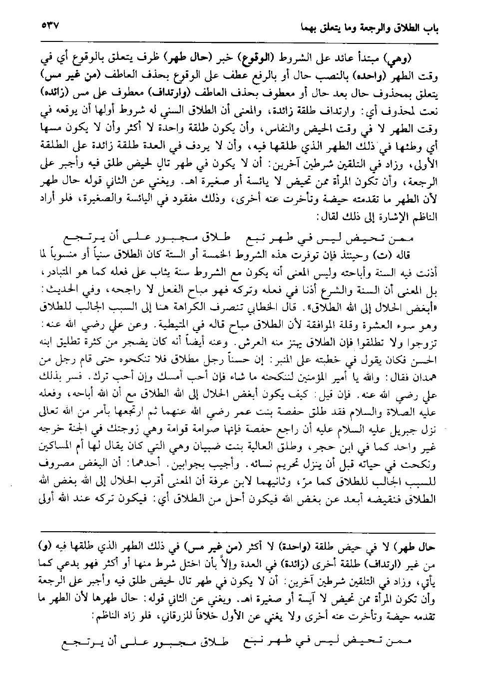 (وَهِي) مُبْتَدأ عَائِد على الشُّرُوط (الْوُقُوع) خبر (حَال طهر) ظرف يتَعَلَّق بالوقوع أَي فِي وَقت الطُّهْر (واحده) بِالنّصب حَال أَو بِالرَّفْع عطف على الْوُقُوع بِحَذْف العاطف (من غير مس) يتَعَلَّق بِمَحْذُوف حَال بعد حَال أَو مَعْطُوف بِحَذْف العاطف (وارتداف) مَعْطُوف على مس (زائده) نعت لمَحْذُوف أَي: وارتداف طَلْقَة زَائِدَة، وَالْمعْنَى أَن الطَّلَاق السّني لَهُ شُرُوط أَولهَا أَن يوقعه فِي وَقت الطُّهْر لَا فِي وَقت الْحيض وَالنّفاس، وَأَن يكون طَلْقَة وَاحِدَة لَا أَكثر وَأَن لَا يكون مَسهَا أَي وَطئهَا فِي ذَلِك الطُّهْر الَّذِي طَلقهَا فِيهِ، وَأَن لَا يردف فِي الْعدة طَلْقَة زَائِدَة على الطَّلقَة الأولى، وَزَاد فِي التَّلْقِين شرطين آخَرين: أَن لَا يكون فِي طهر تالٍ لحيض طلق فِيهِ وأجبر على الرّجْعَة، وَأَن تكون الْمَرْأَة مِمَّن تحيض لَا يائسة أَو صَغِيرَة اه. ويغني عَن الثَّانِي قَوْله حَال طهر لِأَن الطُّهْر مَا تقدمته حَيْضَة وتأخرت عَنهُ أُخْرَى، وَذَلِكَ مَفْقُود فِي اليائسة وَالصَّغِيرَة، فَلَو أَرَادَ النَّاظِم الْإِشَارَة إِلَى ذَلِك لقَالَ: مِمَّن تحيض لَيْسَ فِي طهر تبع طَلَاق مجبور على أَن يرتجع قَالَه (ت) وَحِينَئِذٍ فَإِن توفرت هَذِه الشُّرُوط الْخَمْسَة أَو السِّتَّة كَانَ الطَّلَاق سنياً أَو مَنْسُوبا لما أَذِنت فِيهِ السّنة وأباحته وَلَيْسَ الْمَعْنى أَنه يكون مَعَ الشُّرُوط سنة يُثَاب على فعله كَمَا هُوَ الْمُتَبَادر، بل الْمَعْنى أَن السّنة وَالشَّرْع أذنا فِي فعله وَتَركه فَهُوَ مُبَاح الْفِعْل لَا راجحه وَفِي الحَدِيث: (أبْغض الْحَلَال إِلَى الله الطَّلَاق) . قَالَ الْخطابِيّ تَنْصَرِف الْكَرَاهَة هُنَا إِلَى السَّبَب الجالب للطَّلَاق وَهُوَ سوء الْعشْرَة وَقلة الْمُوَافقَة لِأَن الطَّلَاق مُبَاح قَالَه فِي الْمُتَيْطِيَّة. وَعَن عَليّ رَضِي الله عَنهُ: تزوجوا وَلَا تطلقوا فَإِن الطَّلَاق يَهْتَز مِنْهُ الْعَرْش. وَعنهُ أَيْضا أَنه كَانَ يضجر من كَثْرَة تطليق ابْنه الْحسن فَكَانَ يَقُول فِي خطبَته على الْمِنْبَر: إِن حسنا رجل مطلاق فَلَا تنكحوه حَتَّى قَامَ رجل من هَمدَان فَقَالَ: وَالله يَا أَمِير الْمُؤمنِينَ لننكحنه مَا شَاءَ فَإِن أحب أمسك وَإِن أحب ترك. فسر بذلك عَليّ رَضِي الله عَنهُ. فَإِن قيل: كَيفَ يكون أبْغض الْحَلَال إِلَى الله الطَّلَاق مَعَ أَن الله أَبَاحَهُ، وَفعله عَلَيْهِ الصَّلَاة وَالسَّلَام فقد طلق حَفْصَة بنت عمر رَضِي الله عَنْهُمَا ثمَّ ارتجعها بِأَمْر من الله تَعَالَى نزل جِبْرِيل عَلَيْهِ السَّلَام عَلَيْهِ أَن رَاجع حَفْصَة فَإِنَّهَا صَوَّامَة قَوَّامَة وَهِي زَوجتك فِي الْجنَّة خرجه غير وَاحِد كَمَا فِي ابْن حجر، وطلق الْعَالِيَة بنت ضبيان وَهِي الَّتِي كَانَ يُقَال لَهَا أم الْمَسَاكِين ونكحت فِي حَيَاته قبل أَن ينزل تَحْرِيم نِسَائِهِ. وَأجِيب بجوابين. أَحدهمَا: أَن البغض مَصْرُوف للسبب الجالب للطَّلَاق كَمَا مرّ، وَثَانِيهمَا لِابْنِ عَرَفَة أَن الْمَعْنى أقرب الْحَلَال إِلَى الله بغض الله الطَّلَاق فنقيضه أبعد عَن بغض الله فَيكون أحل من الطَّلَاق أَي: فَيكون تَركه عِنْد الله أولى