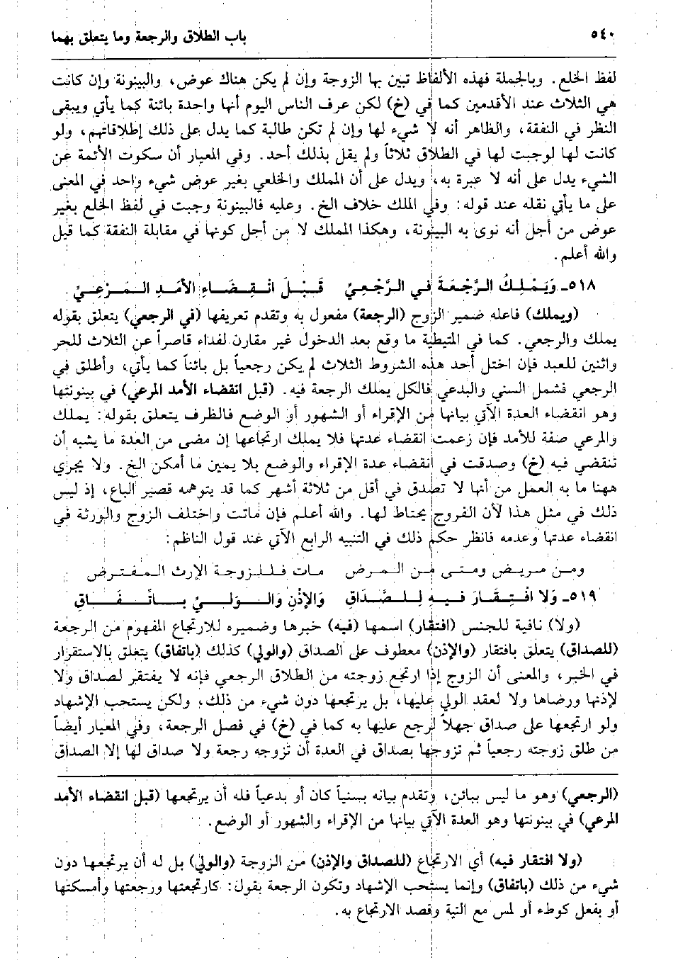 لفظ الْخلْع. وَبِالْجُمْلَةِ فَهَذِهِ الْأَلْفَاظ تبين بهَا الزَّوْجَة وَإِن لم يكن هُنَاكَ عوض، والبينونة وَإِن كَانَت هِيَ الثَّلَاث عِنْد الأقدمين كَمَا فِي (خَ) لَكِن عرف النَّاس الْيَوْم أَنَّهَا وَاحِدَة بَائِنَة كَمَا يَأْتِي وَيبقى النّظر فِي النَّفَقَة، وَالظَّاهِر أَنه لَا شَيْء لَهَا وَإِن لم تكن طالبة كَمَا يدل على ذَلِك إطلاقاتهم، وَلَو كَانَت لَهَا لَوَجَبَتْ لَهَا فِي الطَّلَاق ثَلَاثًا وَلم يقل بذلك أحد. وَفِي المعيار أَن سكُوت الْأَئِمَّة عَن الشَّيْء يدل على أَنه لَا عِبْرَة بِهِ، وَيدل على أَن المملك والخلعي بِغَيْر عوض شَيْء وَاحِد فِي الْمَعْنى على مَا يَأْتِي نَقله عِنْد قَوْله: وَفِي الْملك خلاف الخ. وَعَلِيهِ فالبينونة وَجَبت فِي لفظ الْخلْع بِغَيْر عوض من أجل أَنه نوى بِهِ الْبَيْنُونَة، وَهَكَذَا المملك لَا من أجل كَونهَا فِي مُقَابلَة النَّفَقَة كَمَا قيل وَالله أعلم. وَيَمْلِكُ الرَّجْعَةَ فِي الرَّجْعِيِّ قَبْلَ انْقِضَاءِ الأمَدِ المَرْعِيِّ (وَيملك) فَاعله ضمير الزَّوْج (الرّجْعَة) مفعول بِهِ وَتقدم تَعْرِيفهَا (فِي الرَّجْعِيّ) يتَعَلَّق بقوله يملك والرجعي. كَمَا فِي الْمُتَيْطِيَّة مَا وَقع بعد الدُّخُول غير مُقَارن لفداء قاصراً عَن الثَّلَاث للْحرّ واثنين للْعَبد فَإِن اخْتَلَّ أحد هَذِه الشُّرُوط الثَّلَاث لم يكن رَجْعِيًا بل بَائِنا كَمَا يَأْتِي، وَأطلق فِي الرَّجْعِيّ فَشَمَلَ السّني والبدعي فَالْكل يملك الرّجْعَة فِيهِ. (قبل انْقِضَاء الأمد المرعي) فِي بينونتها وَهُوَ انْقِضَاء الْعدة الْآتِي بَيَانهَا من الإقراء أَو الشُّهُور أَو الْوَضع فالظرف يتَعَلَّق بقوله: يملك والمرعي صفة للأمد فَإِن زعمت انْقِضَاء عدتهَا فَلَا يملك ارتجاعها إِن مضى من الْعدة مَا يشبه أَن تَنْقَضِي فِيهِ (خَ) وصدقت فِي انْقِضَاء عدَّة الإقراء والوضع بِلَا يَمِين مَا أمكن الخ. وَلَا يجْرِي هَهُنَا مَا بِهِ الْعَمَل من أَنَّهَا لَا تصدق فِي أقل من ثَلَاثَة أشهر كَمَا قد يتوهمه قصير الباع، إِذْ لَيْسَ ذَلِك فِي مثل هَذَا لِأَن الْفروج يحْتَاط لَهَا. وَالله أعلم فَإِن مَاتَت وَاخْتلف الزَّوْج وَالْوَرَثَة فِي انْقِضَاء عدتهَا وَعَدَمه فَانْظُر حكم ذَلِك فِي التَّنْبِيه الرَّابِع الْآتِي عِنْد قَول النَّاظِم: وَمن مَرِيض وَمَتى من الْمَرَض مَاتَ فللزوجة الْإِرْث المفترض وَلا افْتِقَارَ فيهِ لِلصَّدَاقِ وَالإذْنِ وَالوَليِّ باتِّفَاقِ (وَلَا) نَافِيَة للْجِنْس (افتقار) اسْمهَا (فِيهِ) خَبَرهَا وضميره للارتجاع الْمَفْهُوم من الرّجْعَة (للصداق) يتَعَلَّق بافتقار (وَالْإِذْن) مَعْطُوف على الصَدَاق (وَالْوَلِيّ) كَذَلِك (بِاتِّفَاق) يتَعَلَّق بالاستقرار فِي الْخَبَر، وَالْمعْنَى أَن الزَّوْج إِذا ارتجع زَوجته من الطَّلَاق الرَّجْعِيّ فَإِنَّهُ لَا يفْتَقر لصداق وَلَا لإذنها ورضاها وَلَا لعقد الْوَلِيّ عَلَيْهَا، بل يرتجعها دون شَيْء من ذَلِك، وَلَكِن يسْتَحبّ الْإِشْهَاد وَلَو ارتجعها على صدَاق جهلا لرجع عَلَيْهَا بِهِ كَمَا فِي (خَ) فِي فصل الرّجْعَة، وَفِي المعيار أَيْضا من طلق زَوجته رَجْعِيًا ثمَّ تزَوجهَا بِصَدَاق فِي الْعدة أَن تزَوجه رَجْعَة وَلَا صدَاق لَهَا إِلَّا الصَدَاق